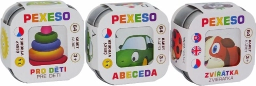 Pexeso è uno dei giochi per bambini più amati, che inoltre aiuta nello sviluppo dei bambini. Questo set include tre diversi pexeso in scatole di latta, focalizzati sull'alfabeto, animali con l'inglese e giochi per bambini.
