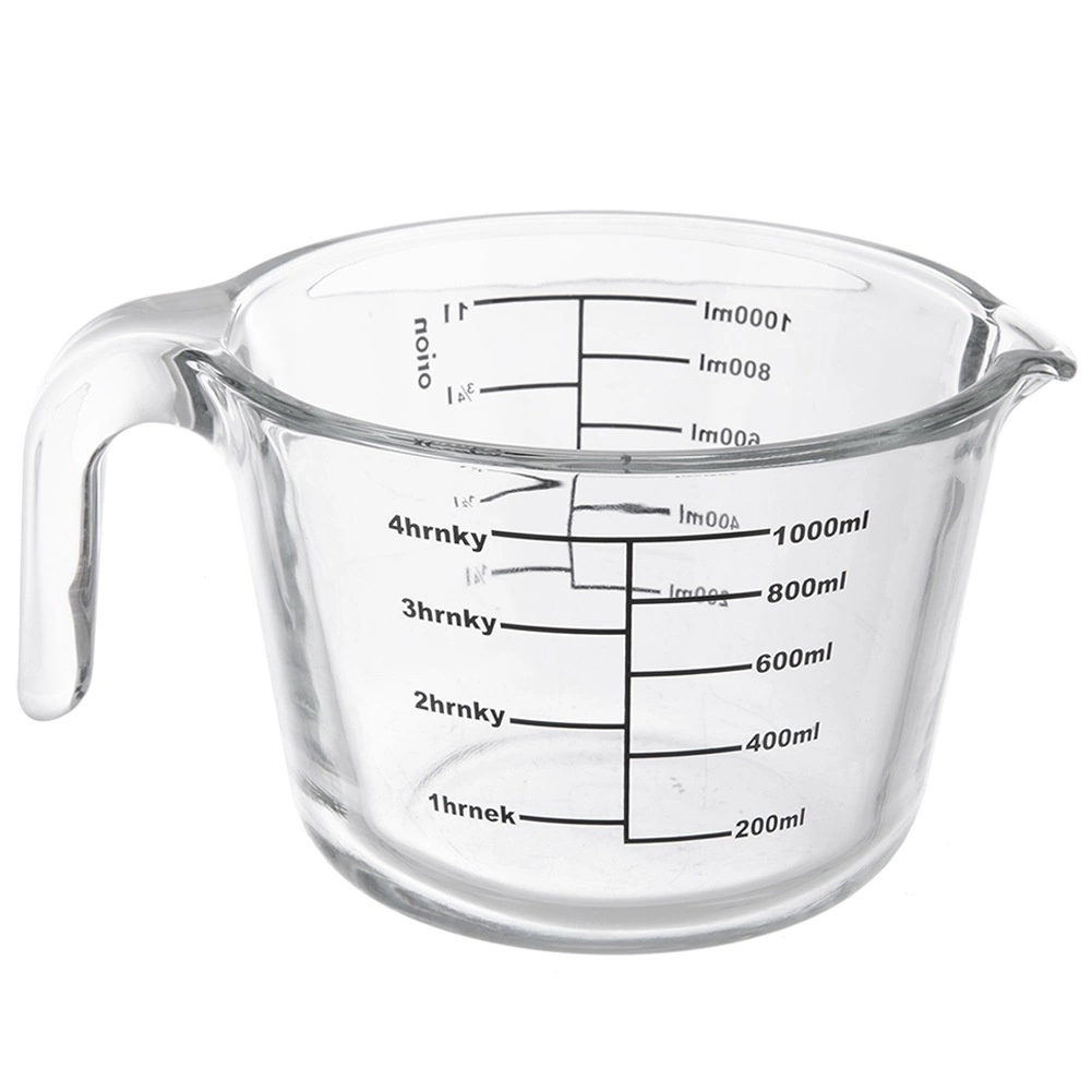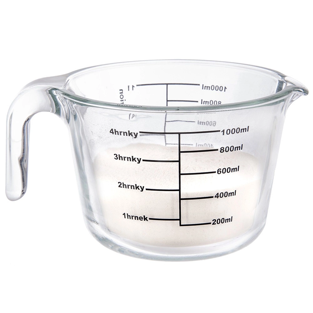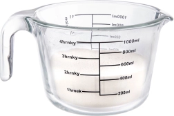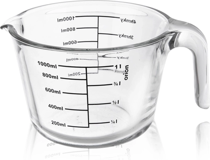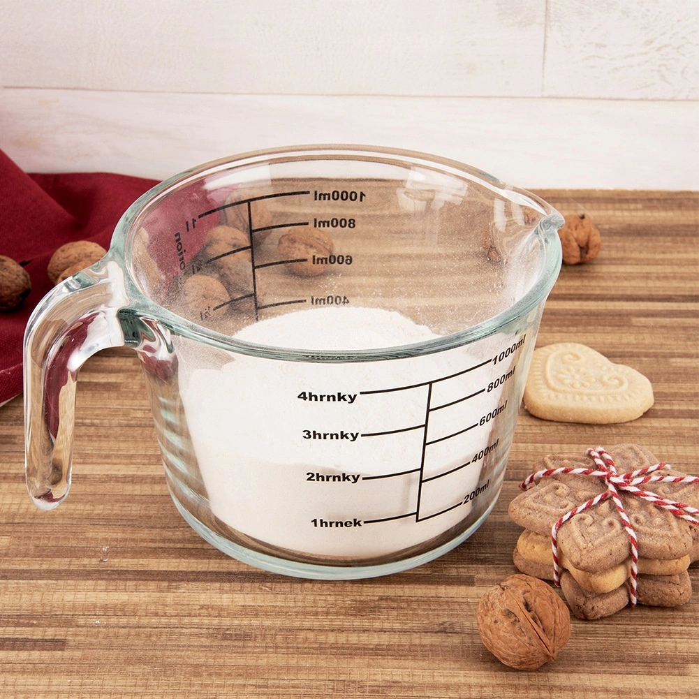 Il misurino misura in millilitri da 200 a 1000 ml (a intervalli di 200 ml), in litri da 1/4 l a 1 l e in tazze da 1 a 4. Il resistente vetro borosilicato sopporta forti sbalzi di temperatura, quindi puoi mettere il misurino in frigorifero, nel microonde e in forno.