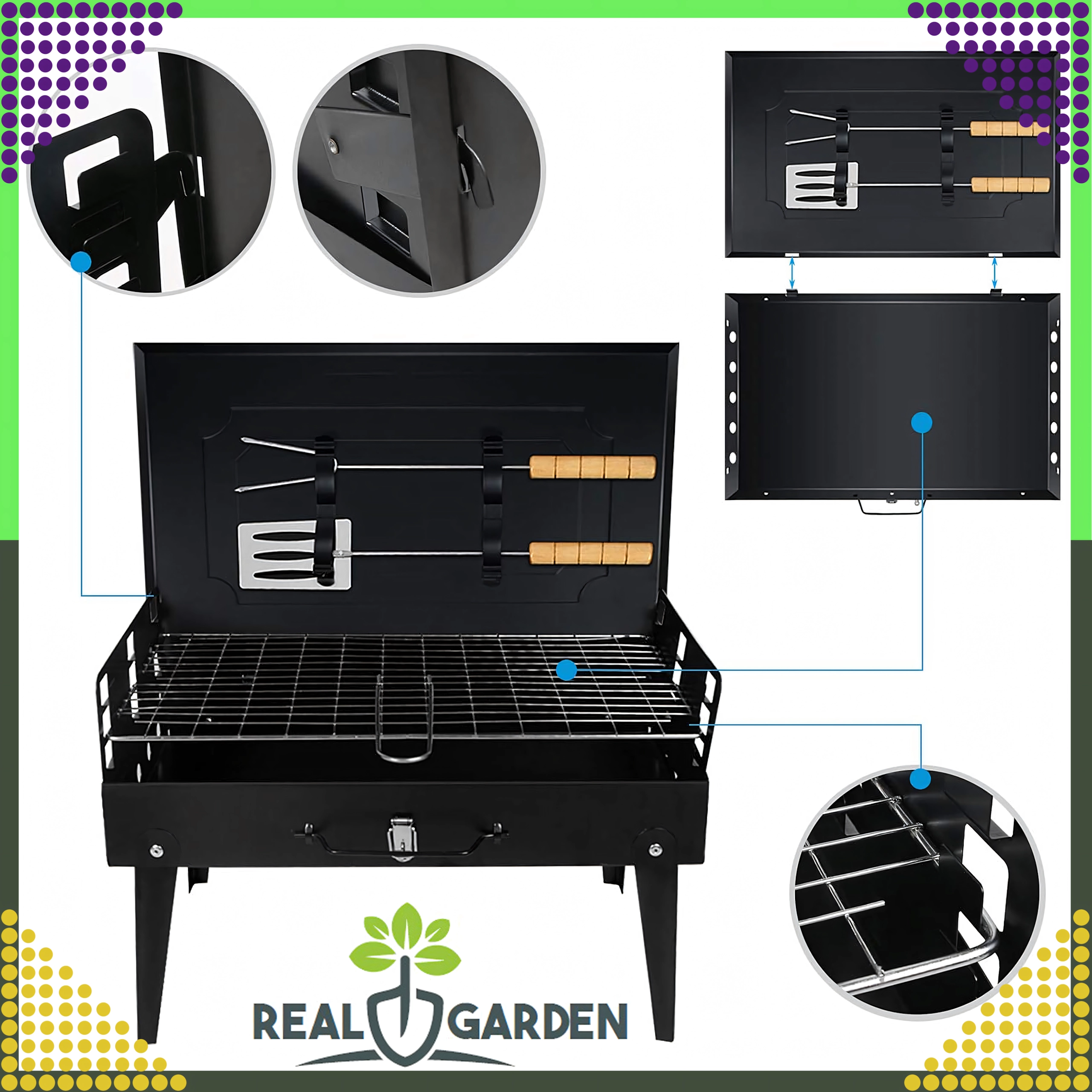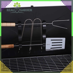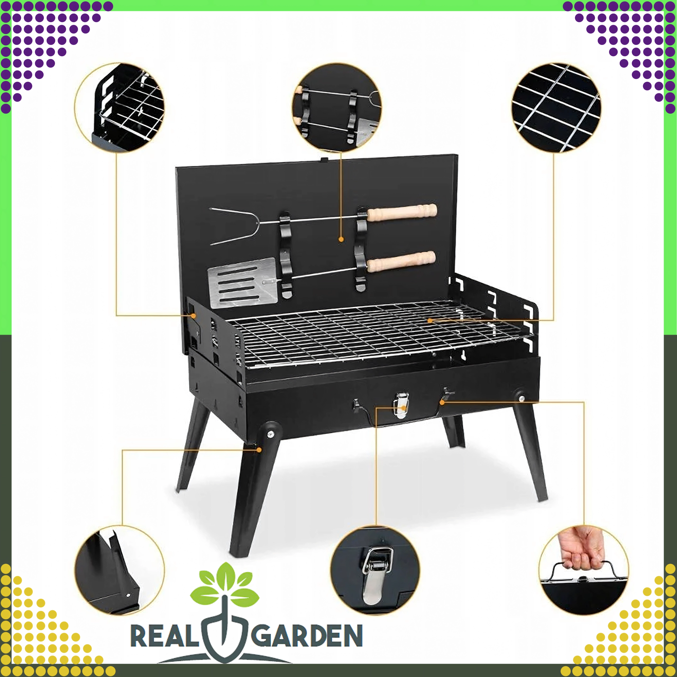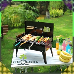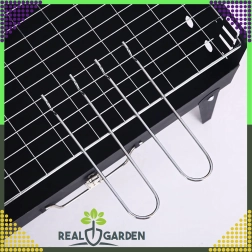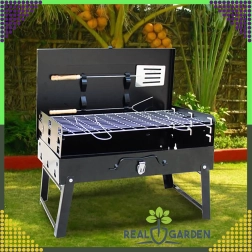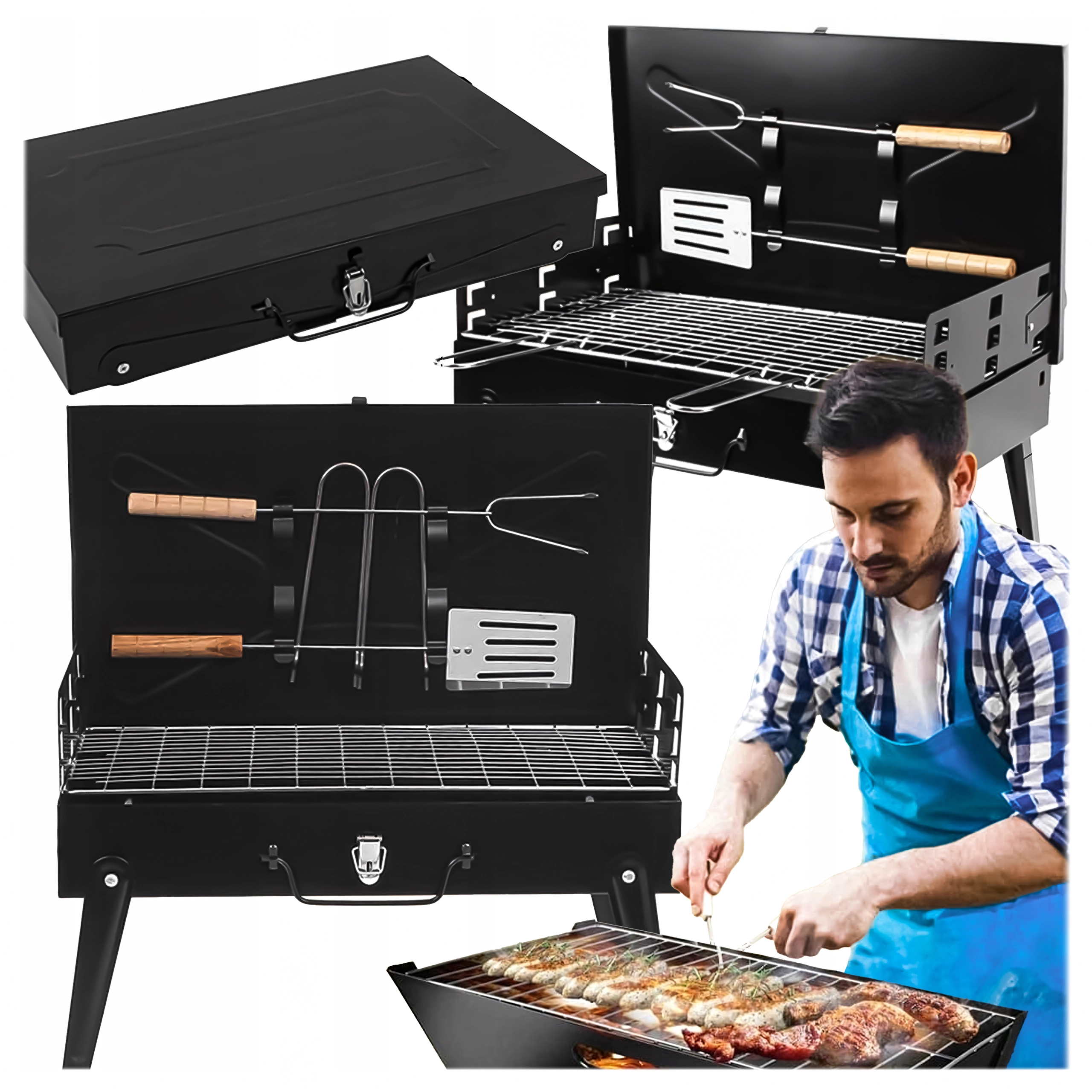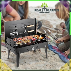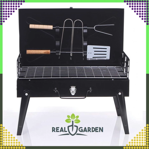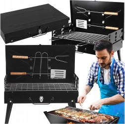 Goditi il barbecue ovunque con questo grill a carbone pieghevole e portatile dal pratico design a valigetta. Montaggio rapido senza attrezzi, struttura stabile e dimensioni compatte 44 × 27 × 47 cm lo rendono la scelta ideale per campeggio, giardino e picnic. Inclusi griglie e utensili di base per grigliare (paletta, pinza, spiedo). Le aperture di ventilazione garantiscono una combustione più efficiente e una preparazione più rapida dei cibi.