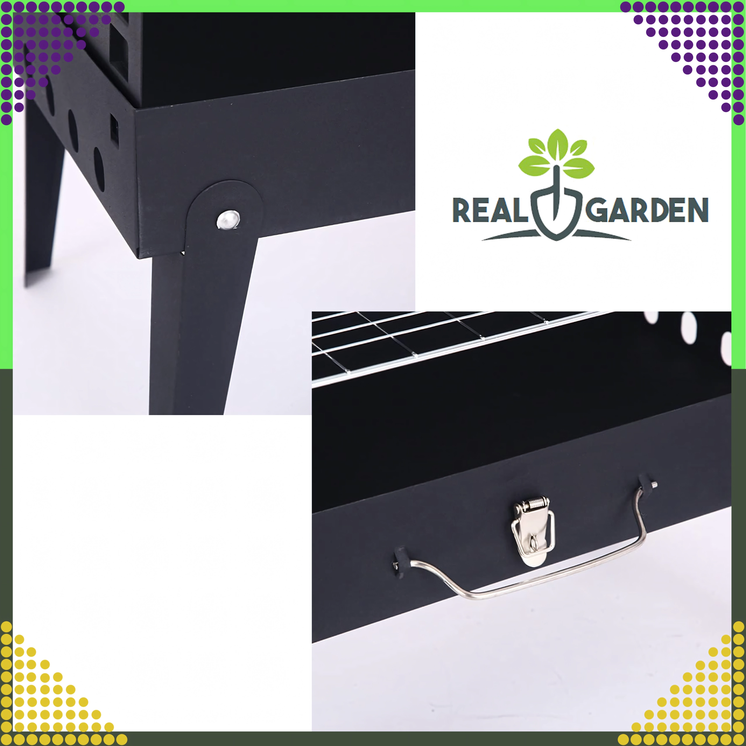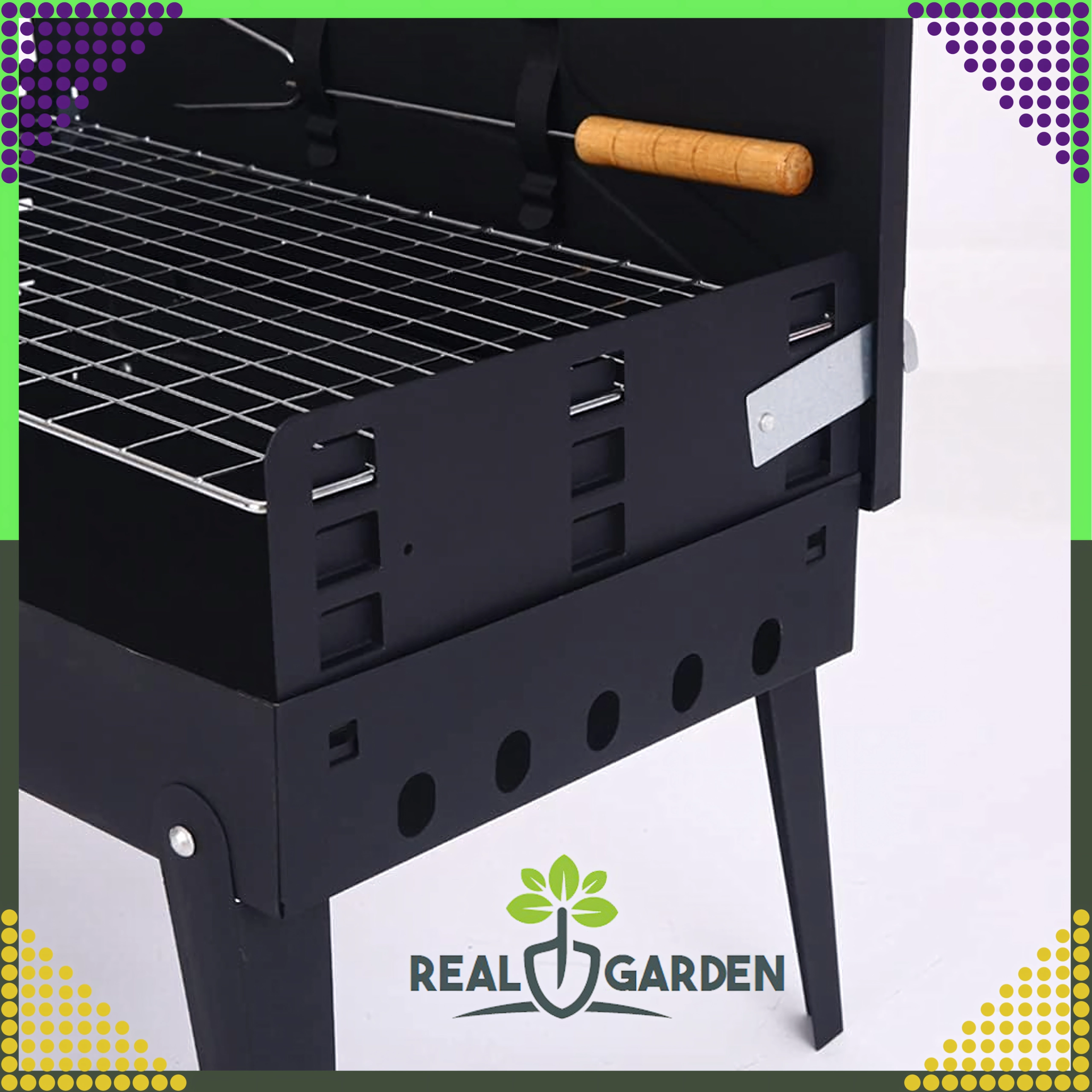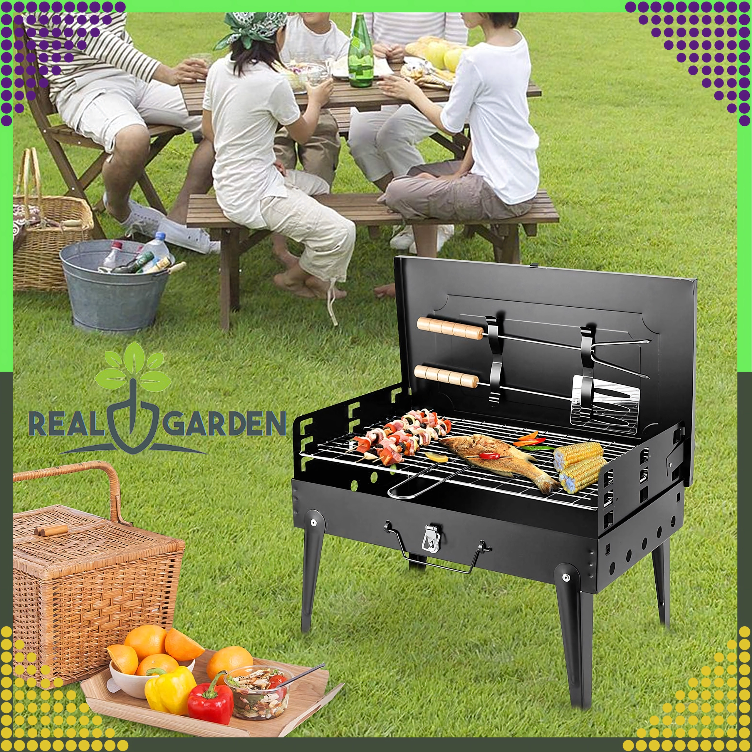 Goditi il barbecue ovunque con questo grill a carbone pieghevole e portatile dal pratico design a valigetta. Montaggio rapido senza attrezzi, struttura stabile e dimensioni compatte 44 × 27 × 47 cm lo rendono la scelta ideale per campeggio, giardino e picnic. Inclusi griglie e utensili di base per grigliare (paletta, pinza, spiedo). Le aperture di ventilazione garantiscono una combustione più efficiente e una preparazione più rapida dei cibi.