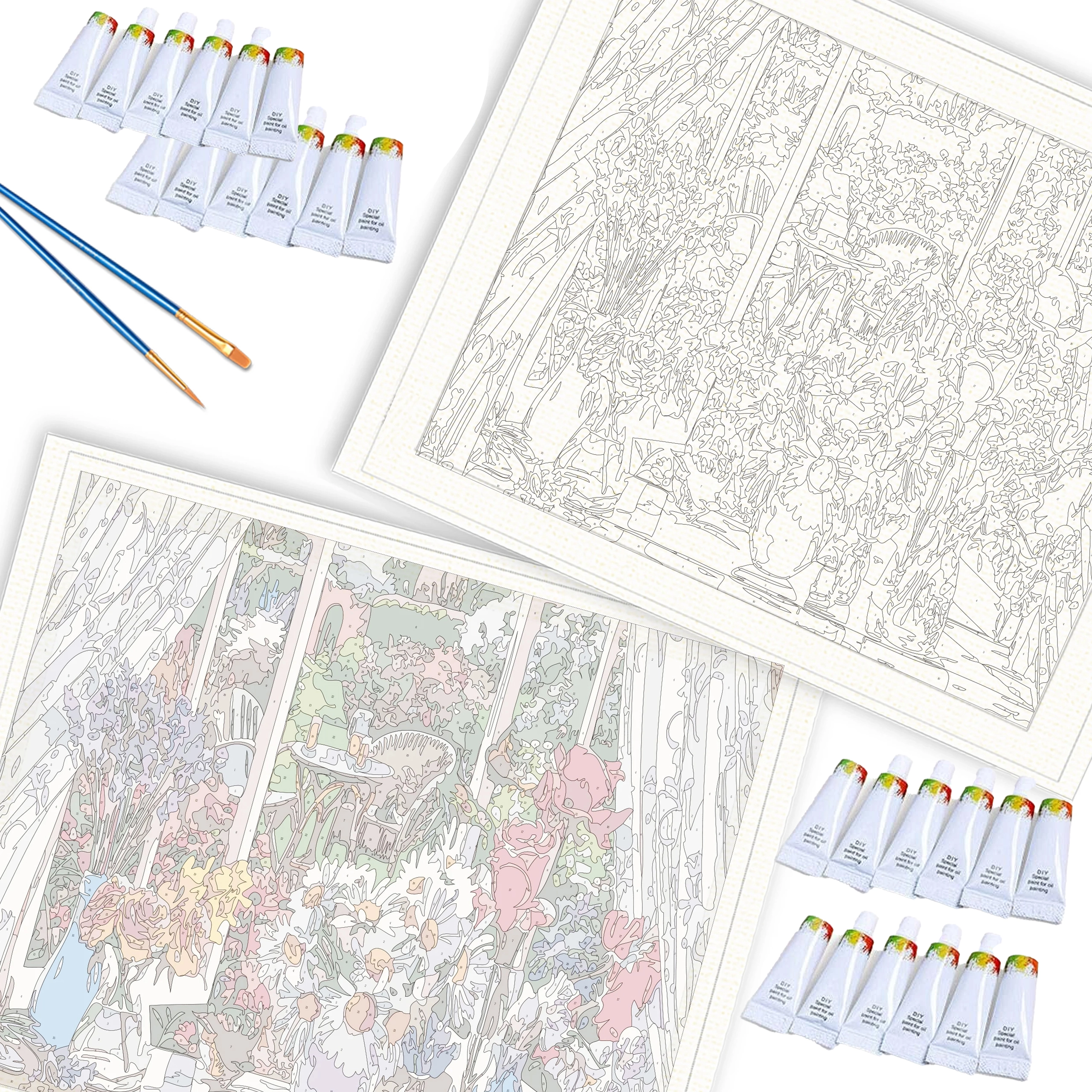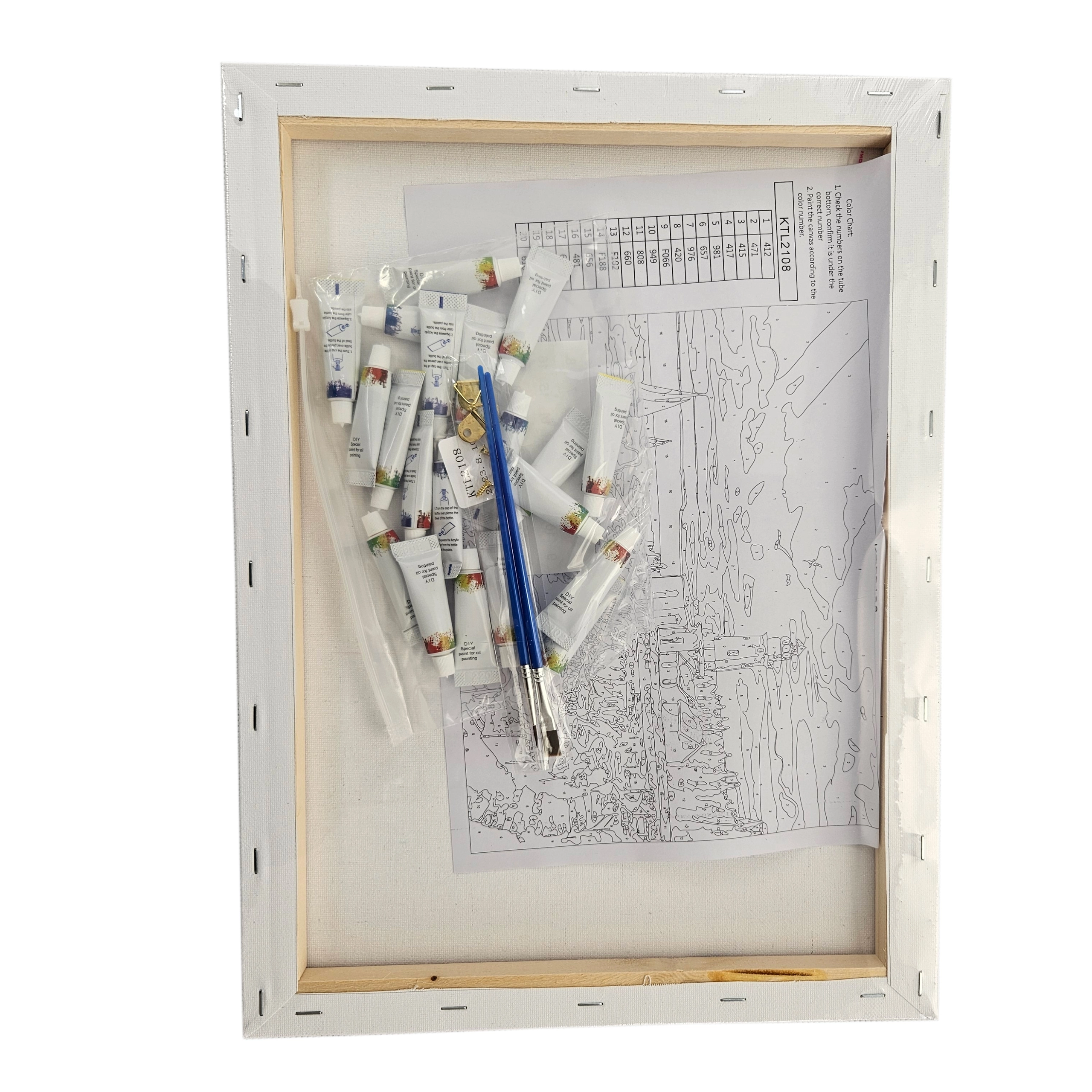 Il set completo include tela numerata, colori acrilici e pennelli – apri la scatola e puoi iniziare subito a creare.