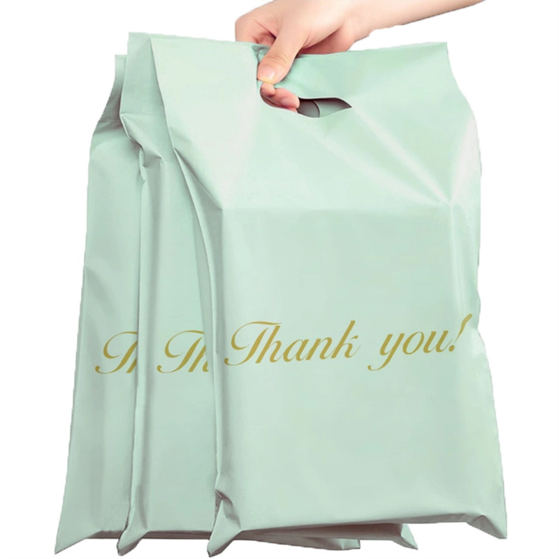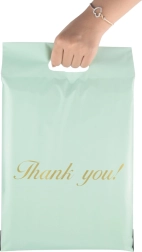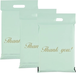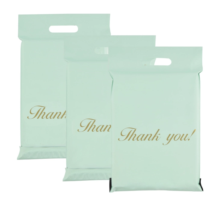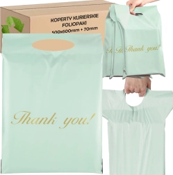 Buste corriere resistenti con manico fustellato in elegante colore menta, realizzate in robusto film LDPE. Chiusura sicura con nastro autoadesivo, trasporto facile grazie al manico e protezione affidabile della spedizione contro umidità, polvere e sporco. La confezione contiene 50 pezzi nelle dimensioni 500 × 600 mm + manico 70 mm con scritta decorativa “Thank you!”.
