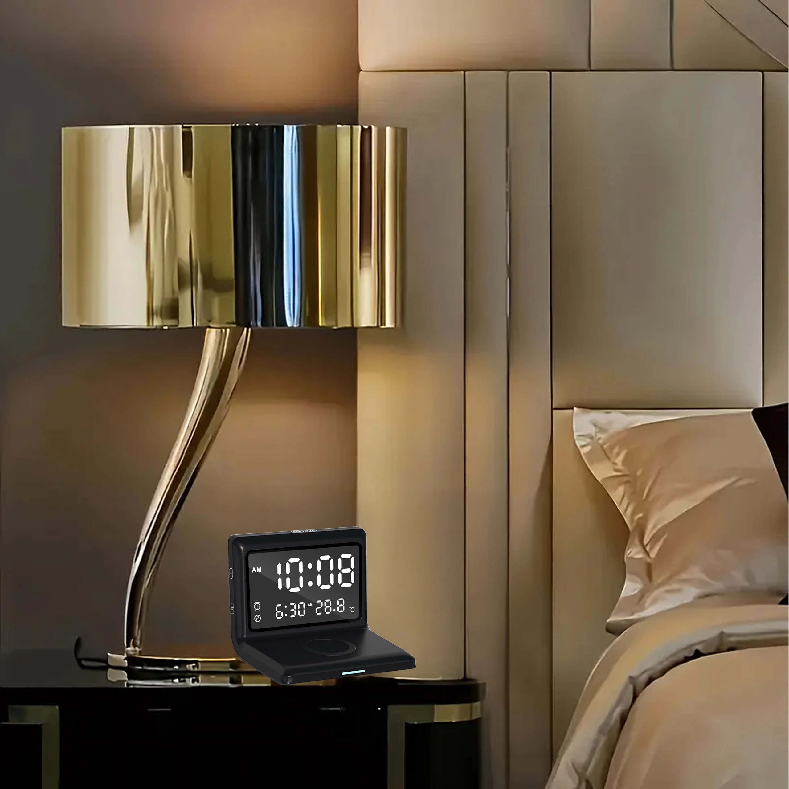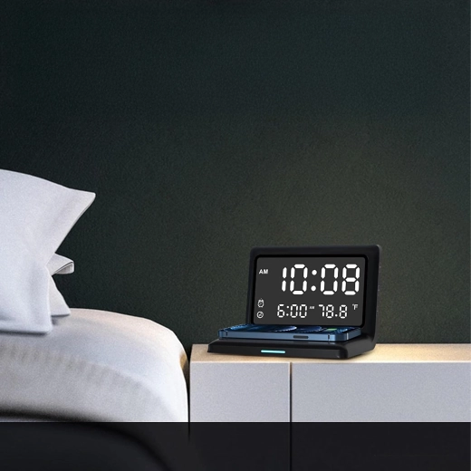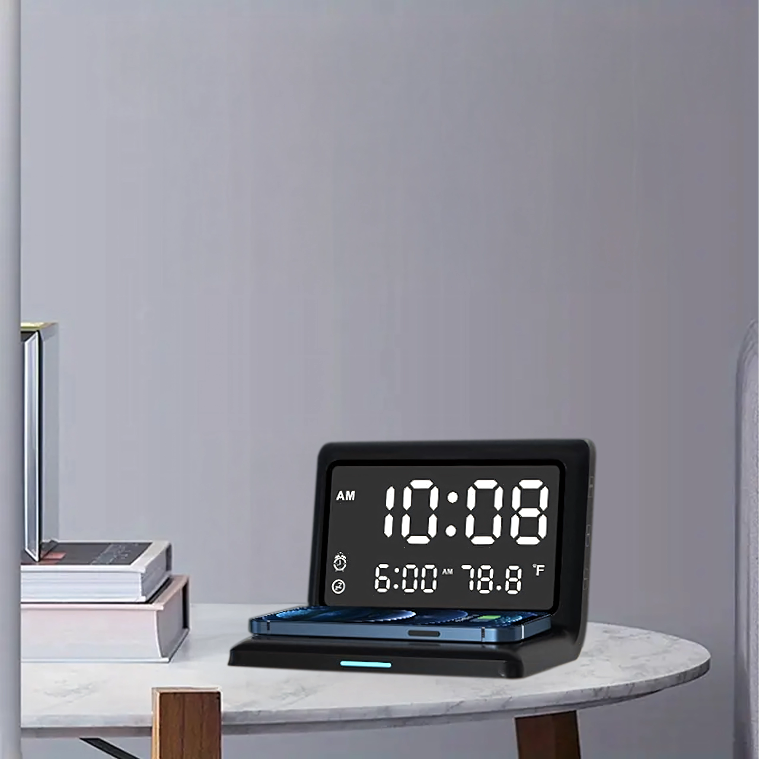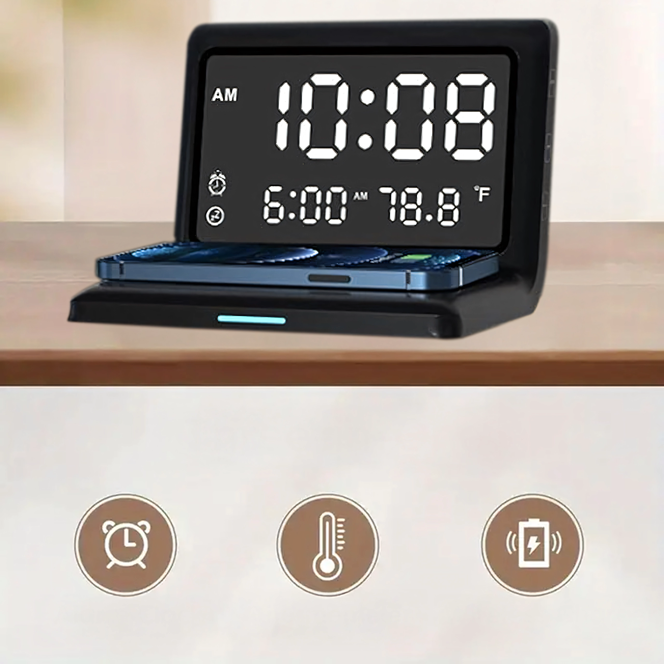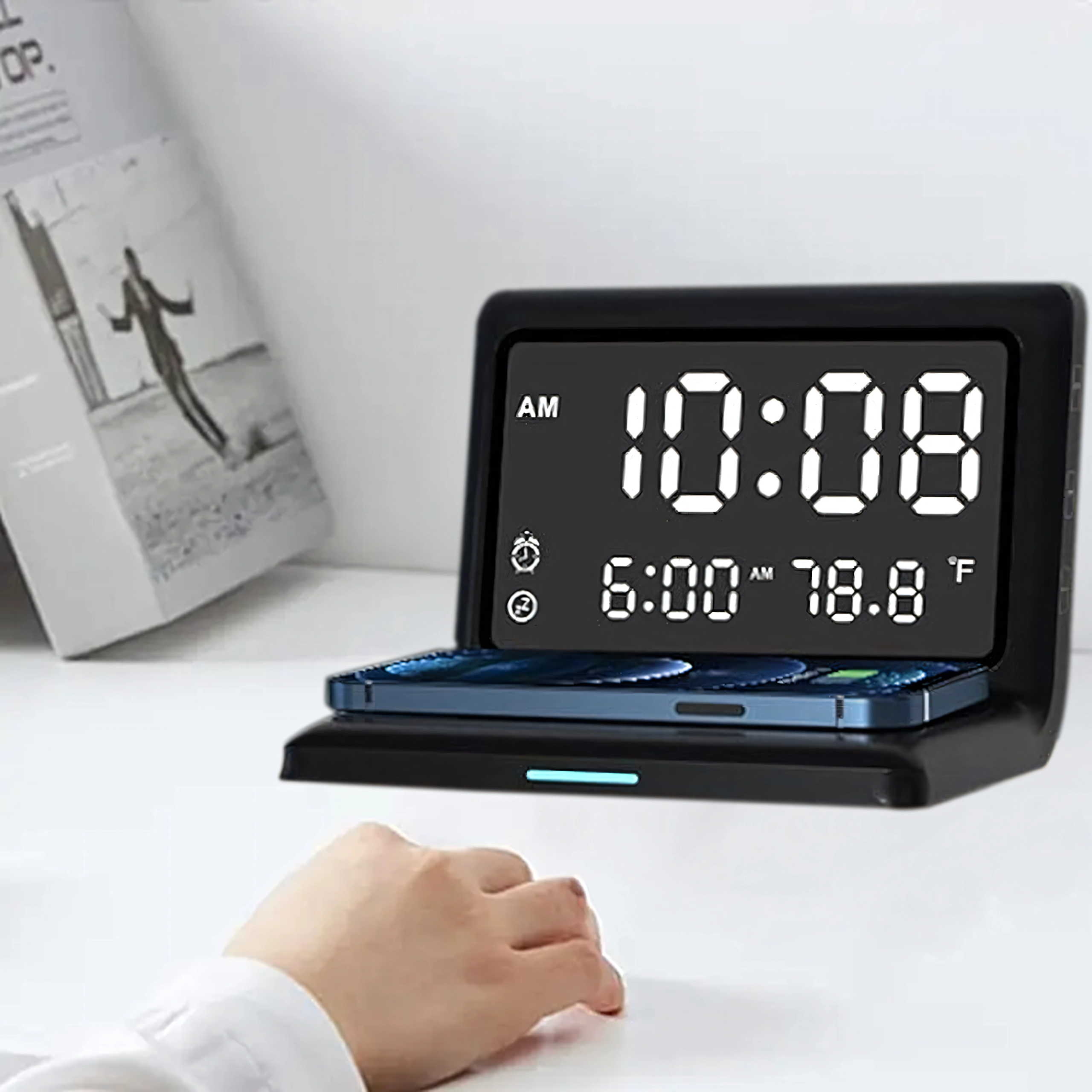 Moderna sveglia digitale 3‑in‑1 con funzione di ricarica wireless da 15 W e termometro integrato. Combina sveglia, elegante display a specchio e ricarica rapida dello smartphone – ideale per casa, ufficio e camere d’hotel.