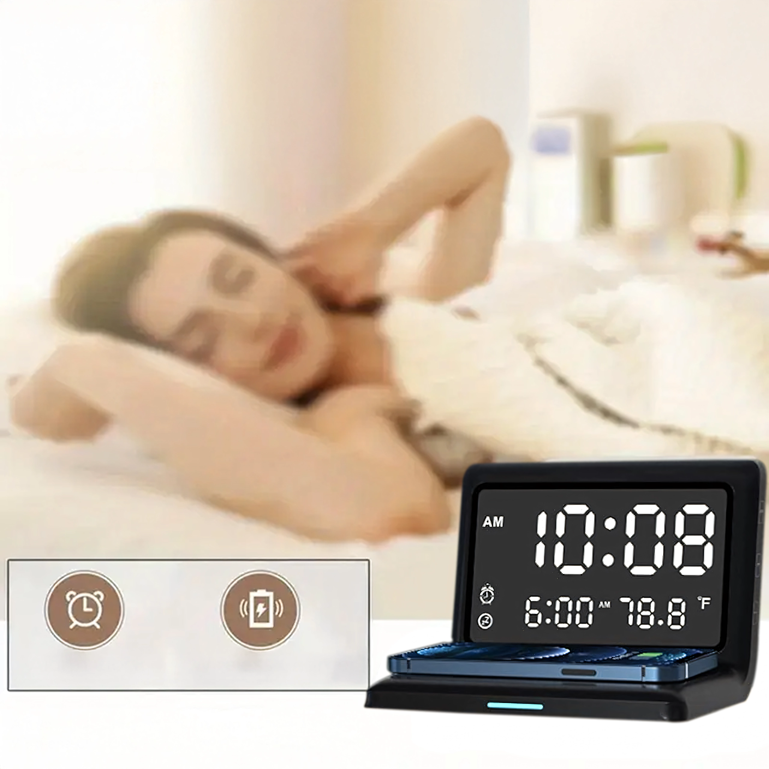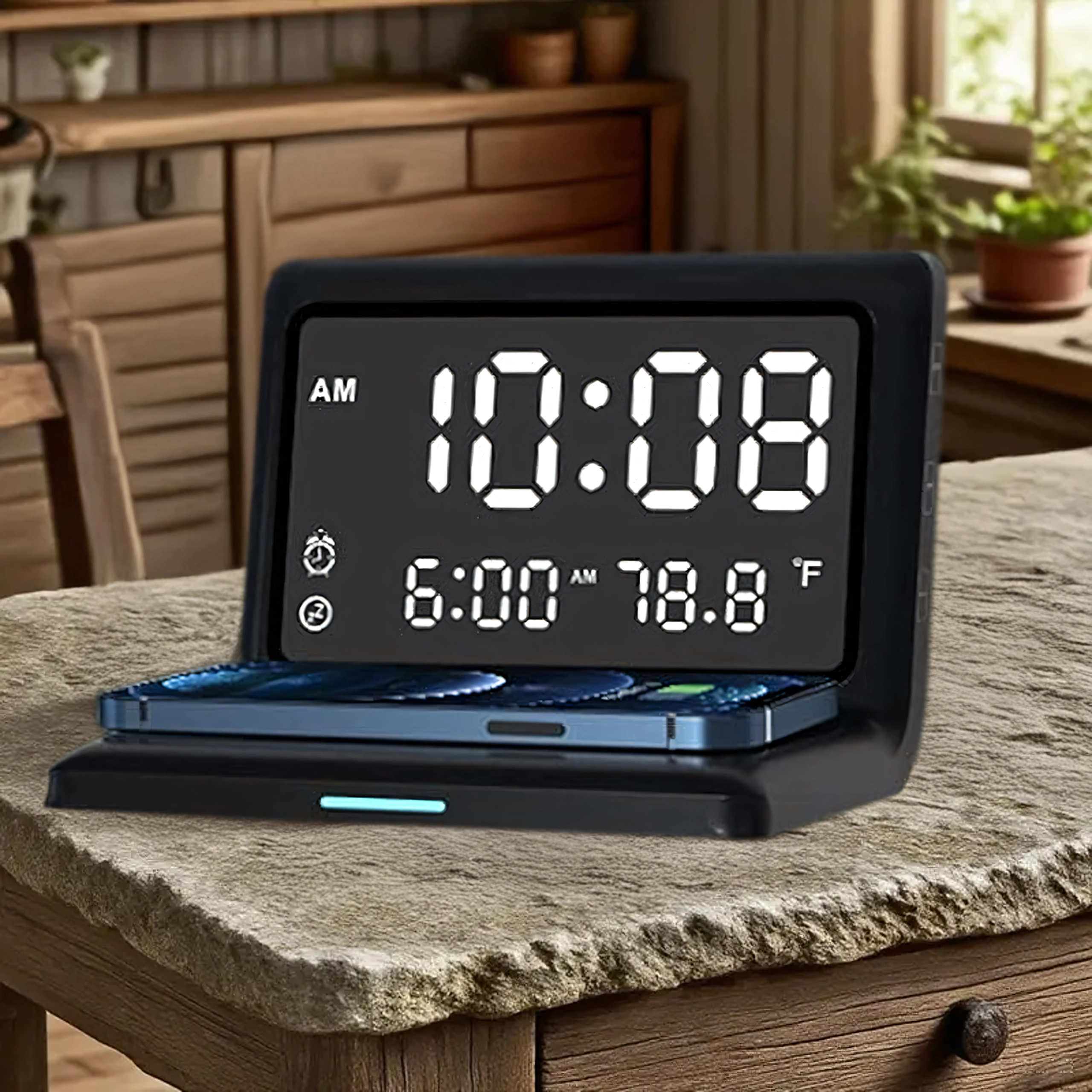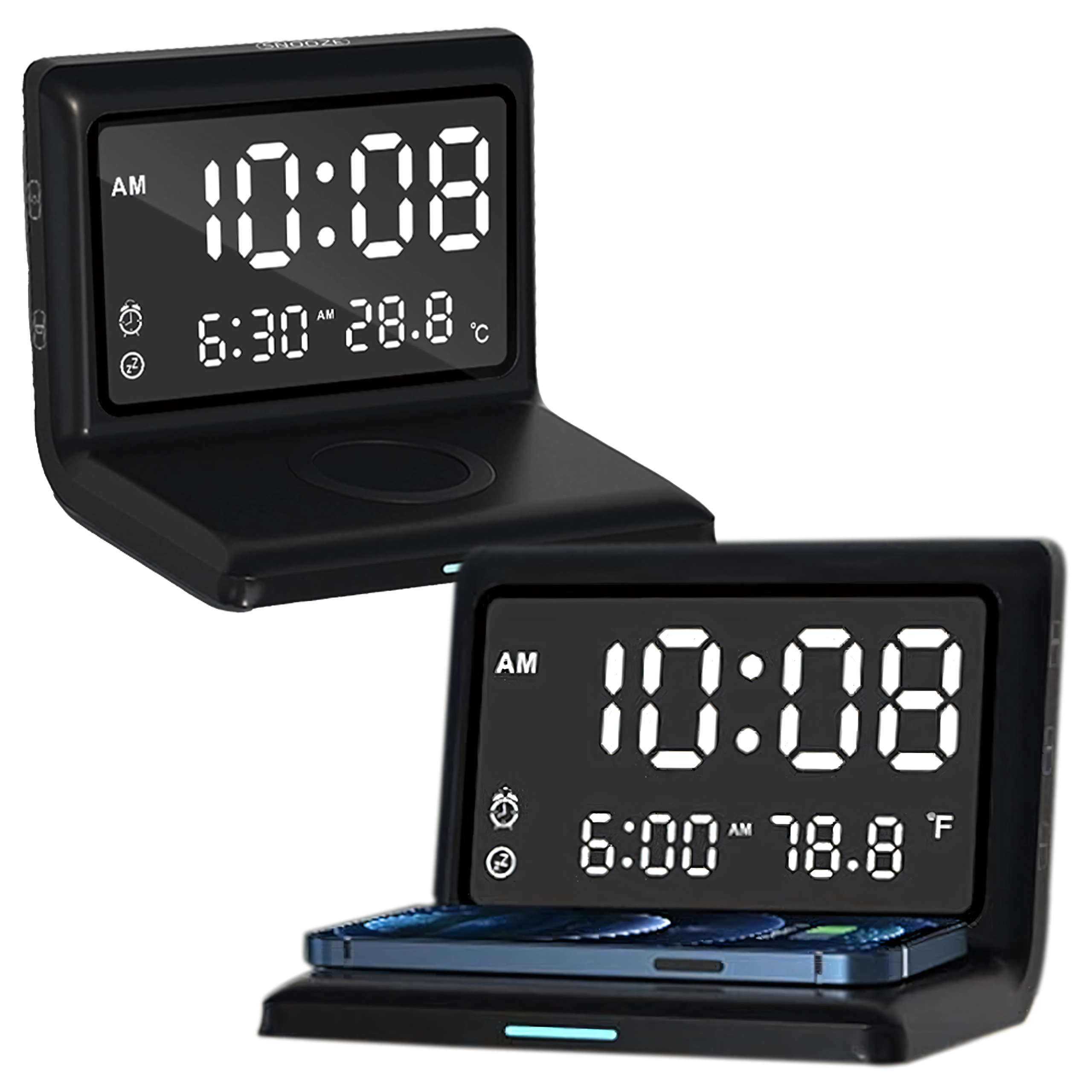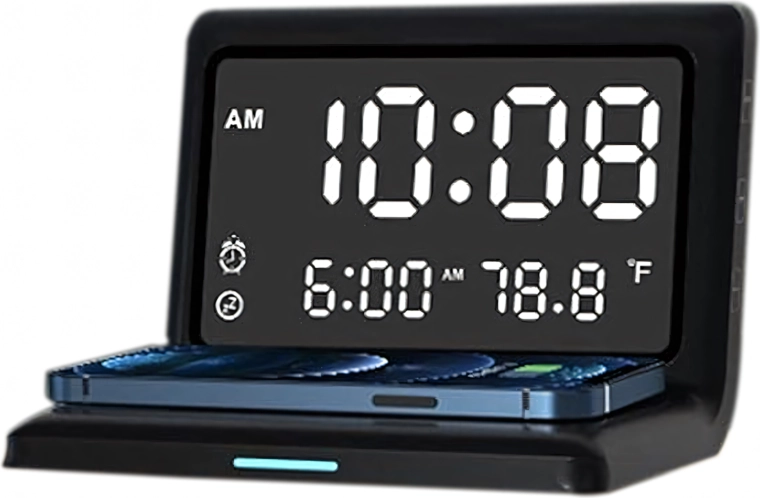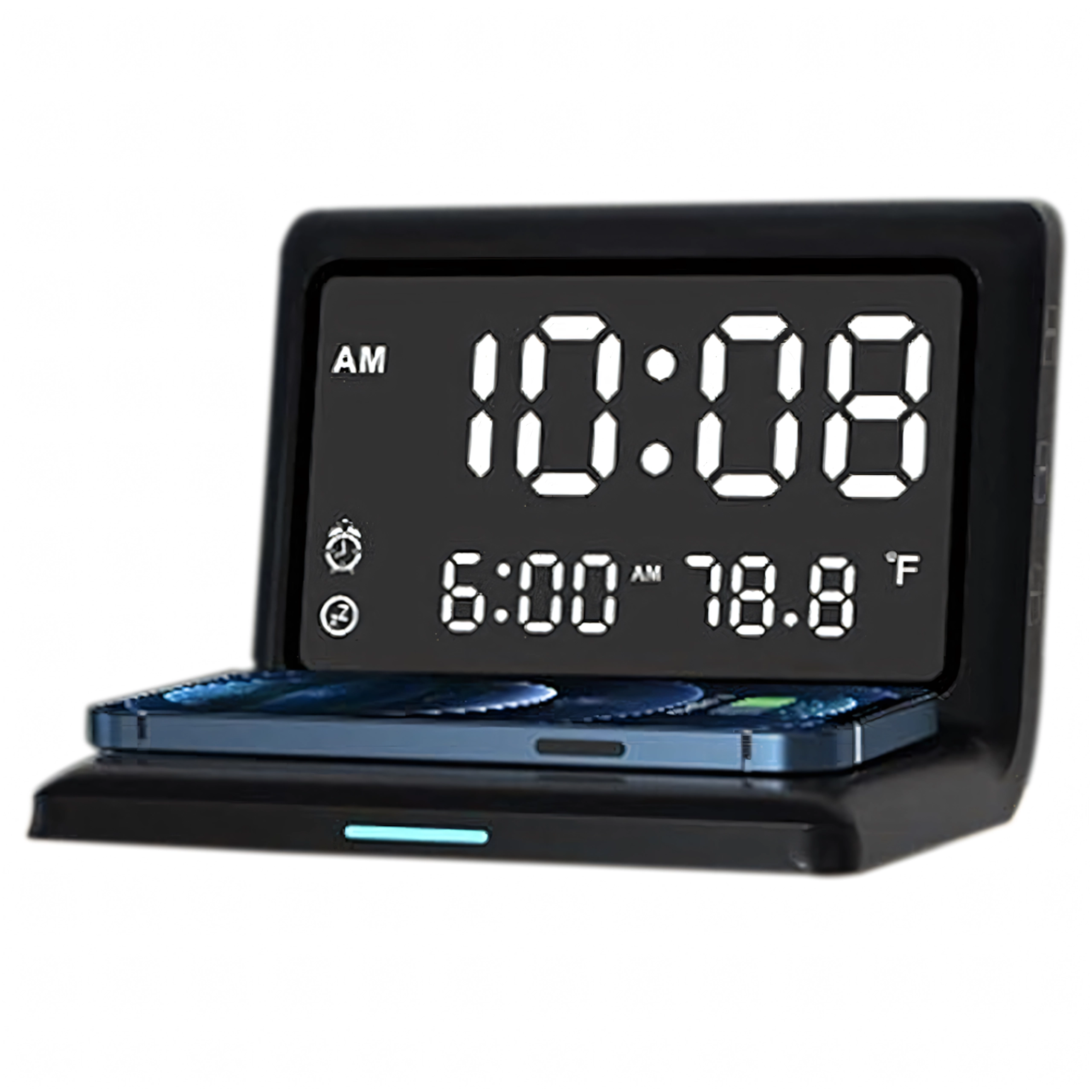 Moderna sveglia digitale 3‑in‑1 con funzione di ricarica wireless da 15 W e termometro integrato. Combina sveglia, elegante display a specchio e ricarica rapida dello smartphone – ideale per casa, ufficio e camere d’hotel.