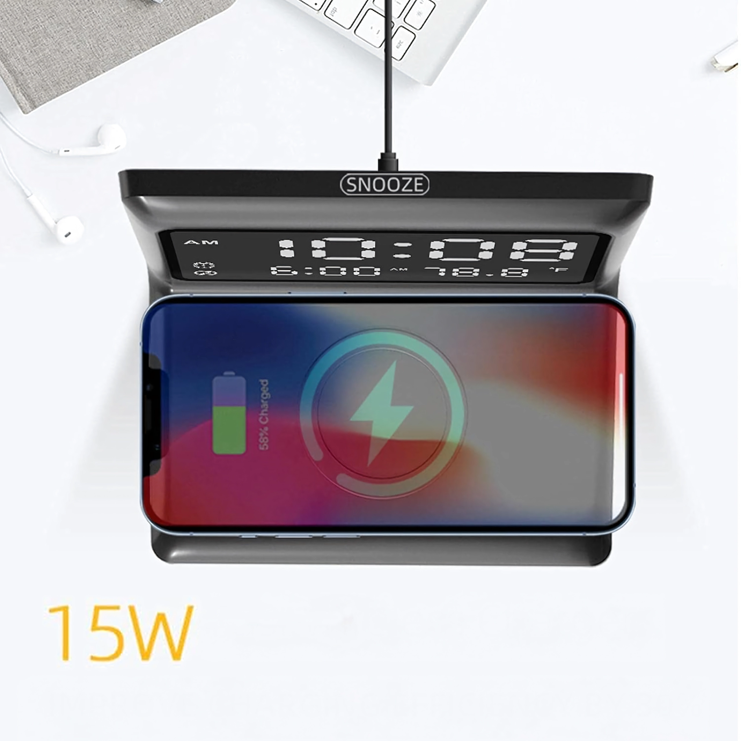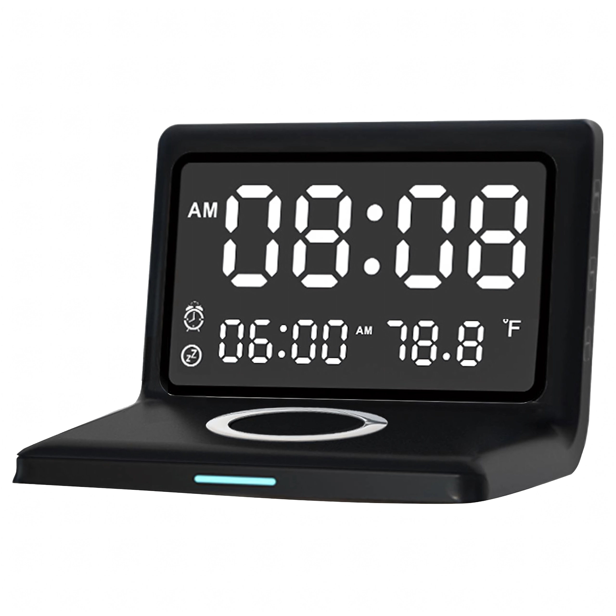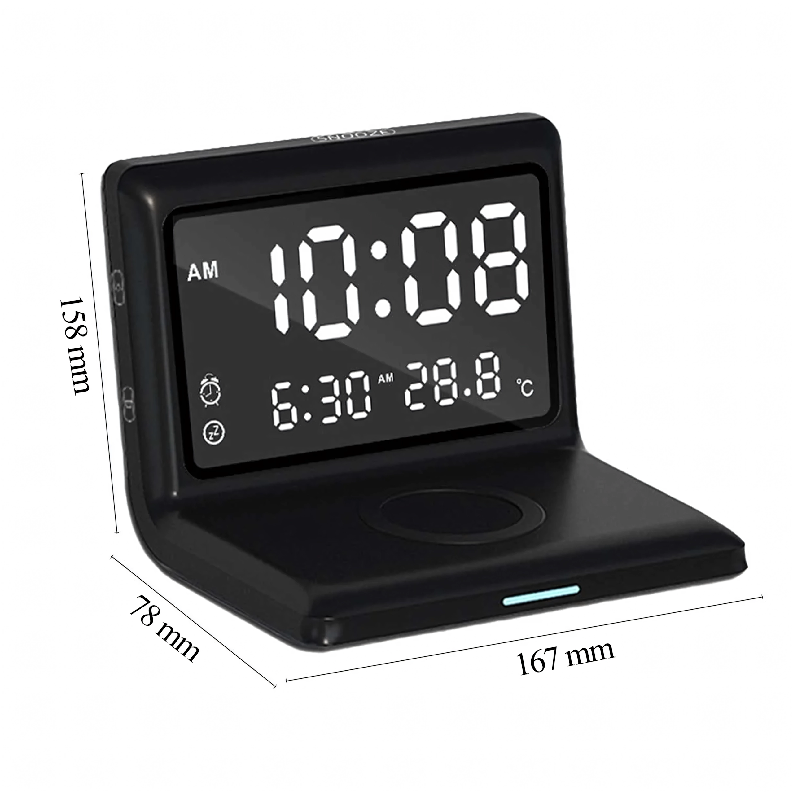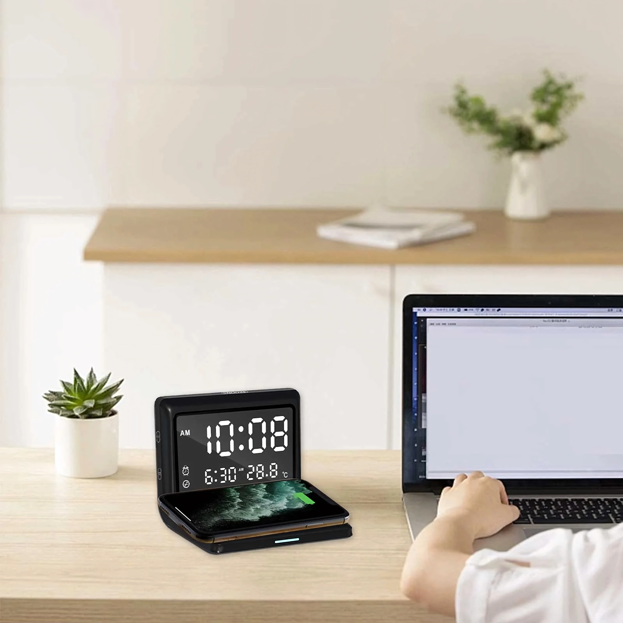 Moderna sveglia digitale 3‑in‑1 con funzione di ricarica wireless da 15 W e termometro integrato. Combina sveglia, elegante display a specchio e ricarica rapida dello smartphone – ideale per casa, ufficio e camere d’hotel.