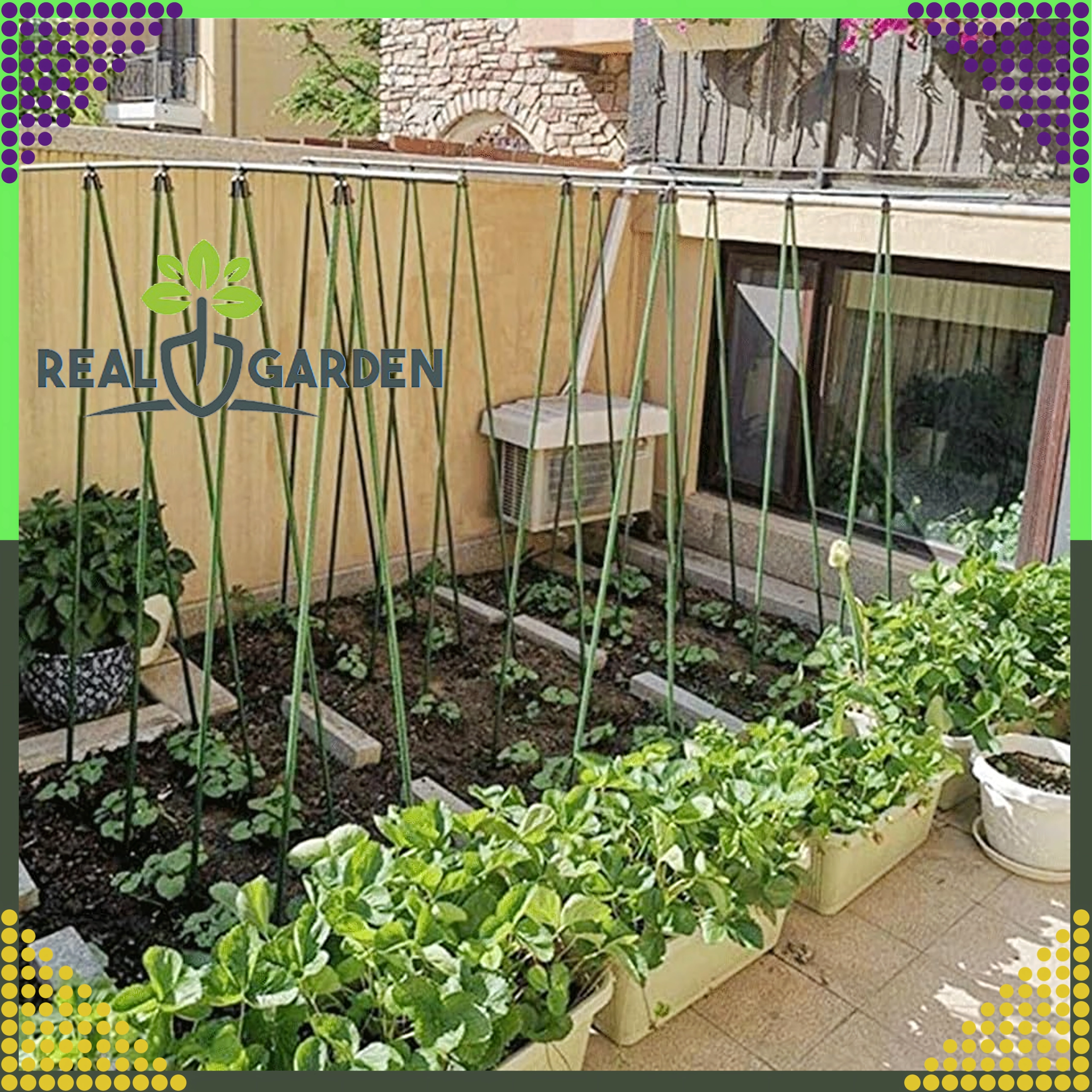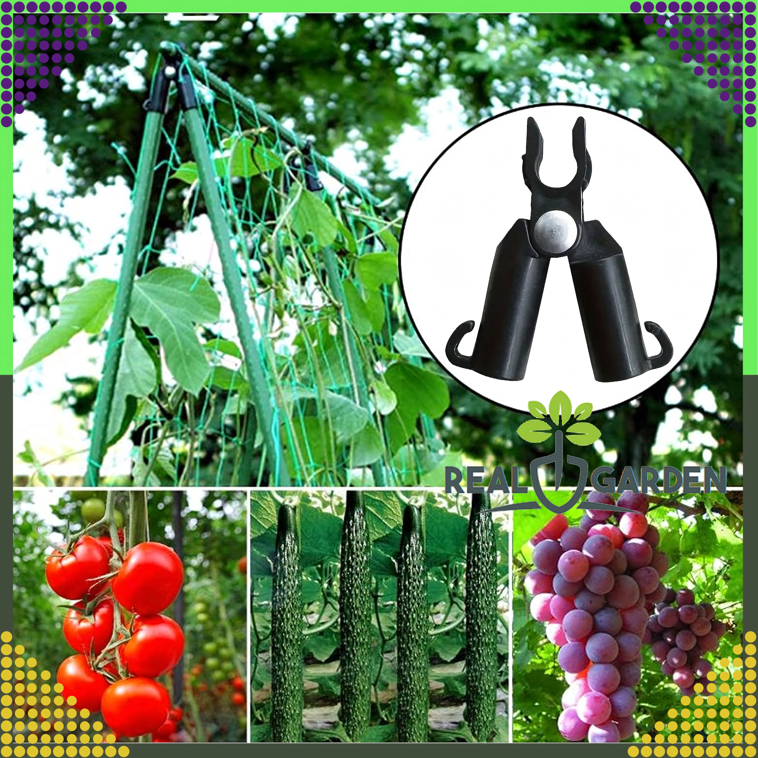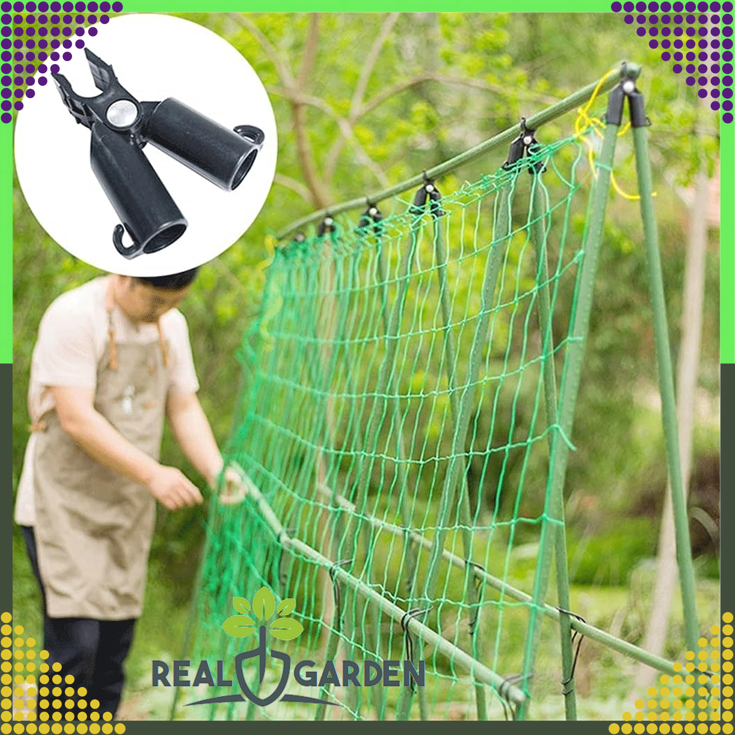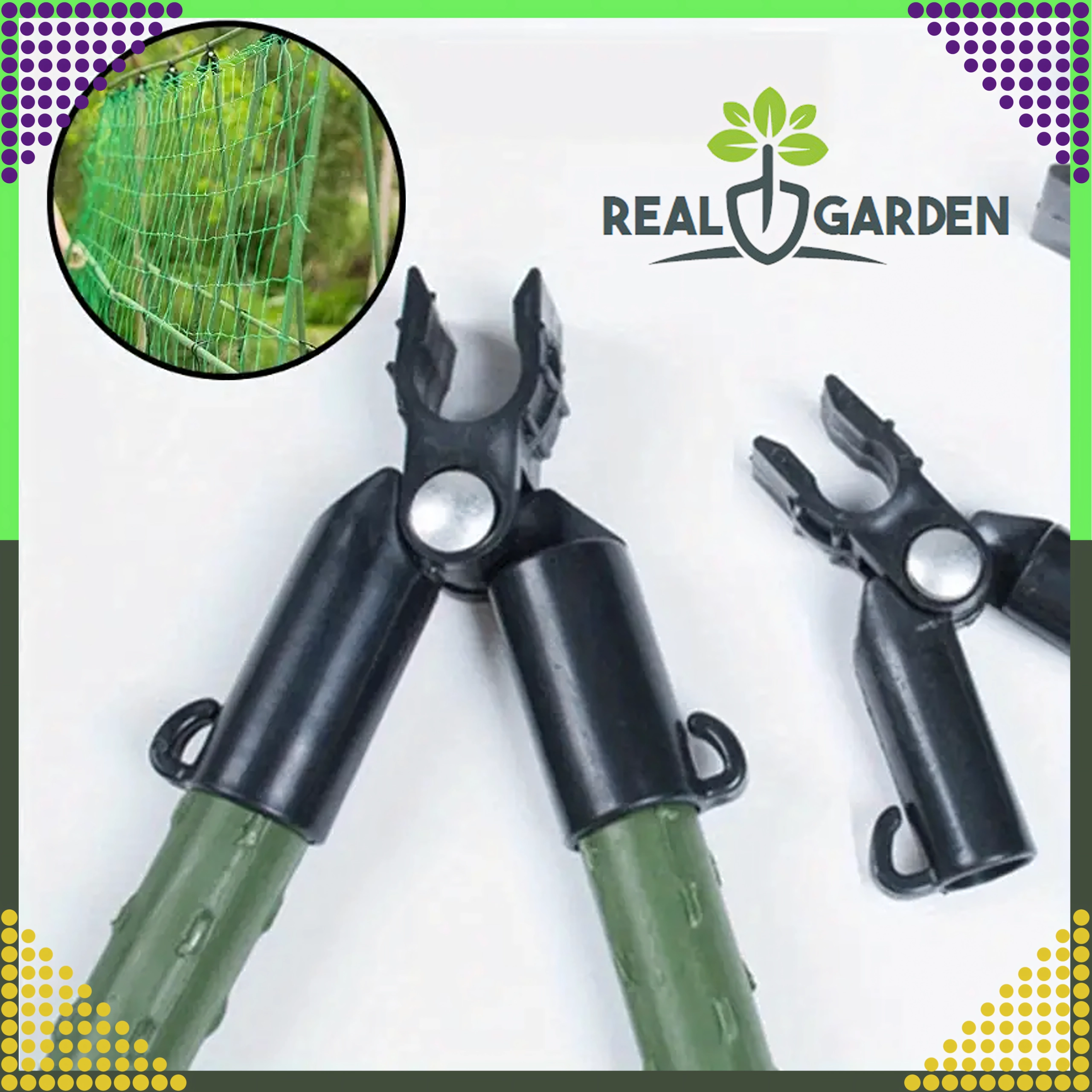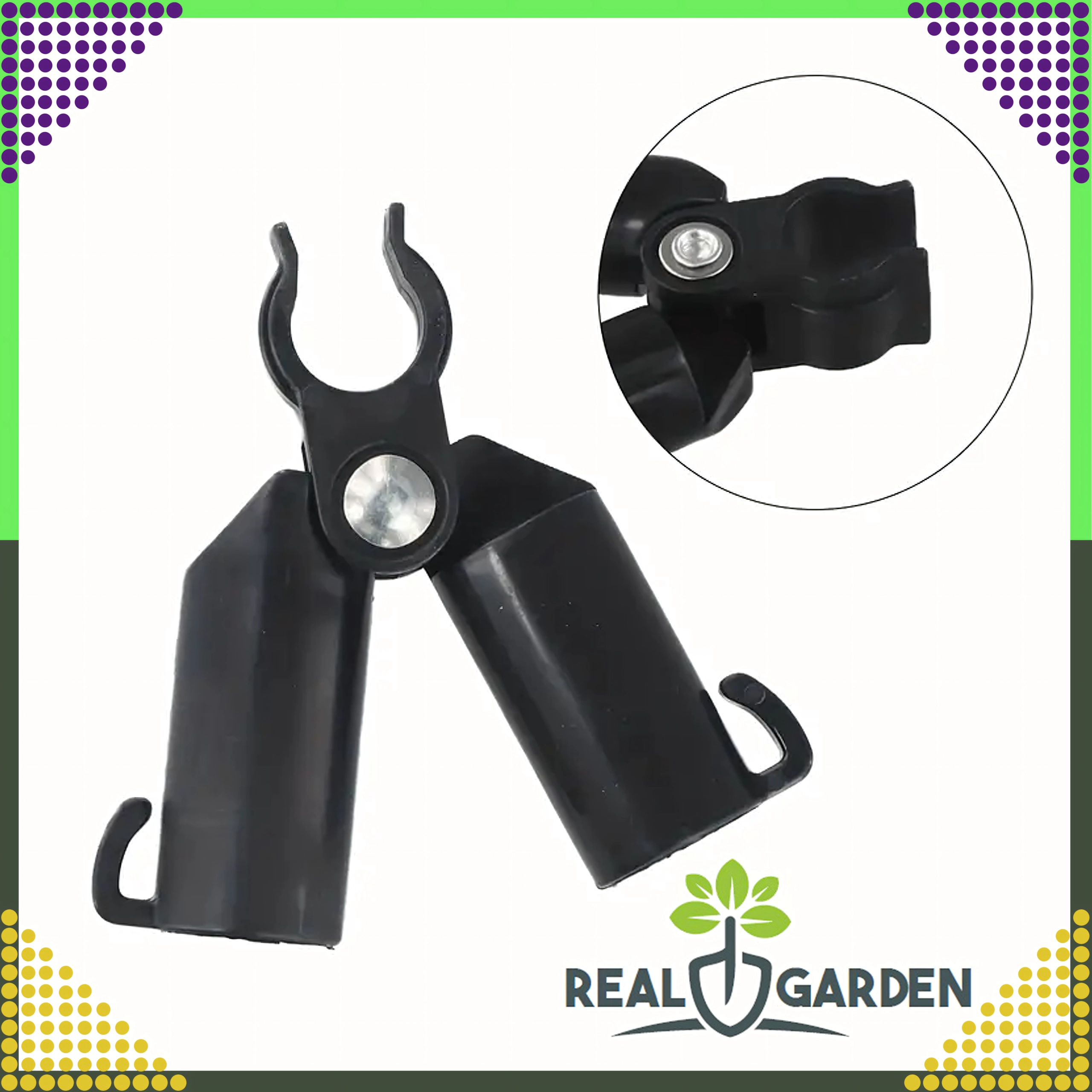 Il giunto a T articolato di vertice Real Garden facilita la costruzione di telai, strutture ad A e supporti per pomodori, fagioli o cetrioli. Grazie alla combinazione di plastica robusta ed elementi metallici garantisce un collegamento stabile dei pali da giardino con diametro di 9 mm e resiste anche all’uso prolungato all’aperto.