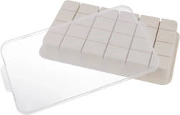 Il coperchio trasparente facilita la manipolazione: durante il trasporto l’acqua non si rovescia e il ghiaccio è protetto da odori indesiderati. Il materiale morbido e flessibile garantisce un rilascio semplice dei cubetti senza crepe e senza torcere lo stampo.