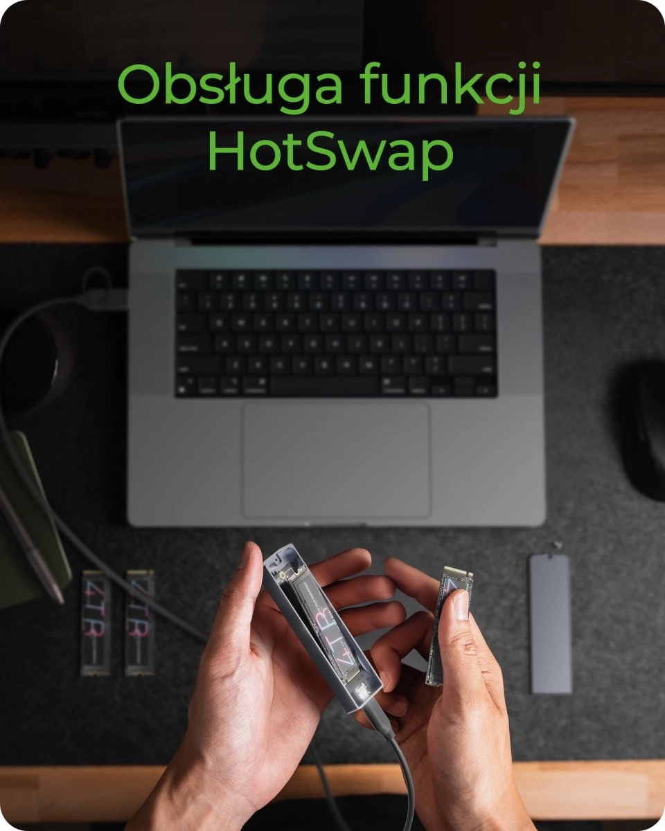 L’illuminazione RGB integrata dona un look moderno al tuo setup e al contempo indica l’alimentazione. Il corpo in alluminio e il pad termico incluso dissipano efficacemente il calore dall’SSD verso lo chassis per prestazioni stabili anche sotto carichi prolungati. Il case supporta l’hot-swap, quindi puoi sostituire i dischi senza spegnere il sistema, ed è compatibile con Windows, macOS e Linux.