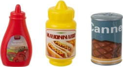 Piattini, posate, bevande, prodotti da forno, uova, dolcetti, pollo e salse: tutto per servire, mescolare e apparecchiare. I bambini imparano forme e nomi degli alimenti.
