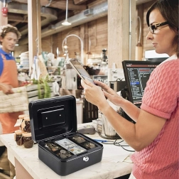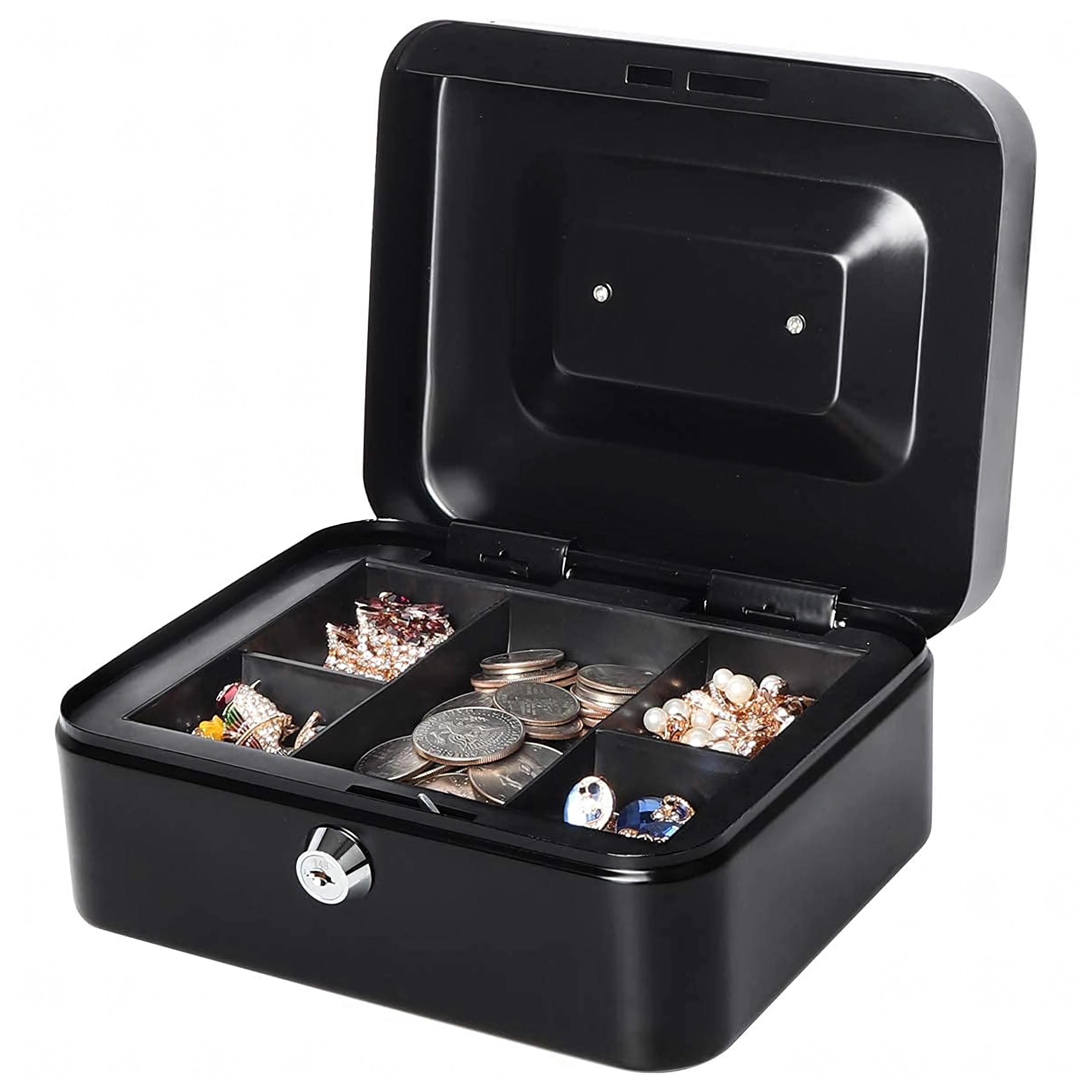 Il vassoio in plastica estraibile con scomparti per le monete semplifica la suddivisione e l'incasso; sotto di esso c'è spazio per banconote e documenti. Il robusto corpo in metallo con cerniere di qualità e la comoda maniglia garantiscono lunga durata e facile trasporto, sia in cassa, al banco che a casa.