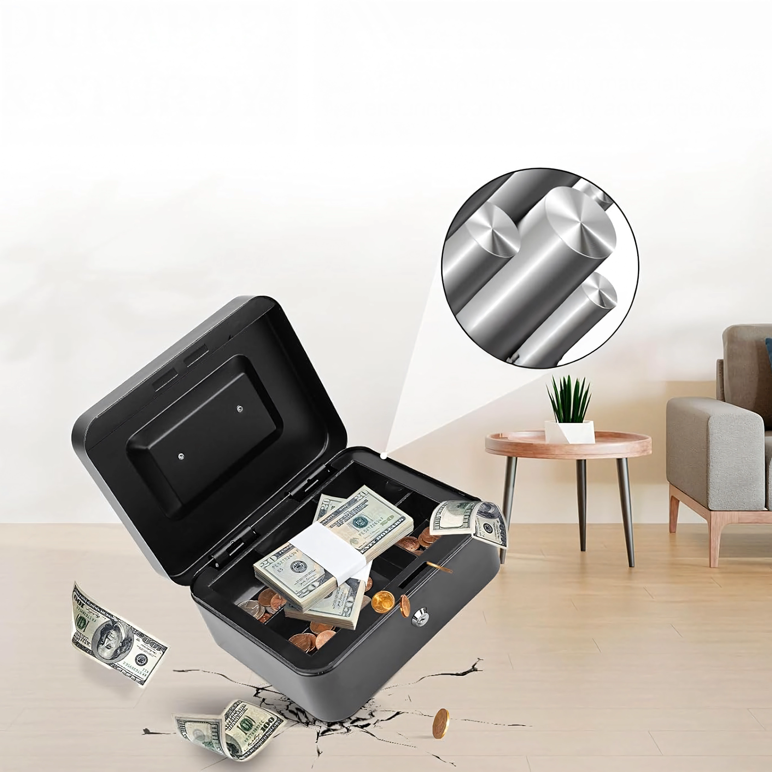 La serratura frontale a chiave protegge contanti e oggetti di valore e garantisce tranquillità nell'uso quotidiano a casa e al lavoro.