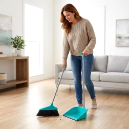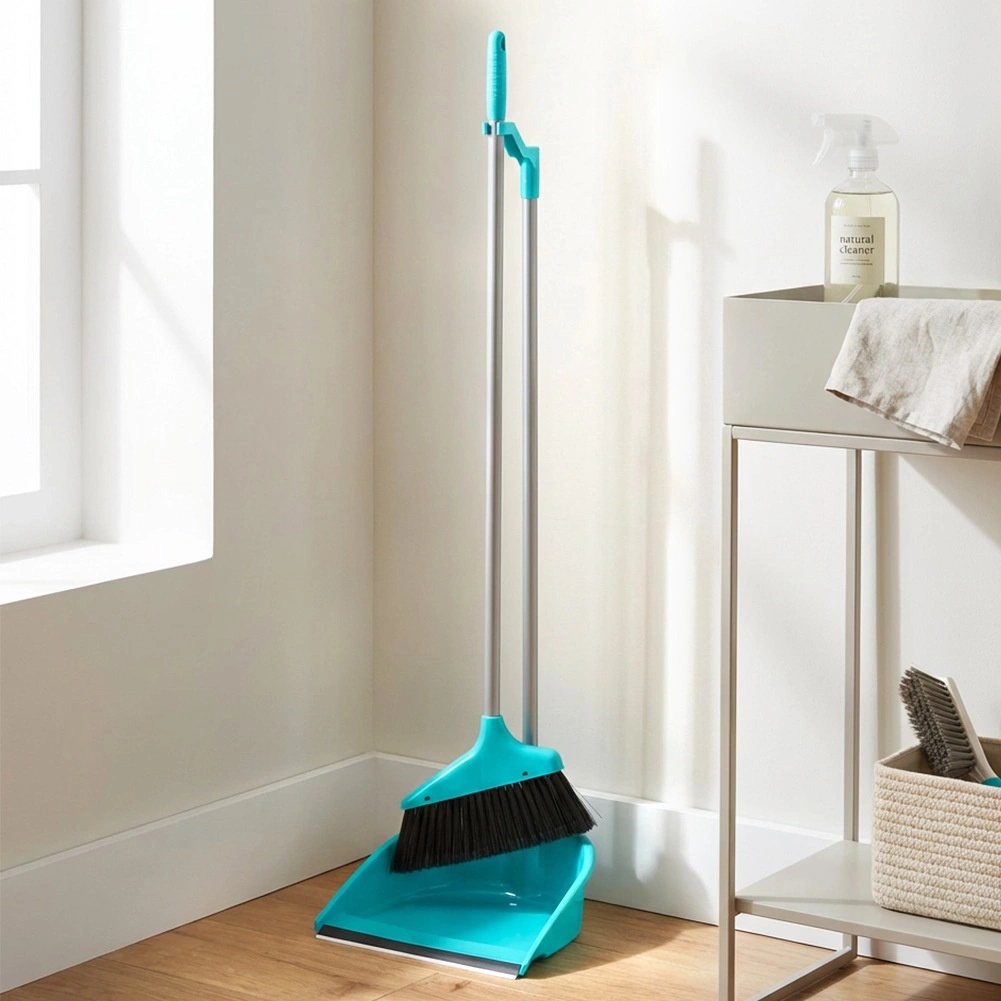 Questa scopa con paletta, in elegante colore turchese, offre una pulizia confortevole in posizione eretta. I manici lunghi garantiscono una postura naturale e riducono l’affaticamento della schiena, mentre il bordo in gomma della paletta (larghezza 2 cm) aderisce perfettamente al pavimento catturando anche la polvere fine senza lasciare residui.