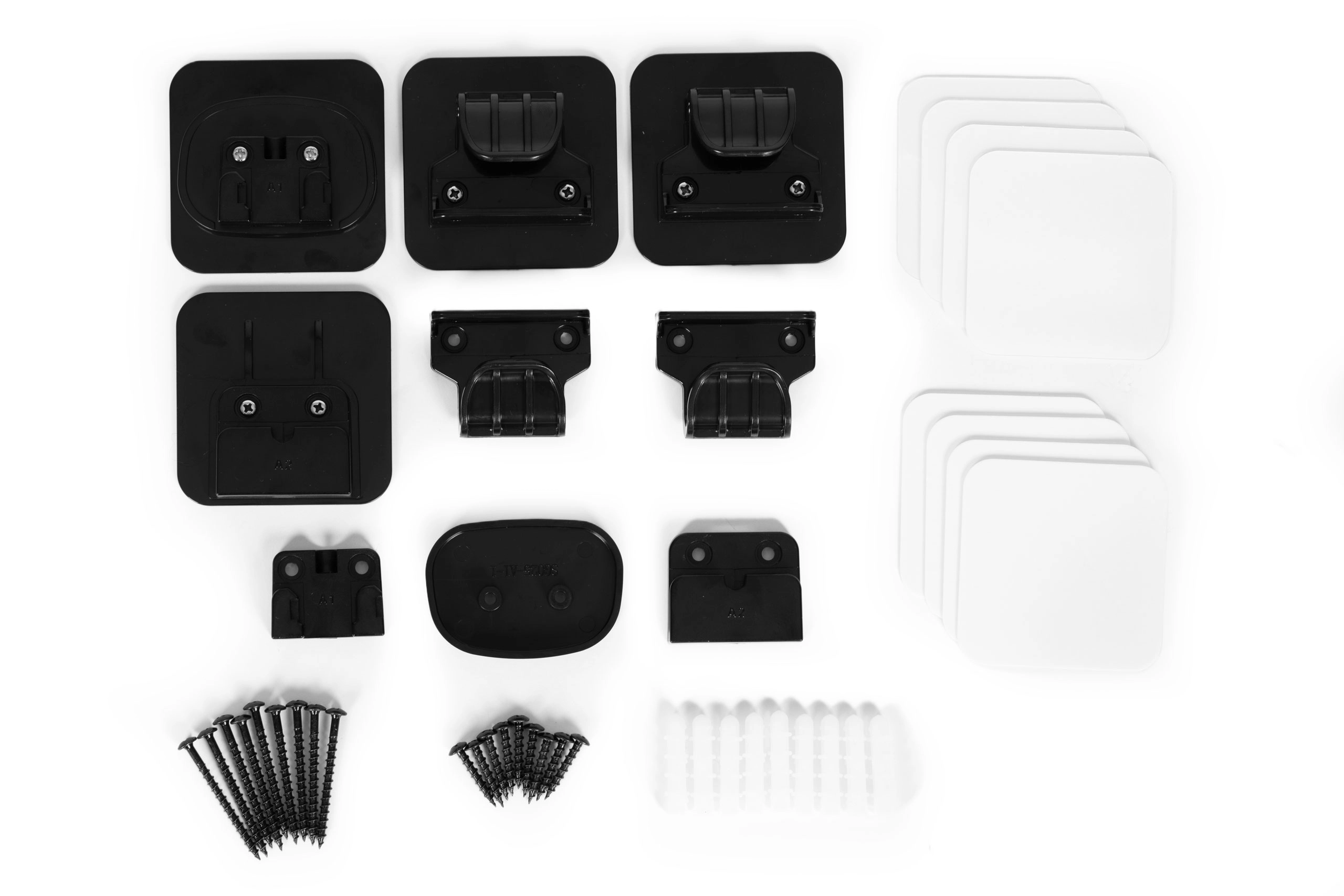 La confezione include supporti a parete, viti, tasselli e pad autoadesivi per il montaggio senza forature su superfici idonee (vetro, metallo, legno).