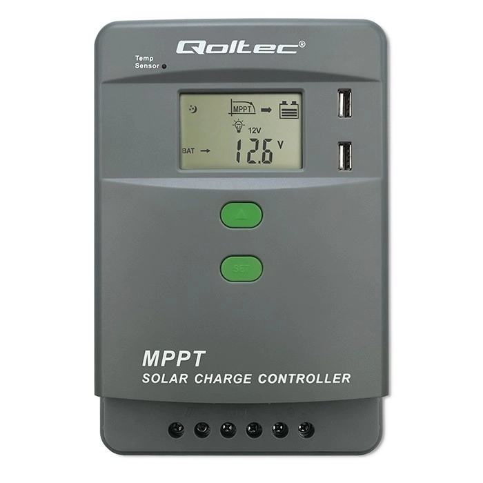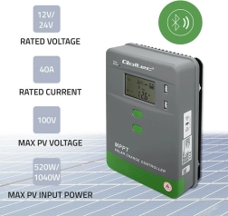 Regolatore di carica solare ad alta efficienza con tecnologia MPPT per il massimo sfruttamento dell’energia dei pannelli solari. Offre adattamento automatico 12/24 V, corrente 40 A, display LCD, Bluetooth e app mobile per monitoraggio remoto, 2× USB per ricarica rapida e sensore di temperatura per protezione e maggiore durata della batteria. Compatibile con batterie GEL e LiFePO4.
