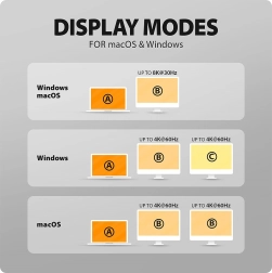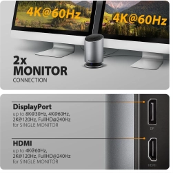 Grazie alle uscite DisplayPort e HDMI colleghi fino a due monitor contemporaneamente con risoluzione 4K/60 Hz (singolarmente DP fino a 8K/30 Hz). Supporto HDR, HDCP 1.4/2.3 e audio multicanale tramite HDMI. Il passthrough di alimentazione USB Power Delivery 3.0 100 W fornisce energia a notebook e hub con un solo alimentatore.