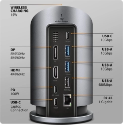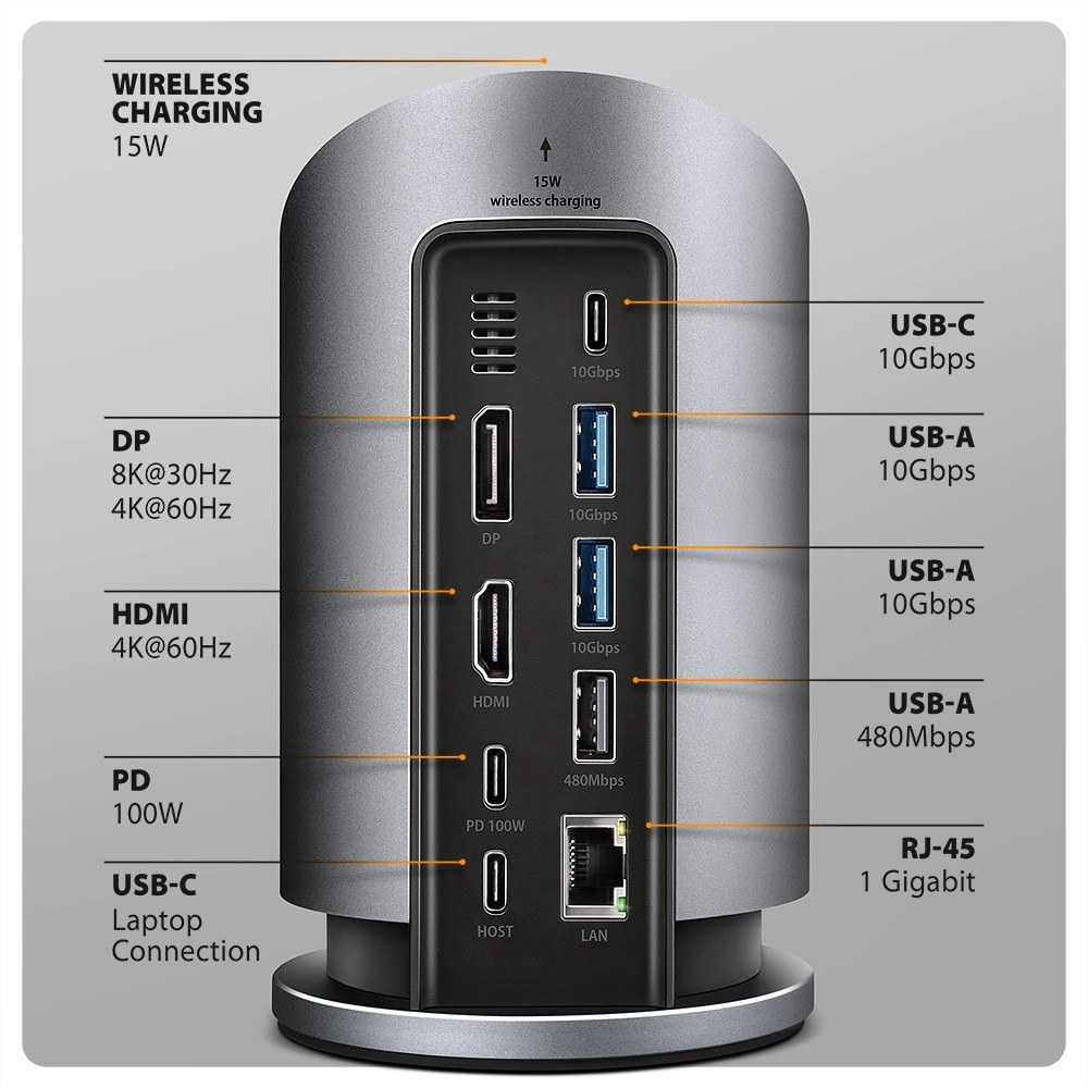 - Espansione 9in1: DP, HDMI, 3× USB (10 Gb/s), 1× USB (480 Mb/s), ingresso USB-C PD, RJ-45, ricarica wireless 15 W