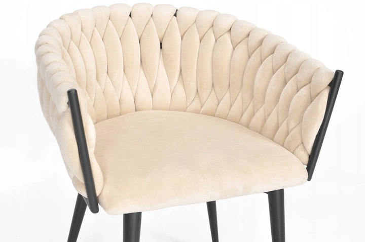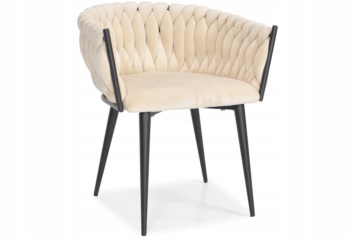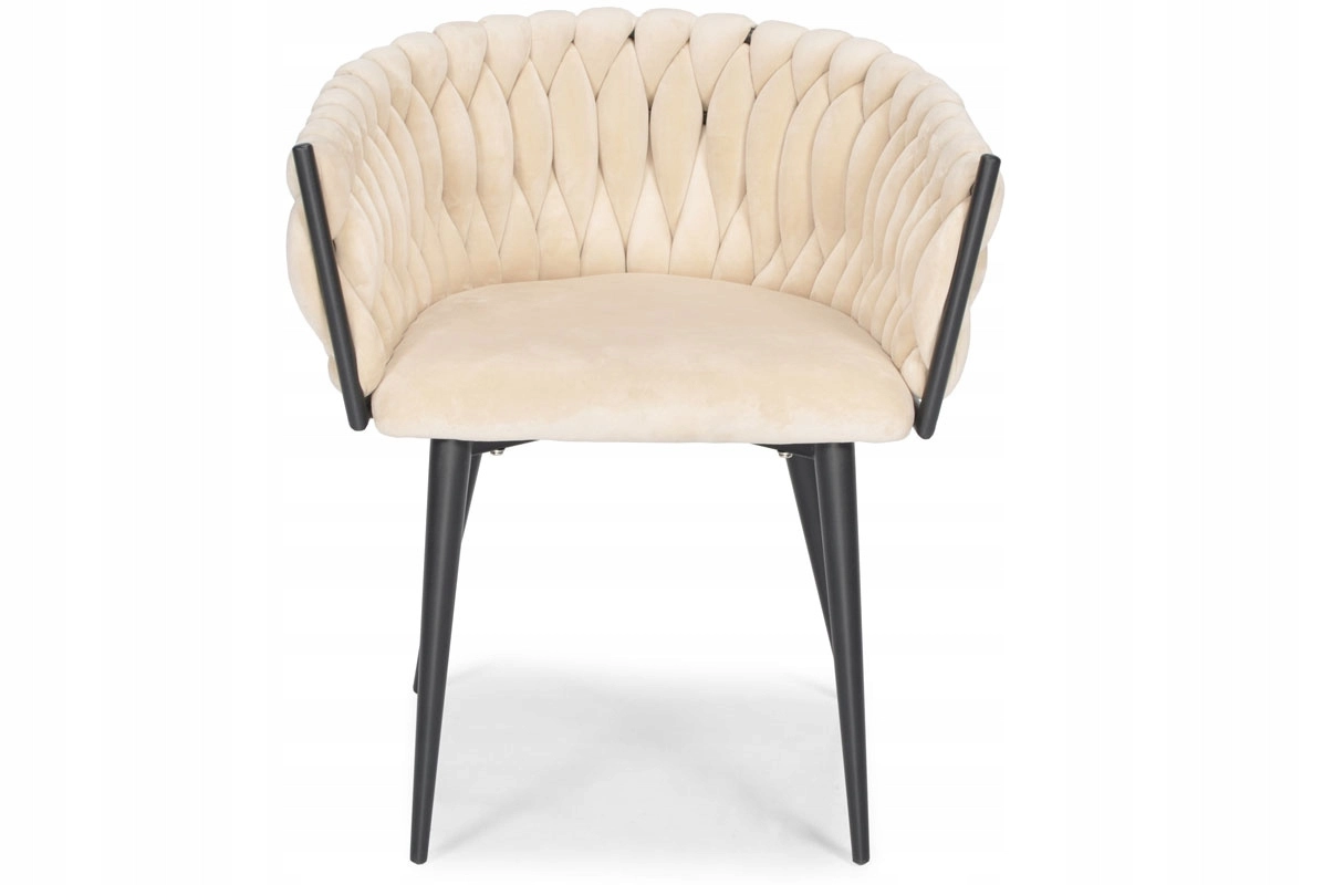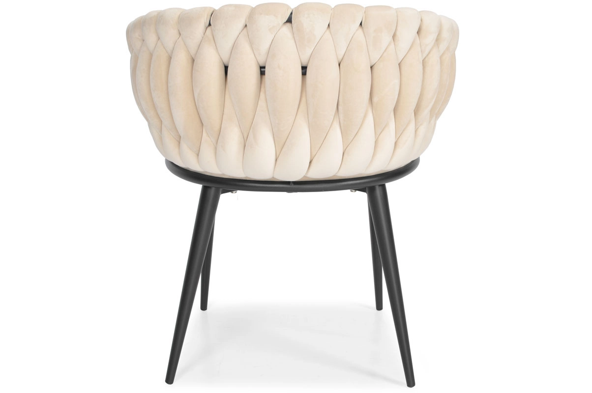 Elegante poltrona in velluto beige che unisce aspetto lussuoso, moderna imbottitura intrecciata e stabili gambe in metallo nero. La forma a bozzolo con braccioli offre alto comfort sia al tavolo da pranzo che in salotto e, grazie allo schienale tessuto 3D, dona all’ambiente un deciso effetto “wow”.