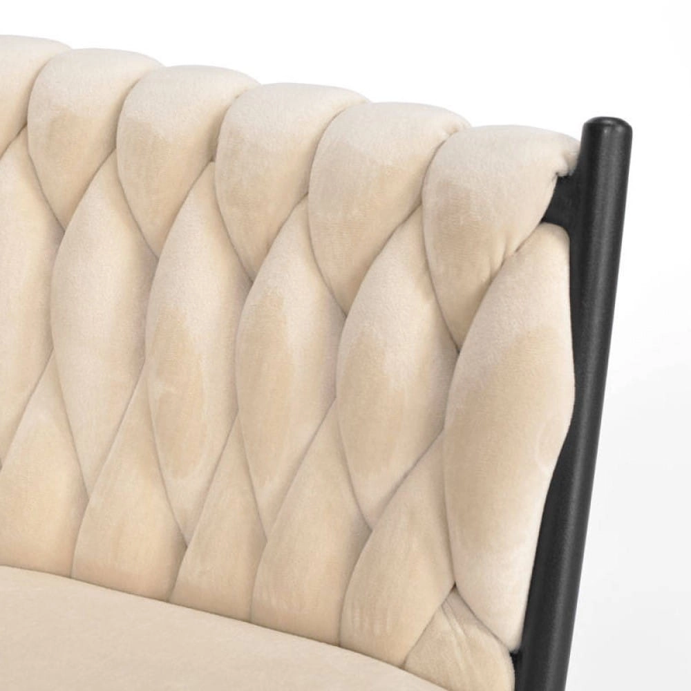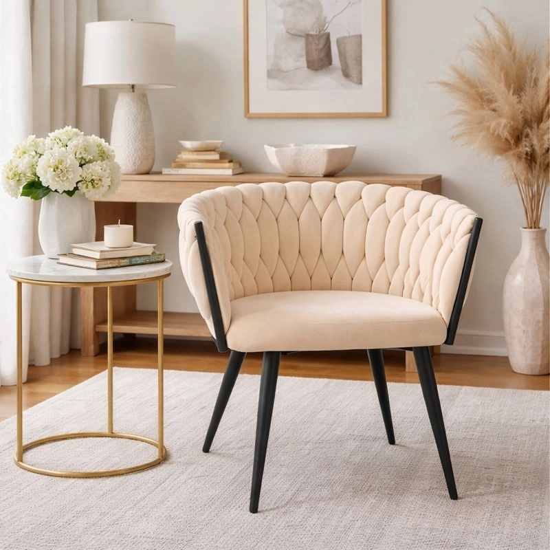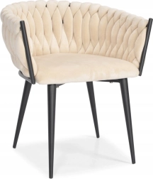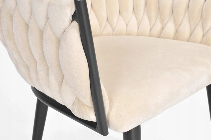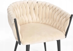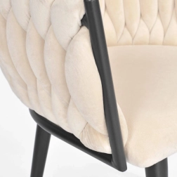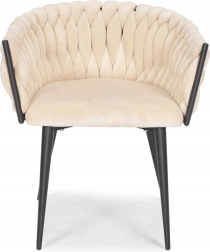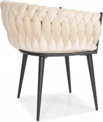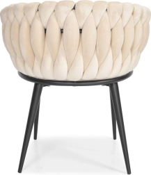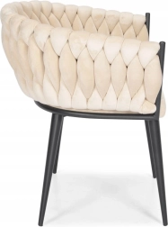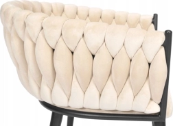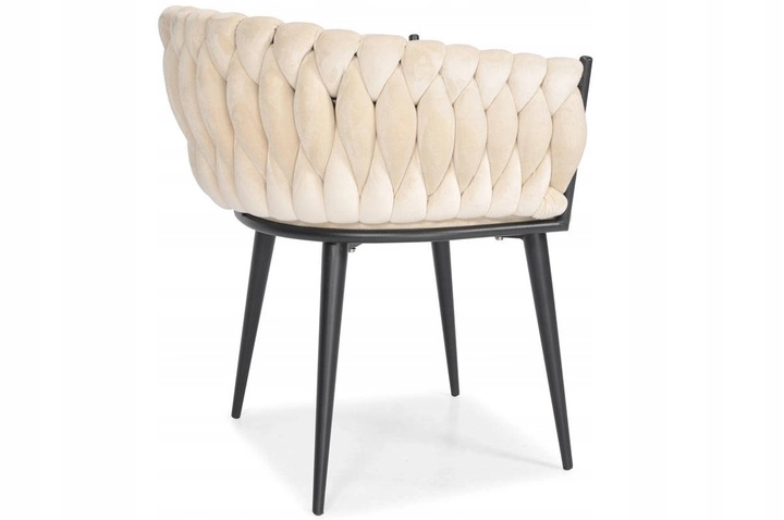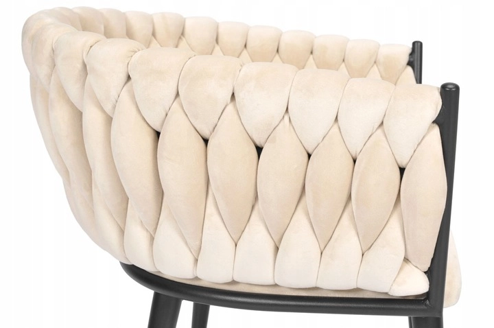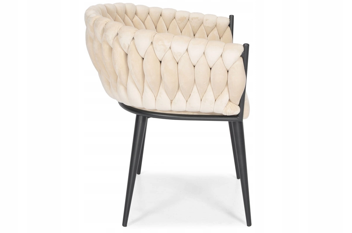 Elegante poltrona in velluto beige che unisce aspetto lussuoso, moderna imbottitura intrecciata e stabili gambe in metallo nero. La forma a bozzolo con braccioli offre alto comfort sia al tavolo da pranzo che in salotto e, grazie allo schienale tessuto 3D, dona all’ambiente un deciso effetto “wow”.