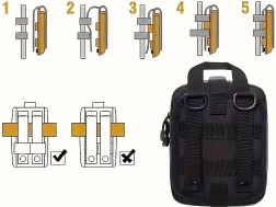 Fissaggio facile e sicuro a zaino, gilet o cintura tramite cinghie e bottoni a pressione MOLLE. Adatto a uso tattico e outdoor.