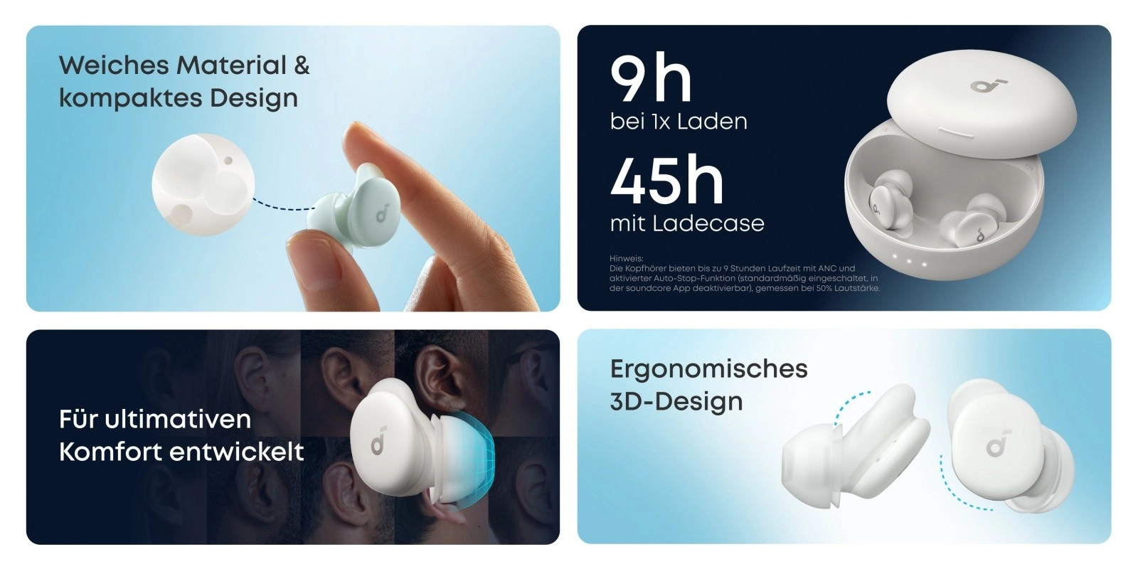Soundcore Sleep A30 sono cuffie specializzate progettate appositamente per il sonno. L’attiva cancellazione del rumore (ANC) intelligente con tecnologia di adattamento al condotto uditivo si calibra dinamicamente alle tue orecchie e offre una riduzione più profonda dei rumori disturbanti – dal russare ai suoni degli animali fino al fruscio degli elettrodomestici o al traffico urbano. La combinazione di AI Brainwave Audio con frequenze binaurali aiuta a sincronizzare le onde cerebrali con schemi rilassanti, favorendo un addormentamento più rapido e una migliore rigenerazione.