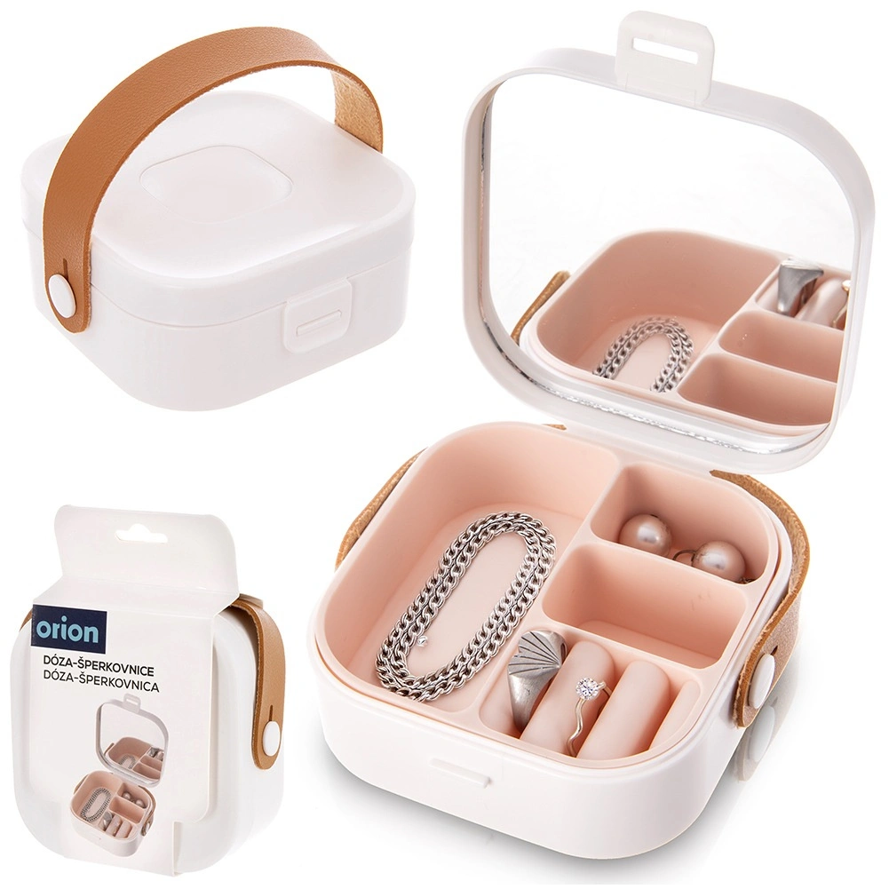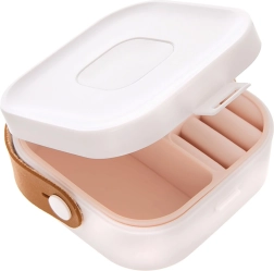 Elegante portagioie da viaggio che aiuta a mantenere in ordine i tuoi accessori a casa e in movimento. Le dimensioni compatte 9,5 × 9,5 × 4 cm si adattano al bagaglio a mano, mentre la struttura interna intelligente protegge i piccoli oggetti da danni e grovigli. Il resistente design in plastica bianca è completato da un passante ribaltabile in ecopelle per un trasporto agevole.