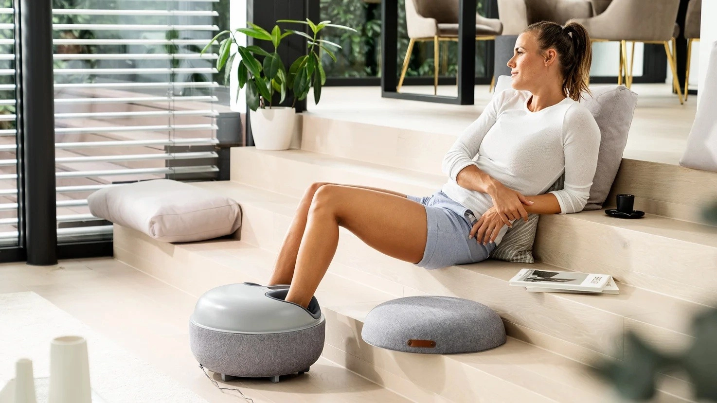 Con il coperchio inserito, il massaggiatore si trasforma in un elegante poggiapiedi. I tessuti di qualità e la forma compatta si integrano perfettamente in qualsiasi ambiente moderno.