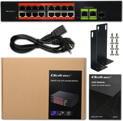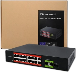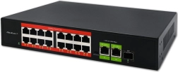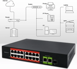 Affidabile switch di rete con funzione Plug & Play per casa e azienda. Offre 16 porte 10/100 Mb/s con PoE, 2 porte uplink RJ45 gigabit e 1 porta SFP gigabit per collegamenti in fibra. Supporta IEEE 802.3af con potenza 15,4 W per porta e fino a 250 W complessivi, dispone di raffreddamento passivo per un funzionamento silenzioso e di un robusto chassis in metallo.