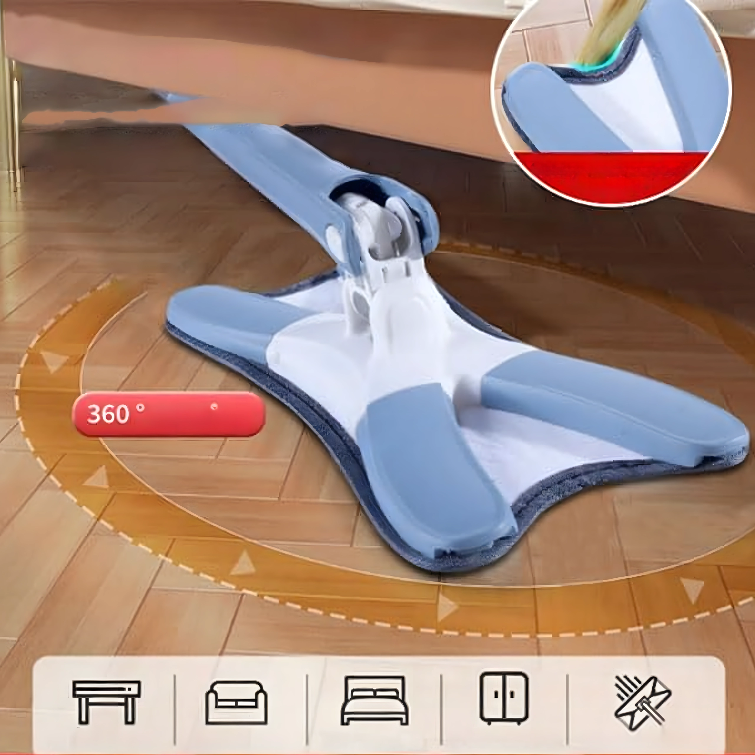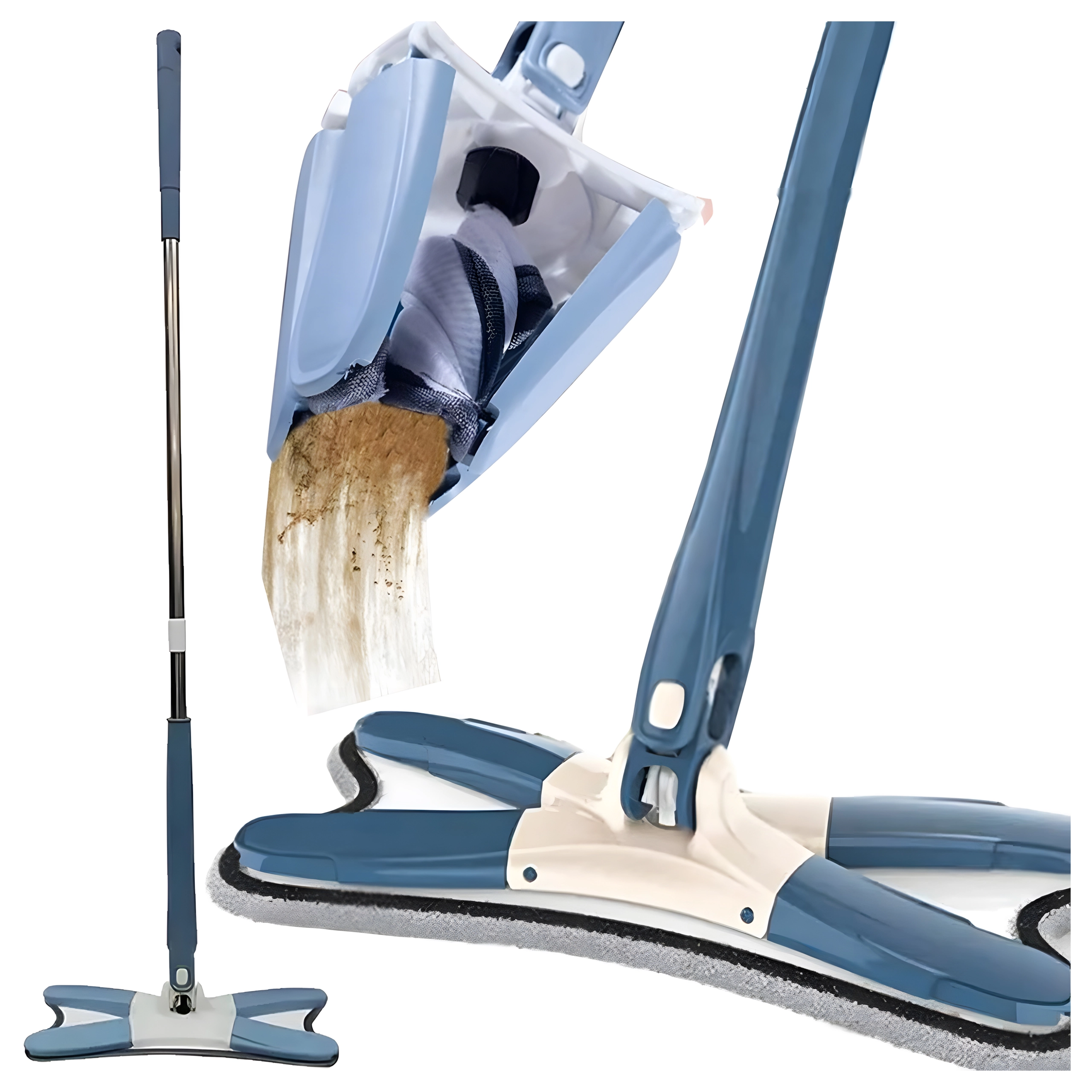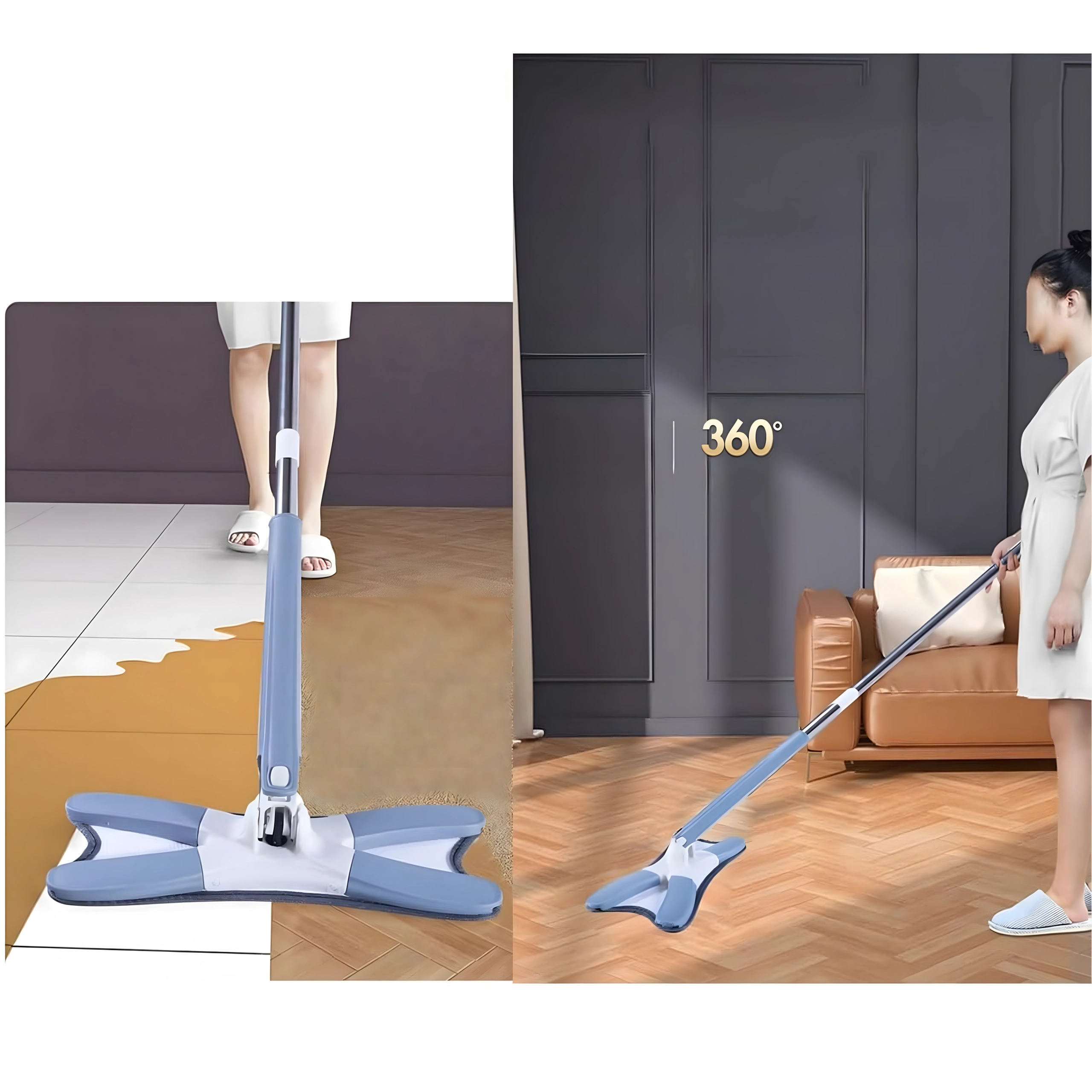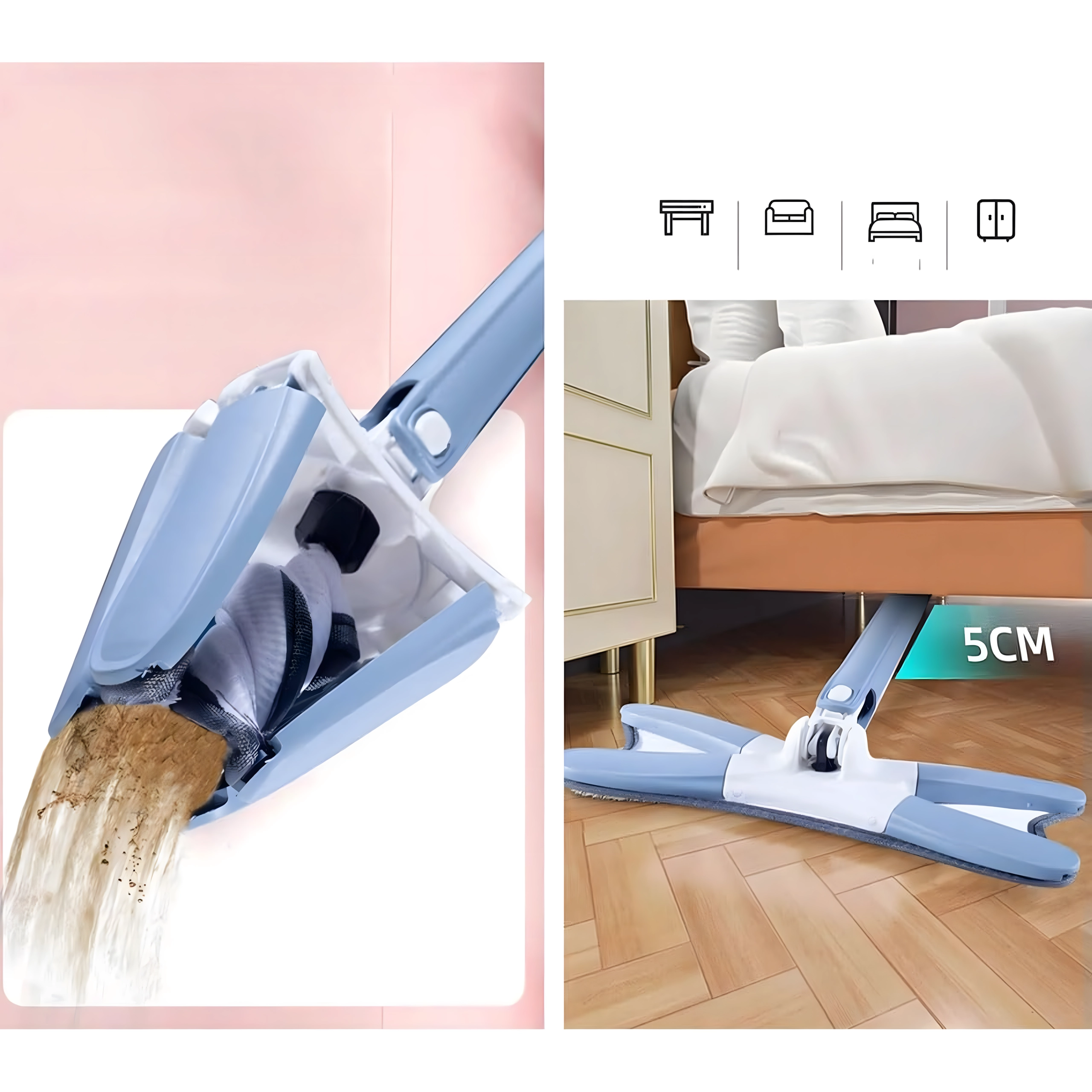 Pratico mocio piatto con testa girevole e meccanismo integrato per una facile strizzatura senza bagnarsi le mani. Grazie alla testa larga e al microfibra raccoglie efficacemente polvere e sporco su tutti i pavimenti duri. Include rivestimento di ricambio, struttura pieghevole a X e asta telescopica per una pulizia comoda anche negli angoli e sotto i mobili.