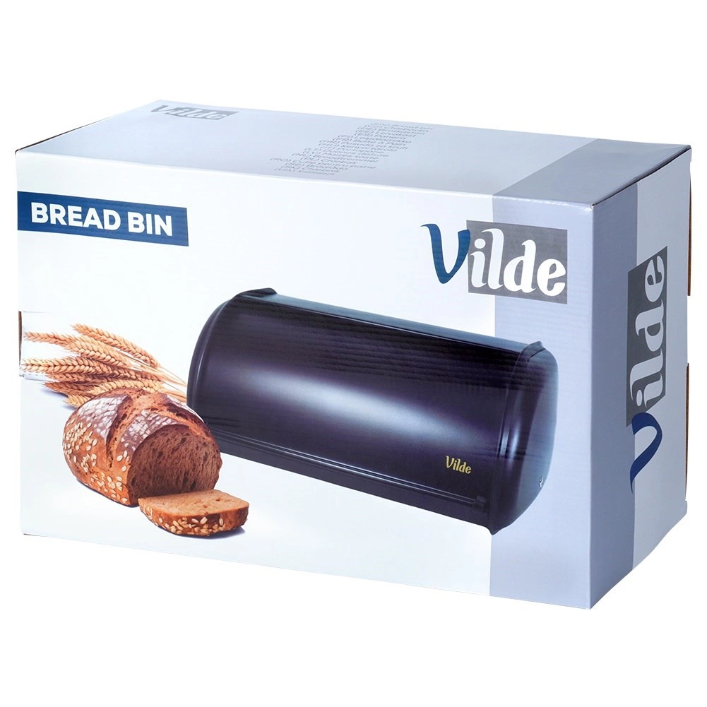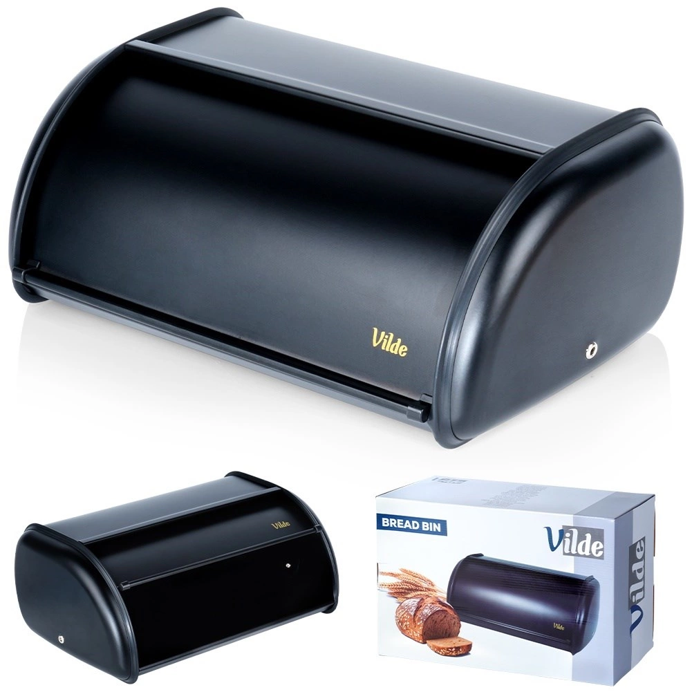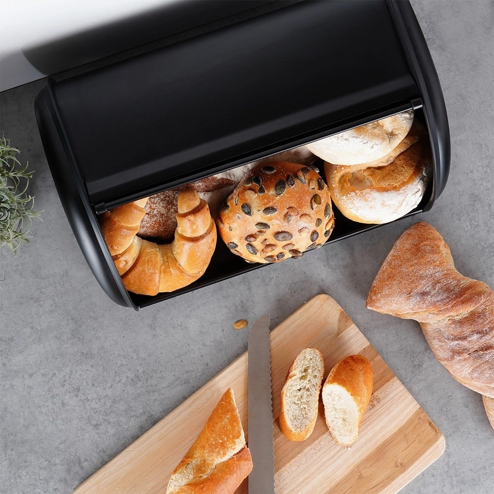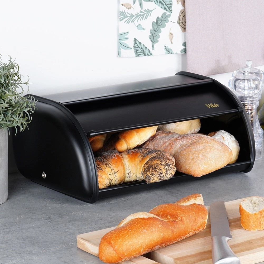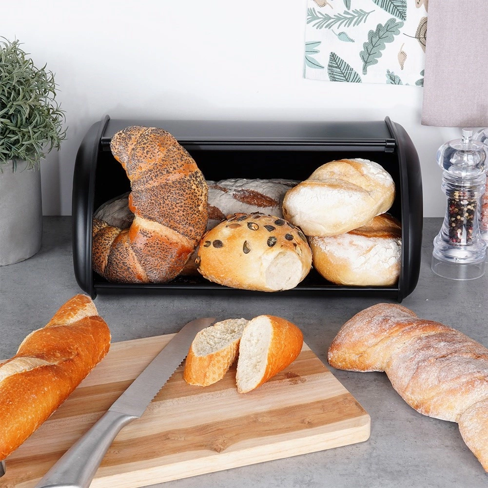 Elegante portapane nero in resistente acciaio inox che mantiene i tuoi prodotti da forno freschi più a lungo e allo stesso tempo tiene in ordine il piano di lavoro. Grazie allo spazio per diversi tipi di pane e al pratico coperchio scorrevole a rullo, l’uso quotidiano è rapido e comodo. Design moderno, finitura opaca e robusta struttura metallica completano perfettamente qualsiasi cucina.