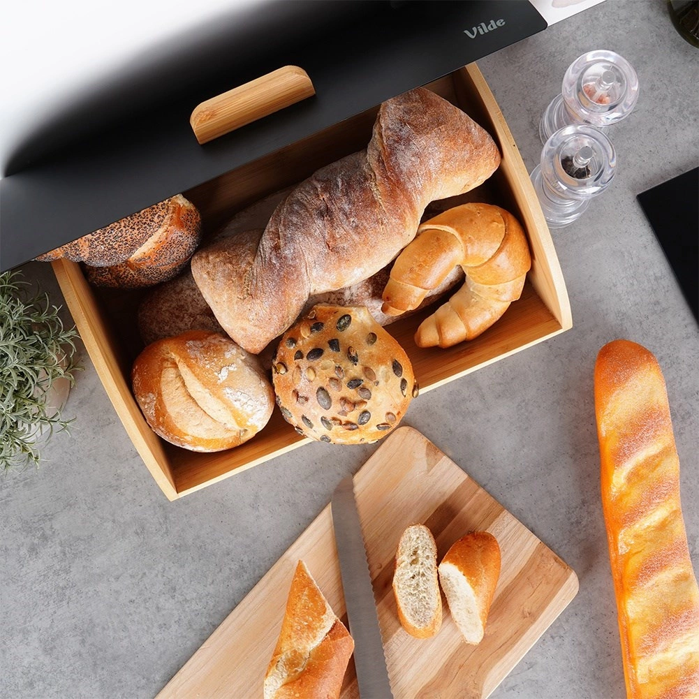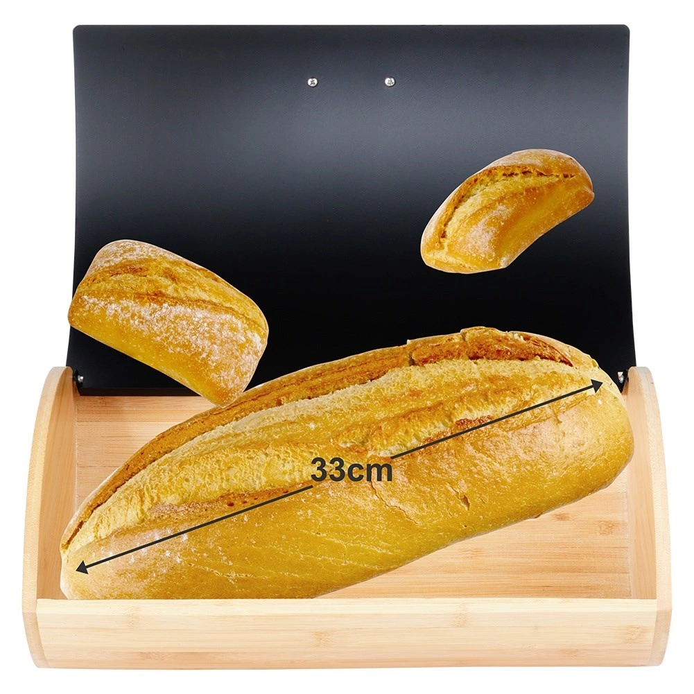 Pratico e stiloso, il portapane con dimensioni 35,5 × 24,5 × 15,5 cm è ideale per conservare quotidianamente pane, panini e dolci da forno. Il corpo in bambù è leggero e resistente, mentre il coperchio in metallo verniciato a polvere in nero opaco ha un aspetto moderno e resiste all’uso di tutti i giorni.