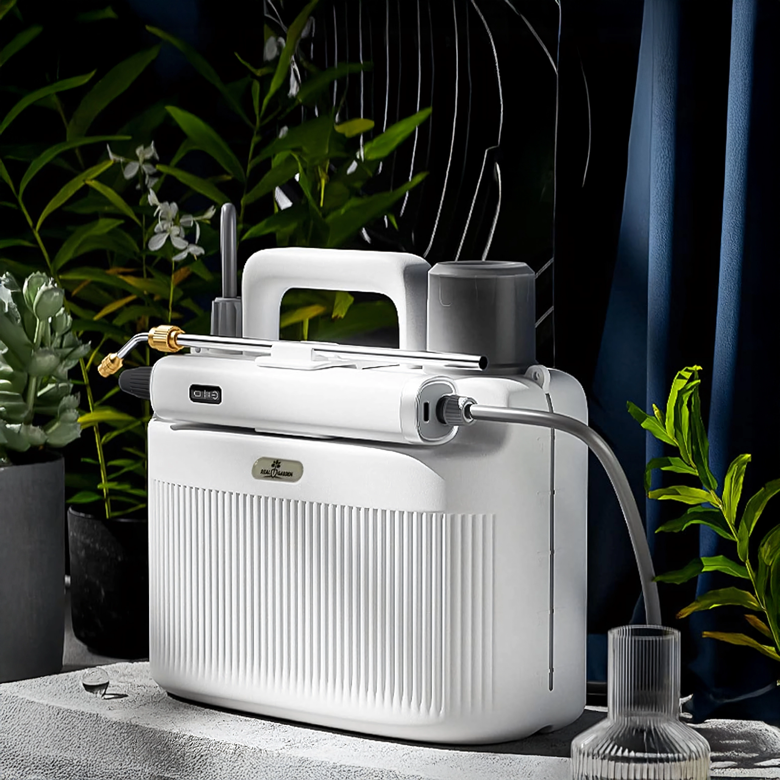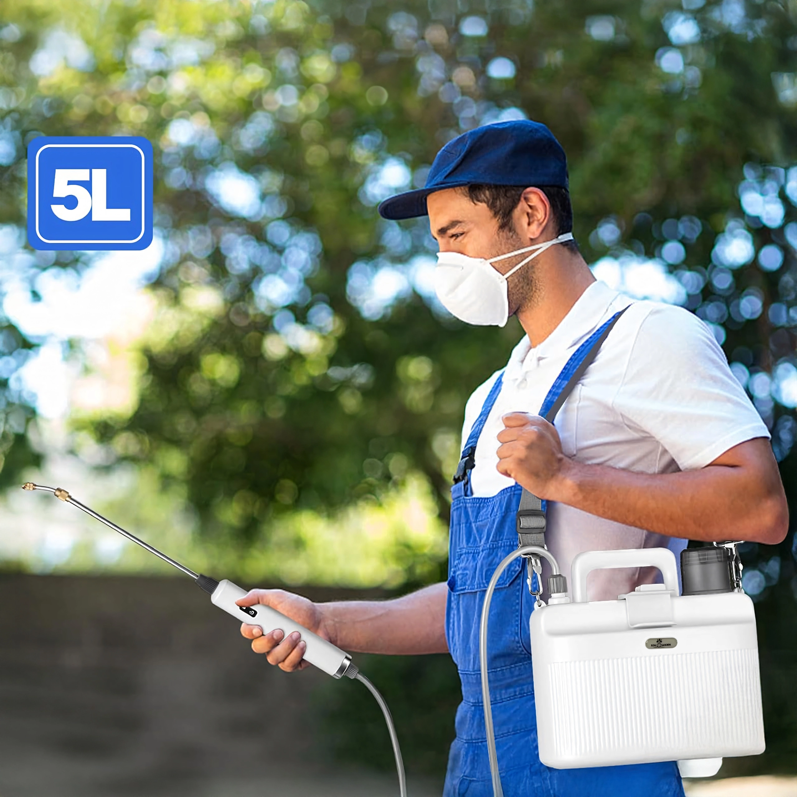 Pratico e leggero irroratore da giardino elettrico 5 l con batteria da 2200 mAh che facilita l’annaffiatura, la nebulizzazione e la disinfezione. Offre una dispersione fine e uniforme, un comodo controllo con una sola mano e mobilità grazie alla tracolla – ideale per serre, terrazze e manutenzione domestica.