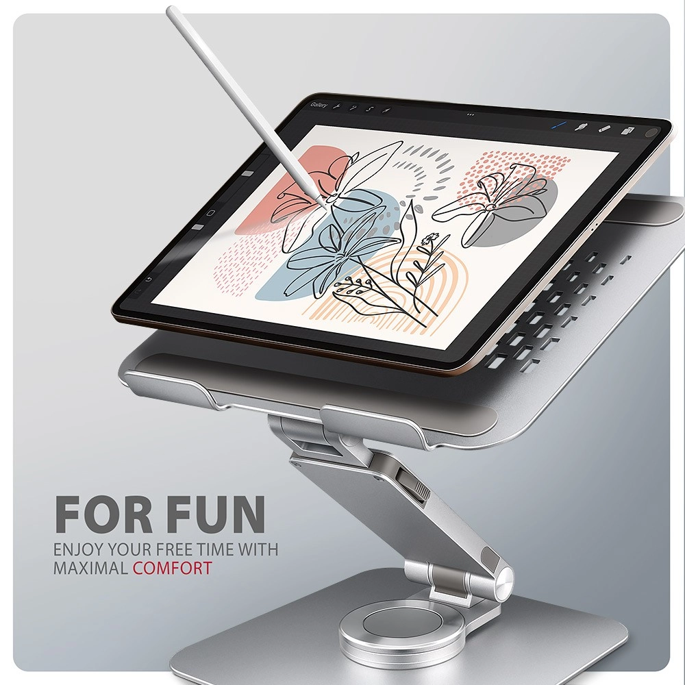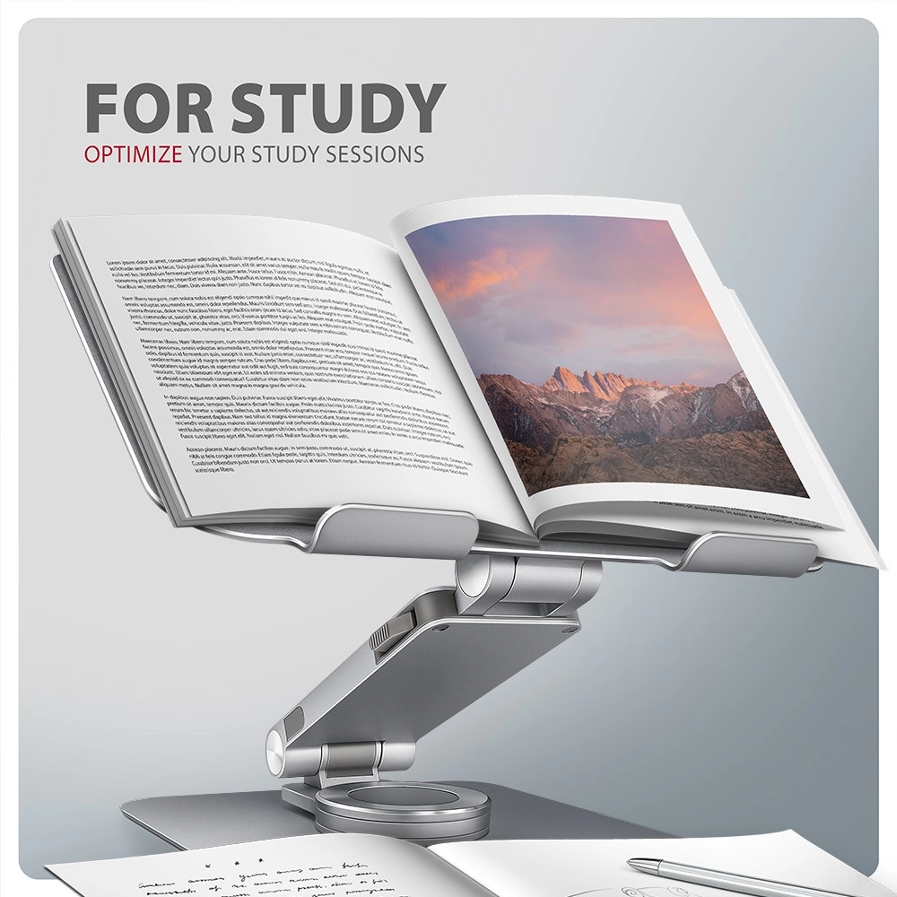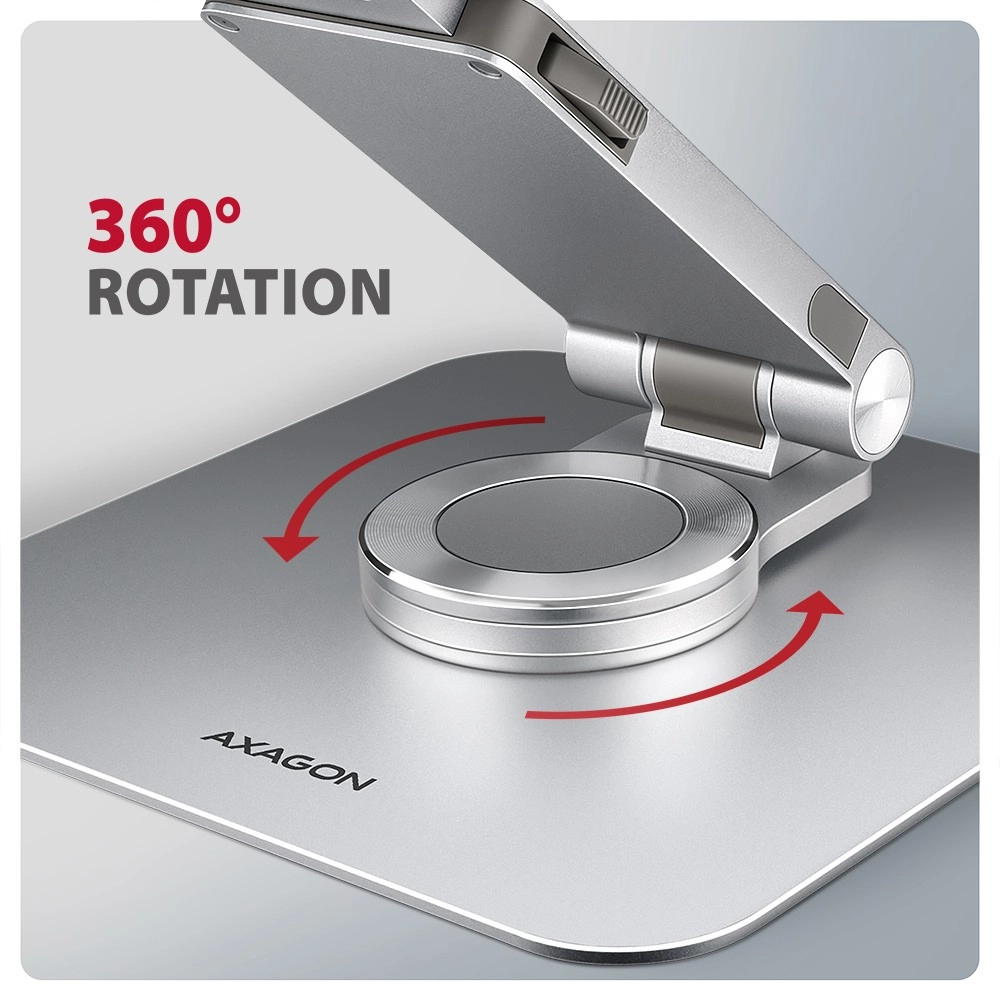 AXAGON STND-LR è un supporto studiato per notebook e tablet che aumenta l’ergonomia sia a casa che in ufficio. La rotazione a 360° permette di condividere facilmente lo schermo o cambiare orientamento senza spostare la base, mentre il doppio snodo e la regolazione dell’inclinazione aiutano a impostare altezza e angolo ideali per alleviare la cervicale.