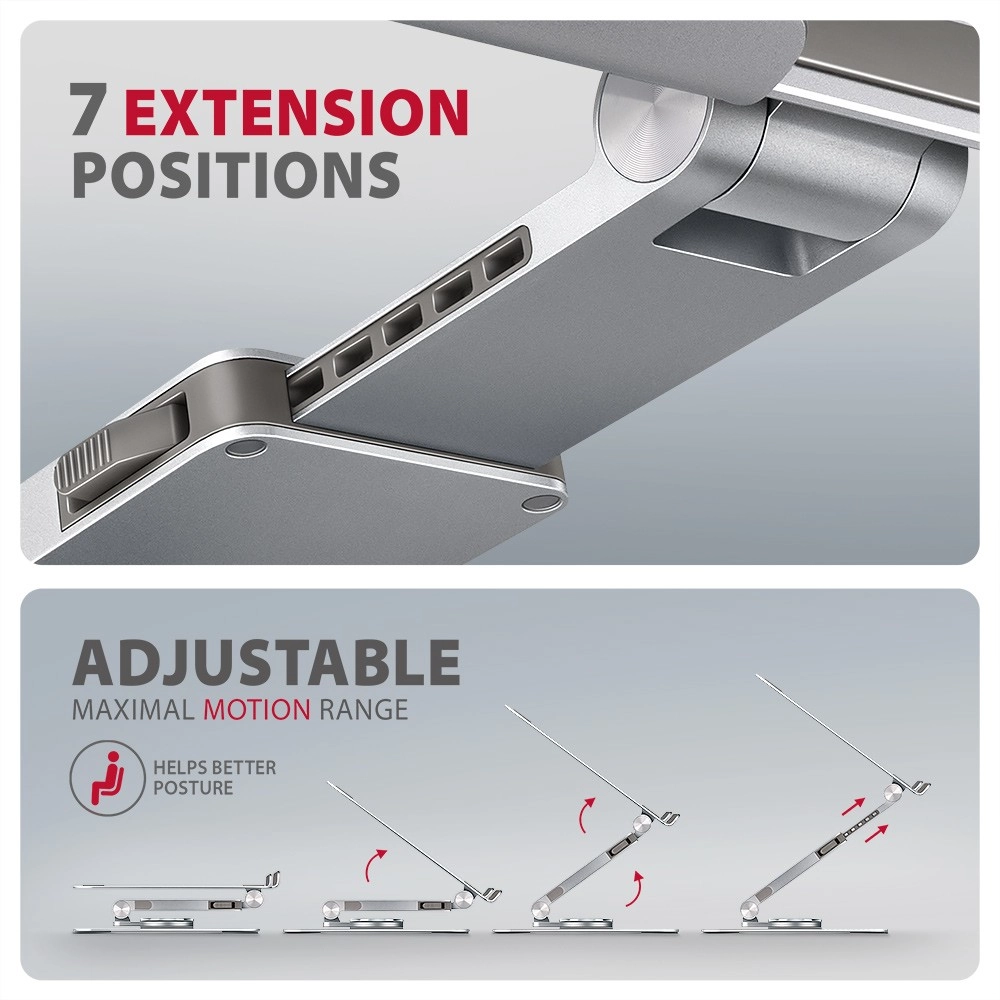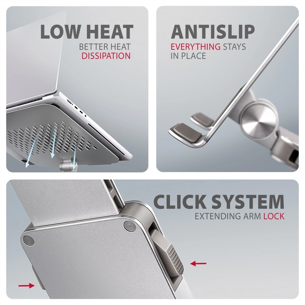 Il particolare braccio estensibile con blocco (fino a 60 mm, 7 posizioni) avvicina il display alla distanza ottimale degli occhi e lo allinea al monitor esterno. Le fusioni in alluminio assicurano robustezza e lunga durata, il rivestimento antiscivolo mantiene il dispositivo saldo in posizione e le aperture di ventilazione favoriscono un raffreddamento efficiente per maggiore prestazioni e longevità del notebook.