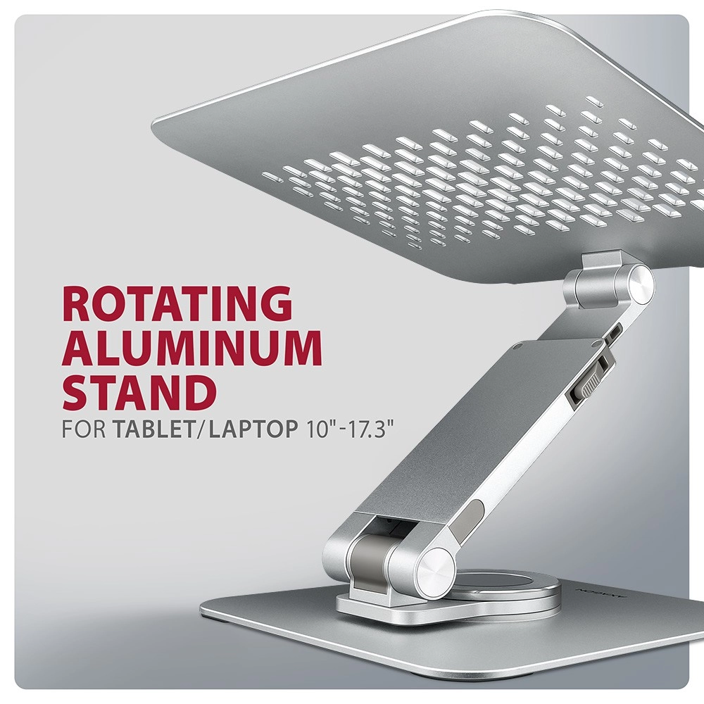 Supporto ergonomico in alluminio per notebook AXAGON STND-LR con meccanismo girevole a 360°, regolazione in altezza e inclinazione regolabile per migliorare il comfort durante il lavoro. Adatto a dispositivi 10–17,3″, offre un braccio estensibile con blocco, struttura metallica stabile e superfici antiscivolo per un uso sicuro e un migliore smaltimento del calore.