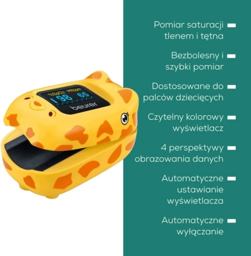Il pulsossimetro per bambini Beurer PO 13 Kids, dalla simpatica forma di giraffa, offre una misurazione indolore della saturazione di ossigeno (SpO2) e del battito cardiaco in pochi secondi. È adattato ai piccoli polpastrelli dei bambini, ha un display a colori con orientamento automatico e fornisce risultati affidabili per il controllo della salute a casa.