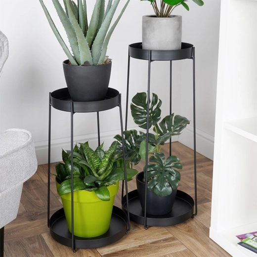 Scoprite un modo moderno per valorizzare le vostre piante da interno. I supporti a due livelli in elegante nero assicurano un’esposizione estetica, migliore circolazione dell’aria e una manutenzione più semplice dell’area circostante. L’unione di linee sottili e solidi vassoi in metallo con bordo si integra perfettamente negli interni in stile loft, moderno e scandinavo.
