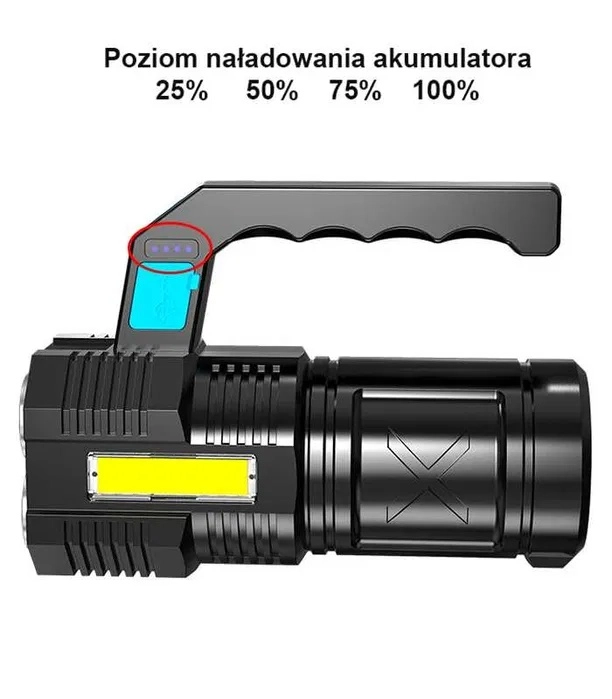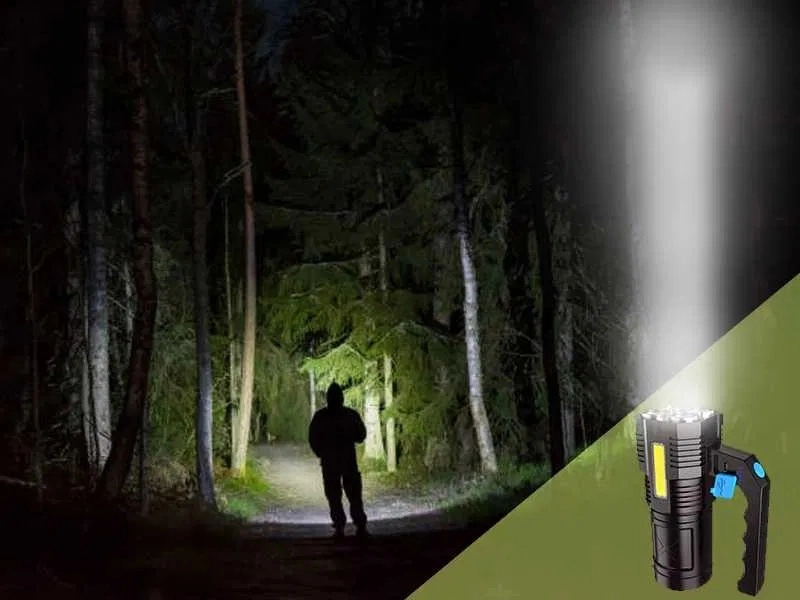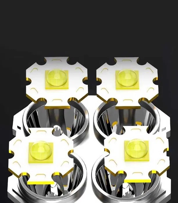 Il fascio principale con 4× T6 LED fornisce un raggio potente e direzionato fino a 200 m. Il pannello laterale COB crea una luce di lavoro ampia e confortevole senza abbagliare – ideale per camminate, campeggio o riparazioni.