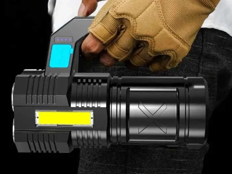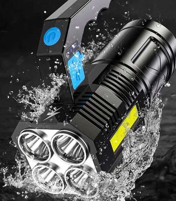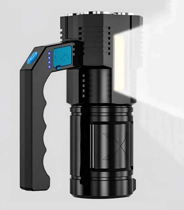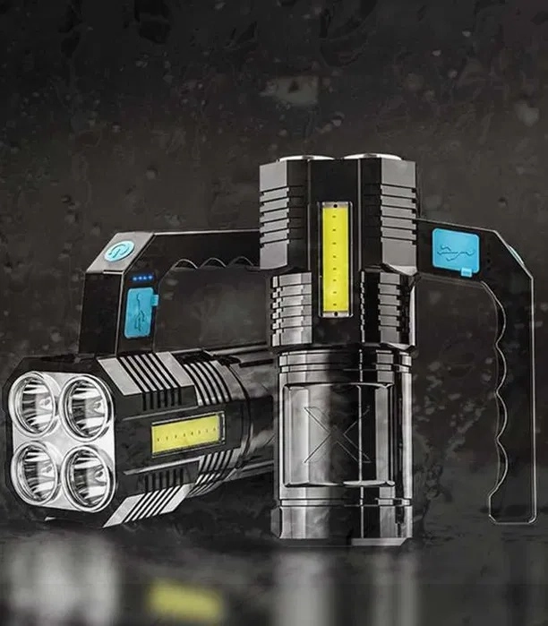 Questa torcia LED resistente e impermeabile combina un potente fascio principale con quattro LED T6 e una pratica luce di lavoro laterale COB per un’illuminazione diffusa senza abbagliamento. Si ricarica comodamente via USB e la batteria 18650 di qualità garantisce un funzionamento affidabile in casa, in auto e durante le attività outdoor.