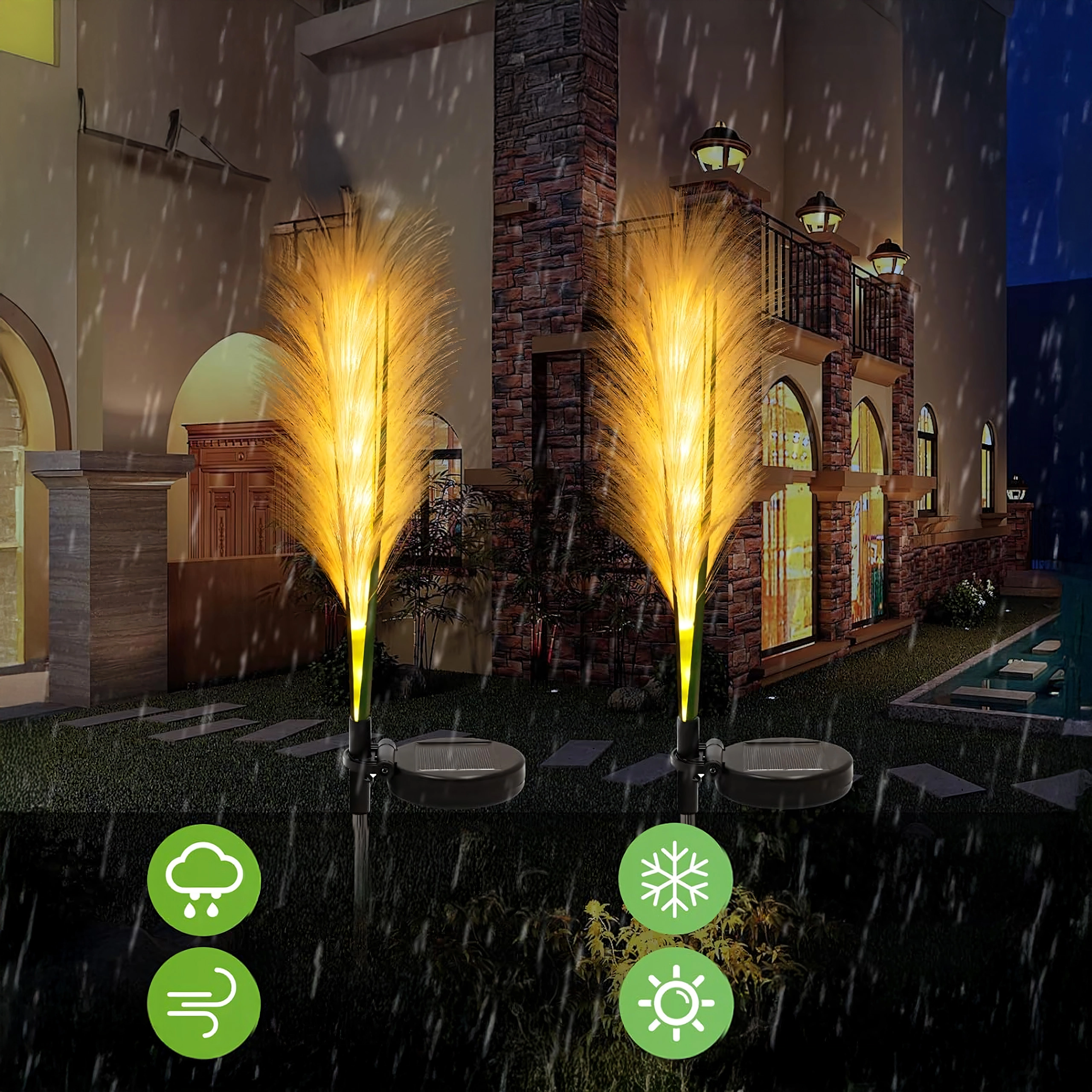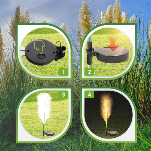 Porta un'atmosfera magica nel tuo giardino con luci solari decorative a forma di erba delle pampas. Luce calda ed elegante, accensione automatica al crepuscolo, senza cavi né consumo dalla rete e installazione facile con picchetto nel terreno – ideali lungo i vialetti, le aiuole e il prato.