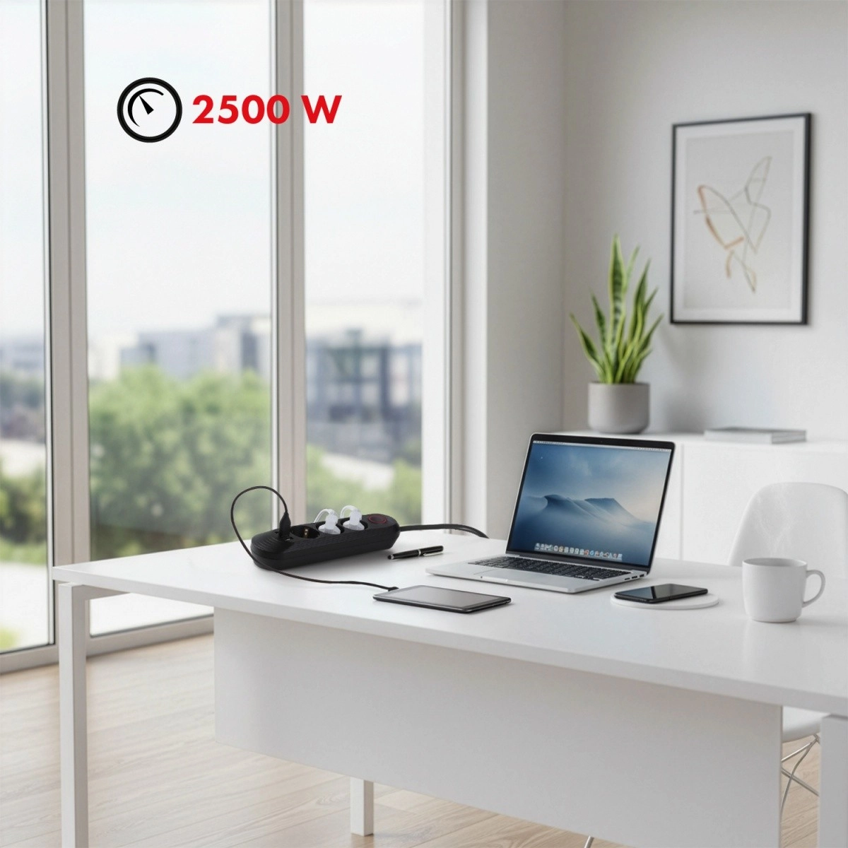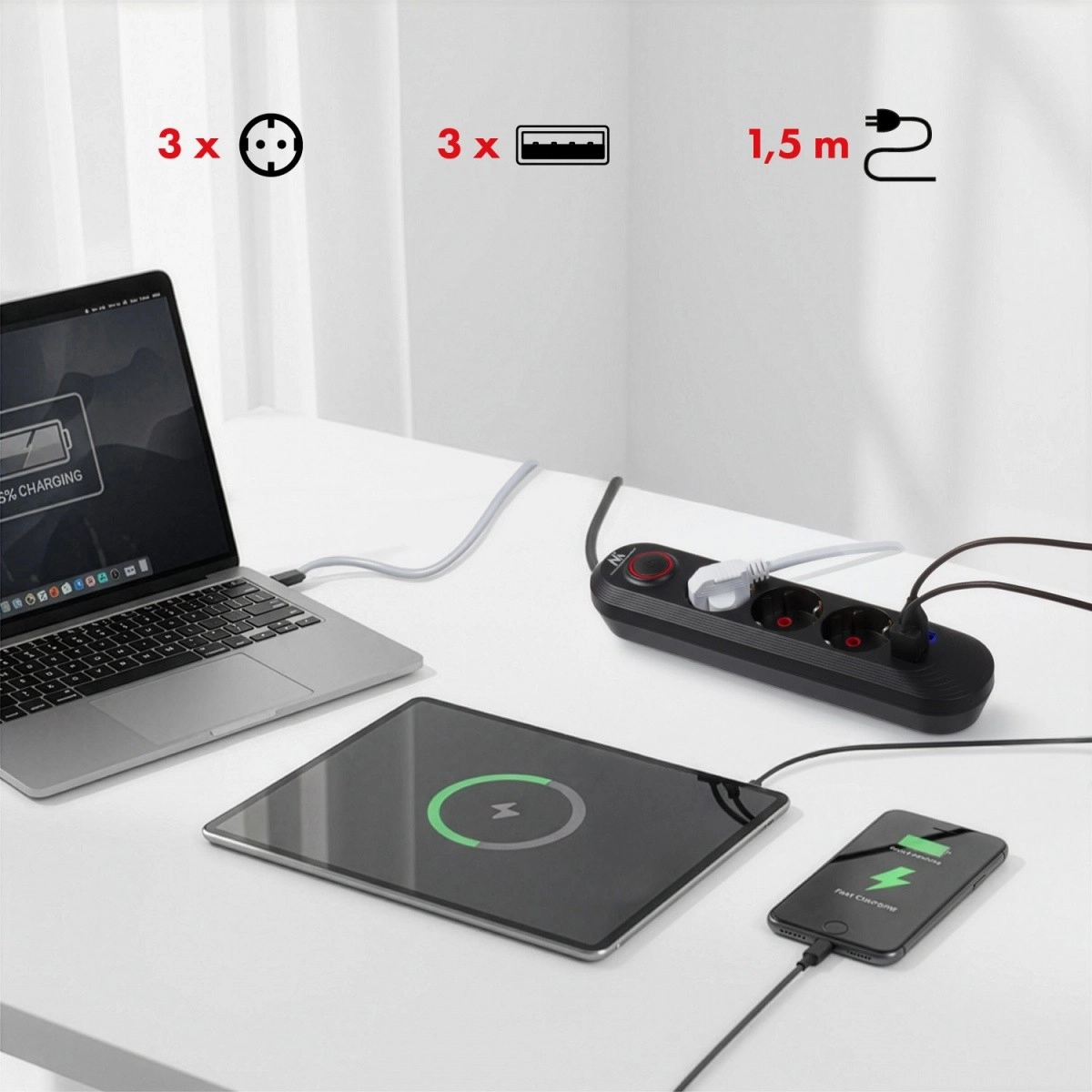 Metti ordine ai cavi e alimenta tutto da un unico punto. Questa multipresa con 3 prese di rete e 3 porte USB gestisce comodamente notebook, lampada e ricarica di telefono o tablet. Grazie all’ingresso universale 110–240 V AC / 50–60 Hz e alla potenza fino a 2500 W garantisce un funzionamento affidabile ogni giorno.
