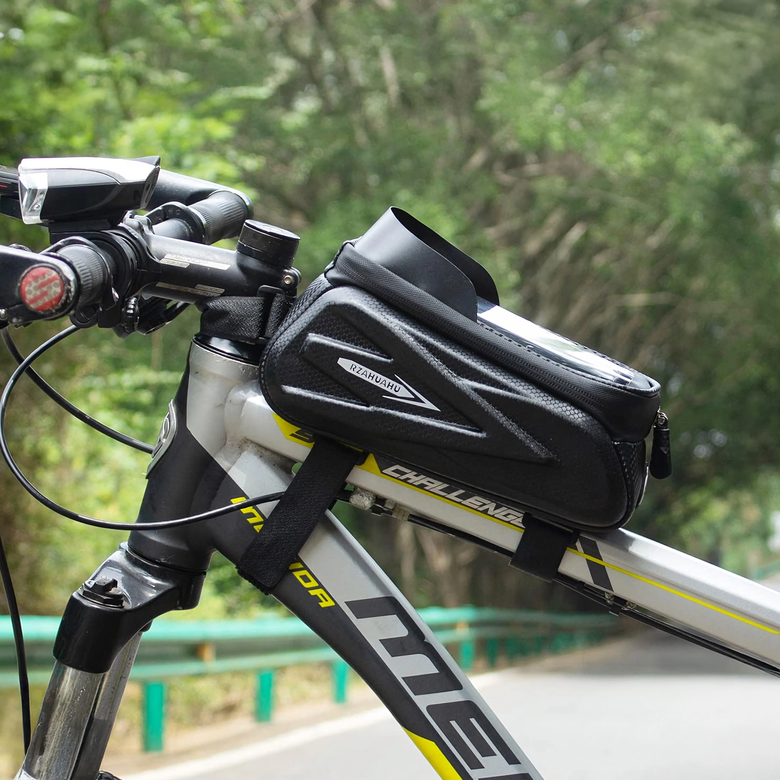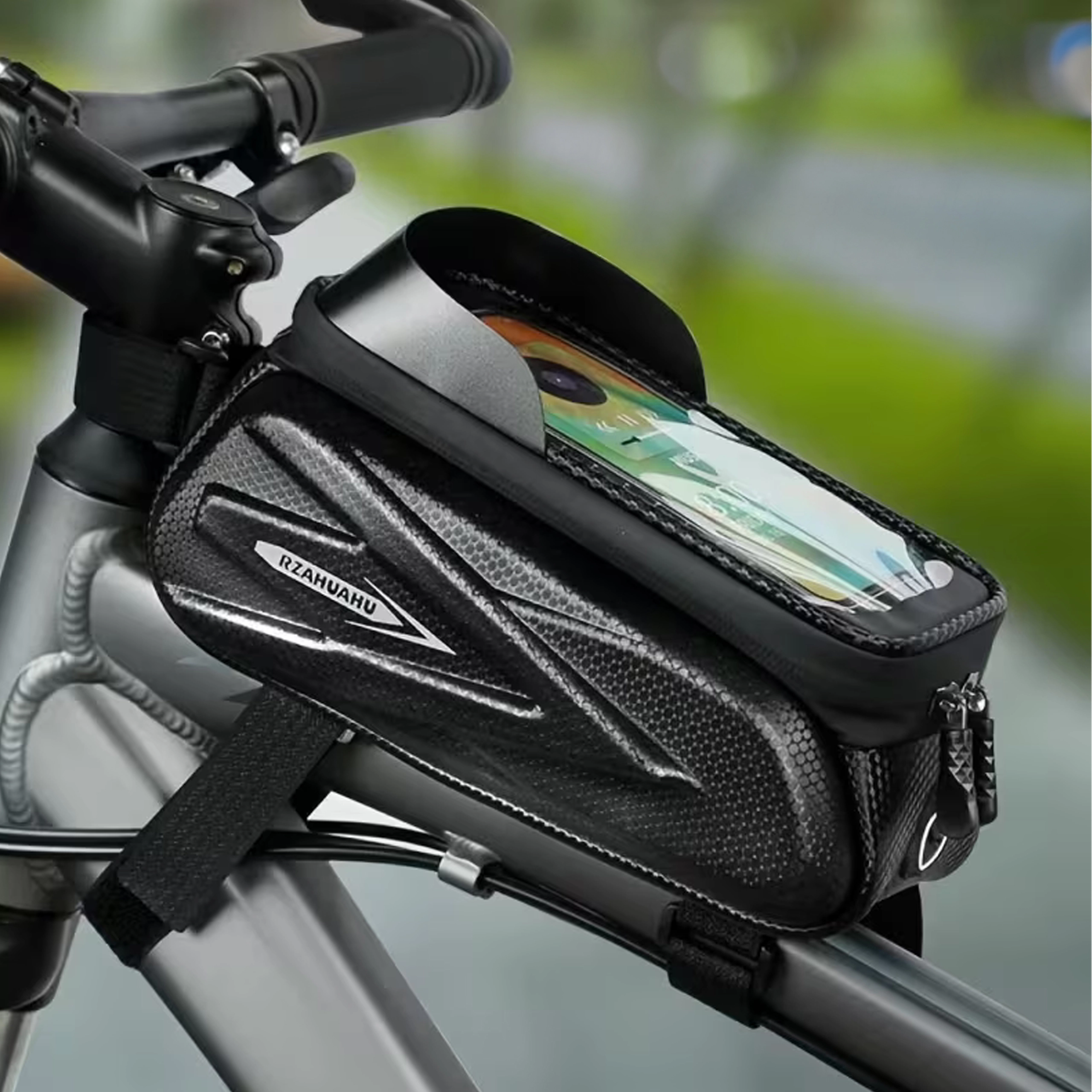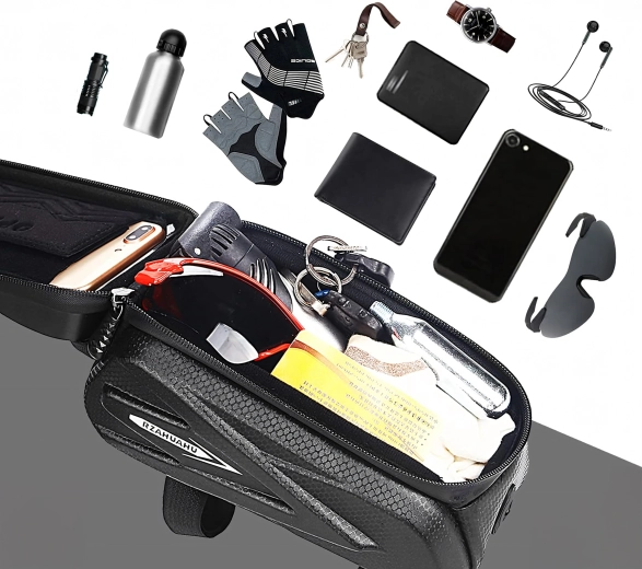 Pratica borsa da telaio per tubo orizzontale con custodia trasparente per smartphone che consente il controllo tramite schermo tattile, offre cerniere impermeabili e un corpo semi‑rigido robusto per riporre in sicurezza chiavi, attrezzi o portafoglio. Grazie al montaggio rapido con velcro resta stabile e il telefono è sempre a portata di mano per navigazione e musica.