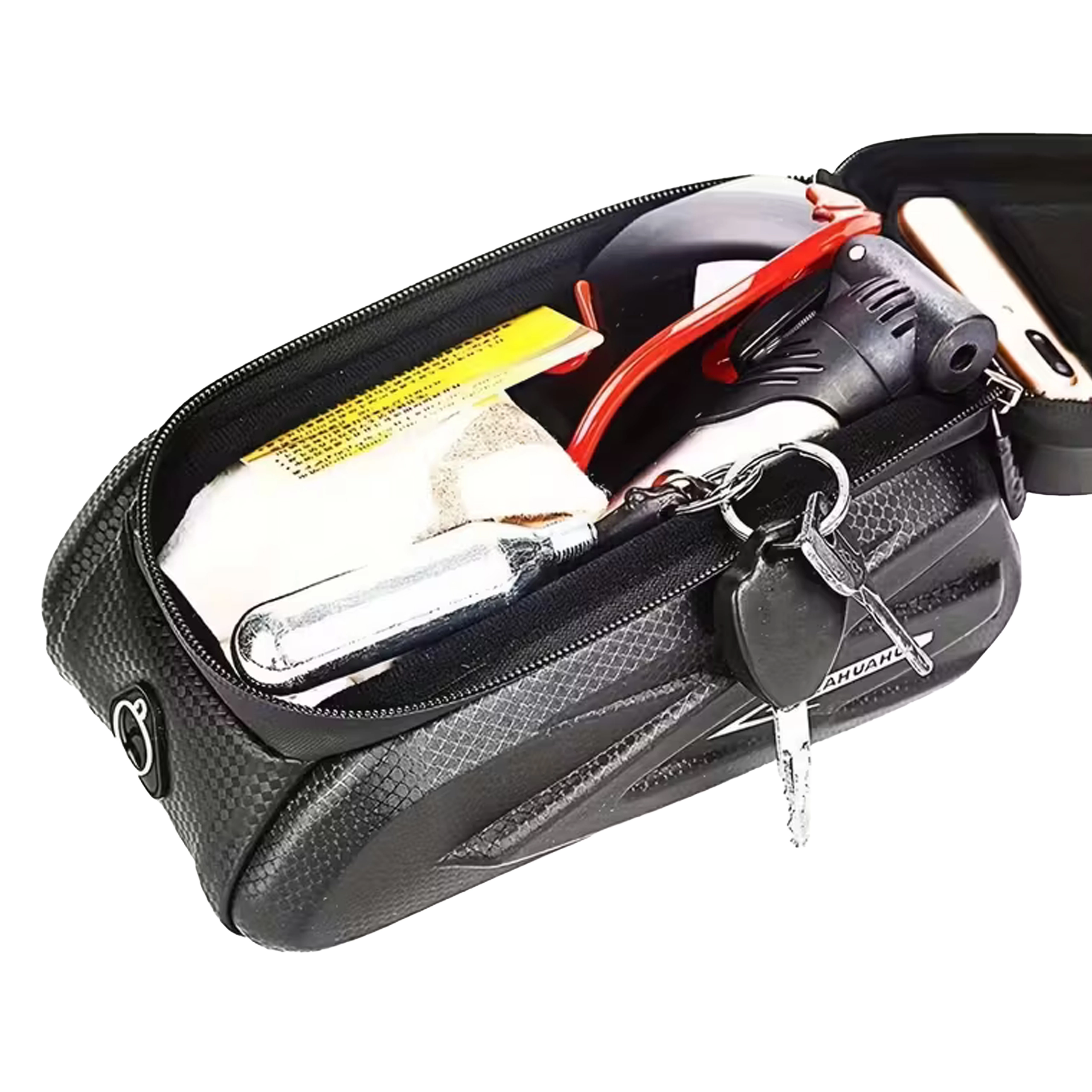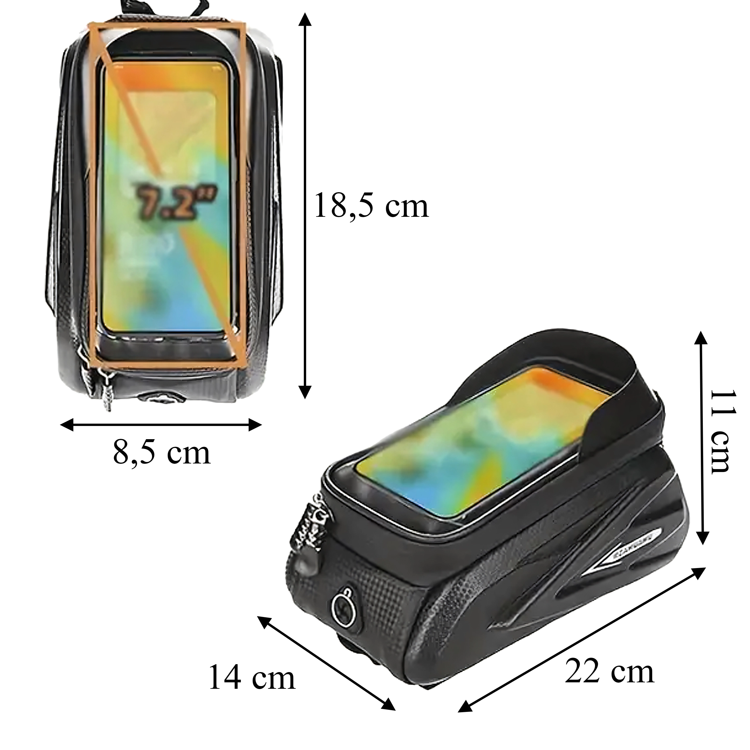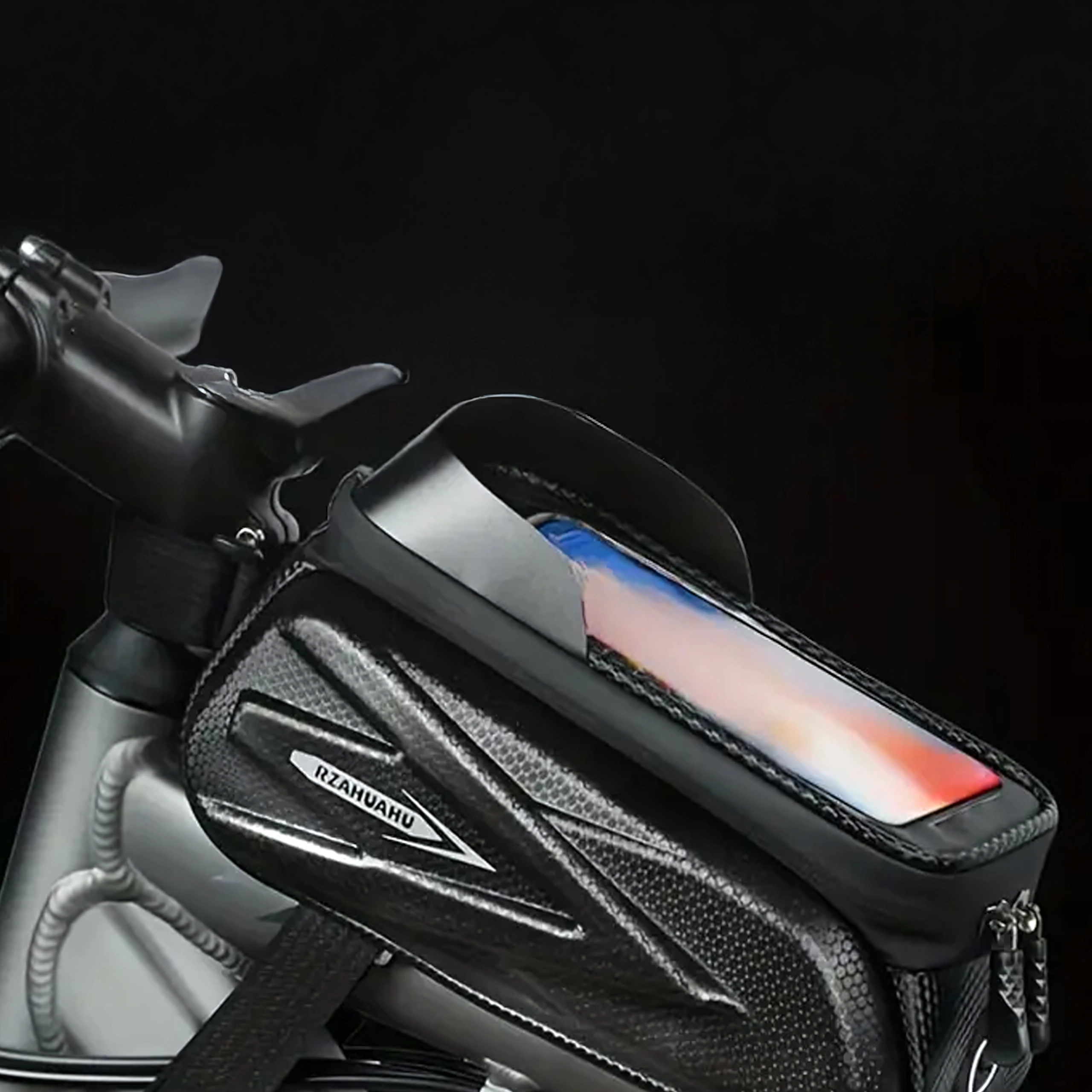 Pratica borsa da telaio per tubo orizzontale con custodia trasparente per smartphone che consente il controllo tramite schermo tattile, offre cerniere impermeabili e un corpo semi‑rigido robusto per riporre in sicurezza chiavi, attrezzi o portafoglio. Grazie al montaggio rapido con velcro resta stabile e il telefono è sempre a portata di mano per navigazione e musica.