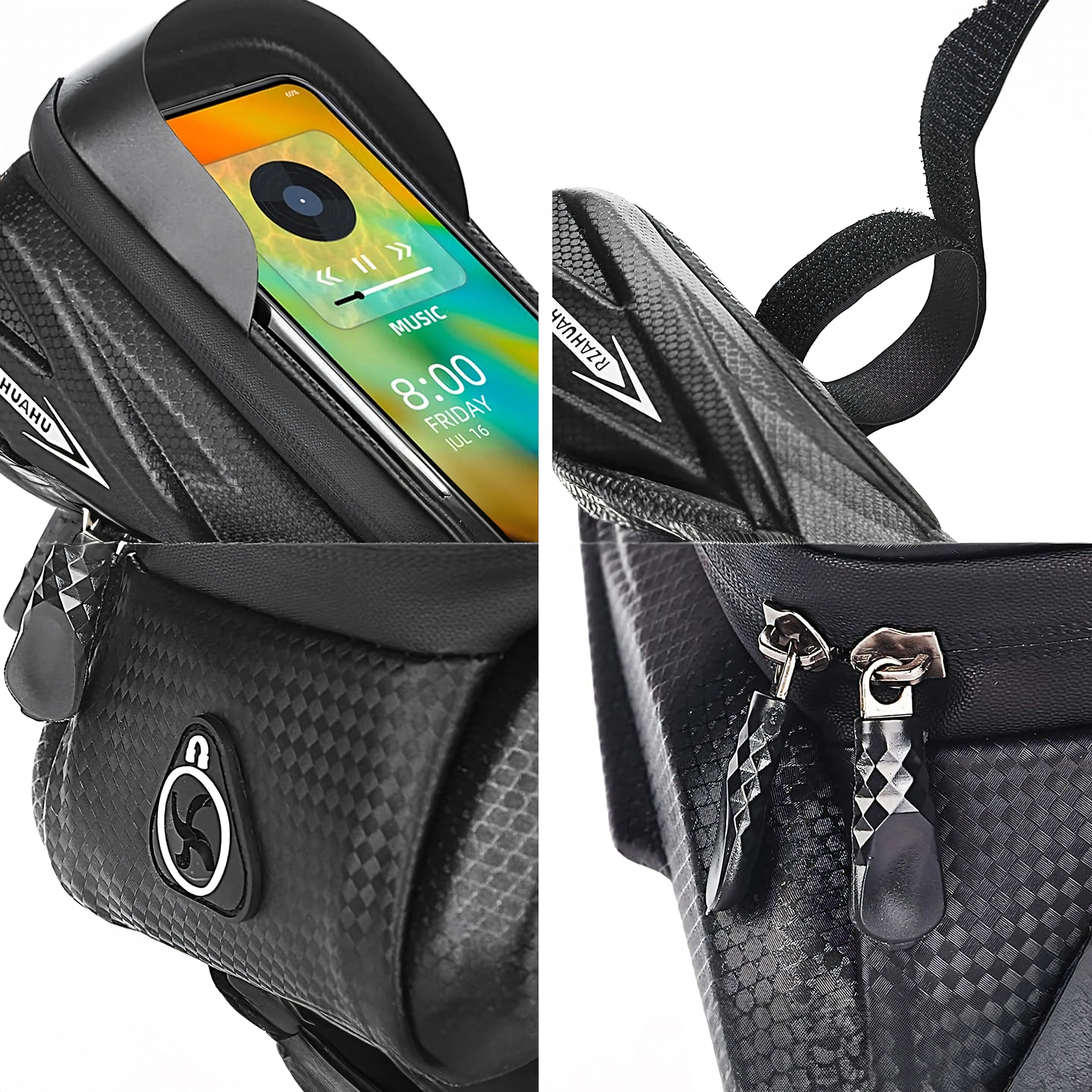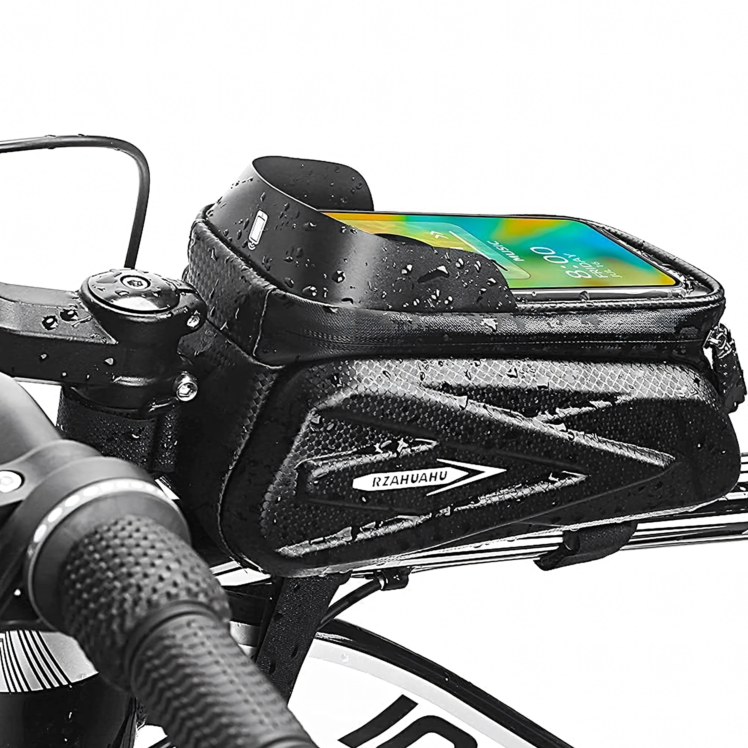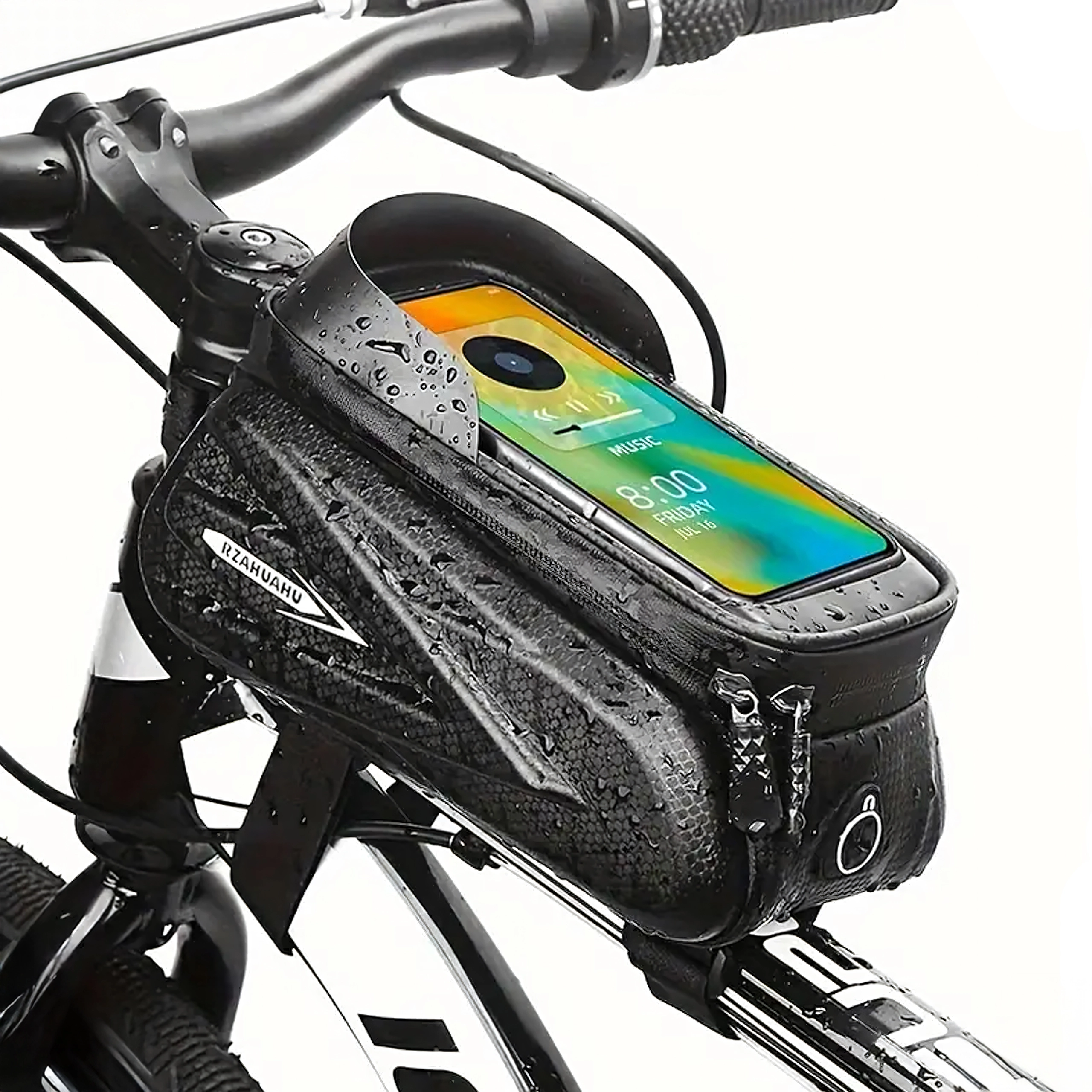 Questa elegante borsa impermeabile per il tubo orizzontale combina spazio per piccoli oggetti con una custodia trasparente per il tuo telefono. La pellicola touch consente di gestire comodamente la navigazione, rispondere alle chiamate o controllare il lettore senza estrarre lo smartphone. La struttura a guscio rigido e le cerniere sigillate proteggono il contenuto da spruzzi e polvere.