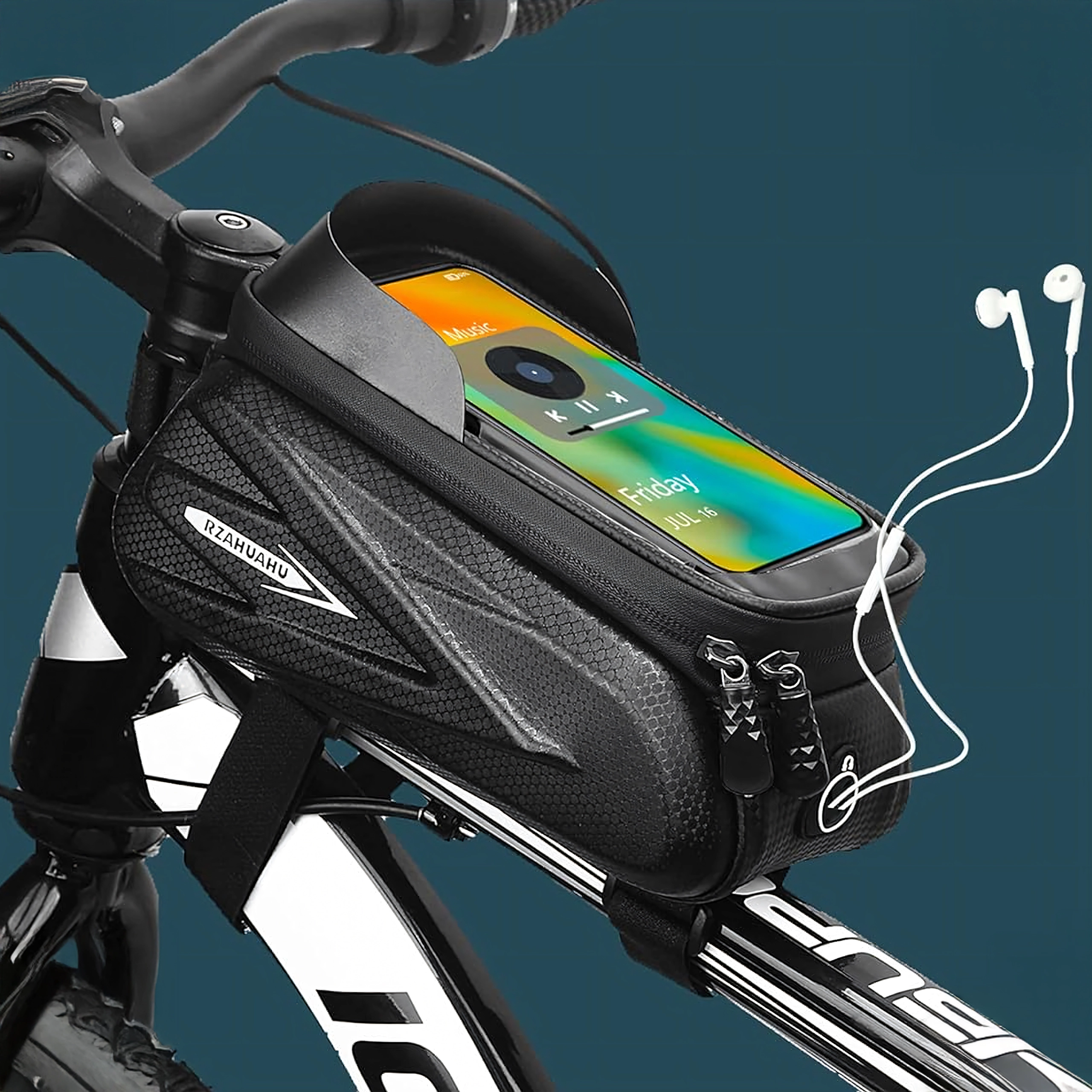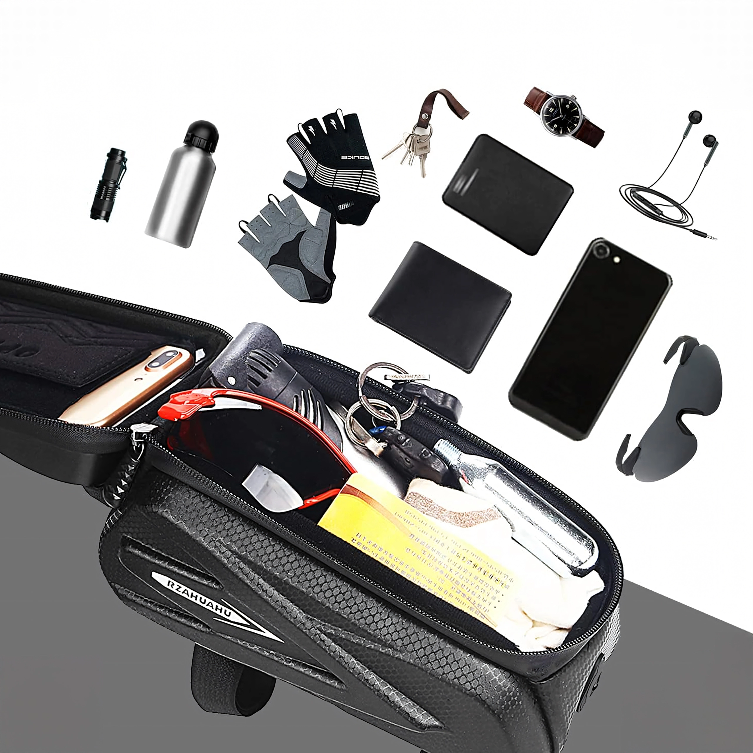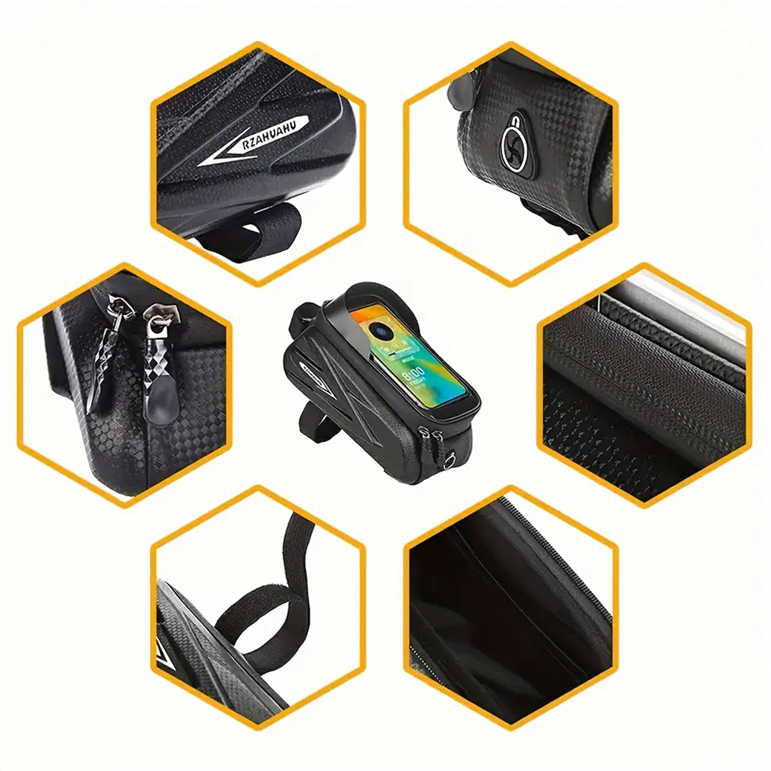 Questa elegante borsa impermeabile per il tubo orizzontale combina spazio per piccoli oggetti con una custodia trasparente per il tuo telefono. La pellicola touch consente di gestire comodamente la navigazione, rispondere alle chiamate o controllare il lettore senza estrarre lo smartphone. La struttura a guscio rigido e le cerniere sigillate proteggono il contenuto da spruzzi e polvere.