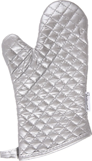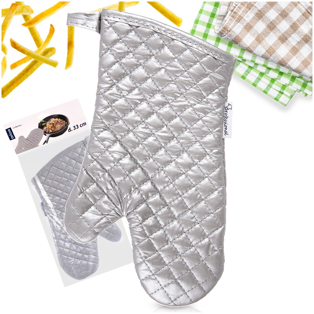 Pratico guanto da cucina in taglia universale che protegge le tue mani durante la manipolazione di stoviglie calde fino a 250 °C. Grazie alla isolazione multistrato, alla finitura protettiva argentata e alla impuntura antiscivolo, è leggero, resistente e confortevole per cucinare, cuocere e grigliare ogni giorno.