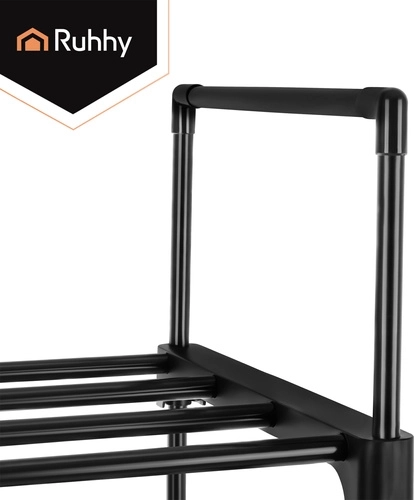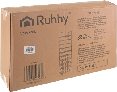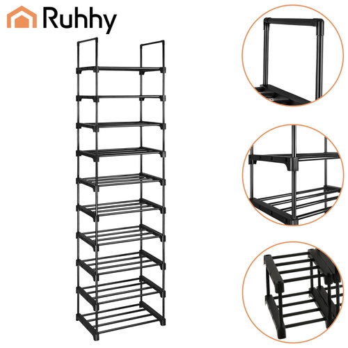 Scarpiera RUHHY alta e stretta con 10 ripiani, può contenere fino a 20 paia di scarpe e fa risparmiare spazio in ingresso e guardaroba. Struttura metallica stabile con portata fino a 50 kg, design aperto per una migliore circolazione dell’aria e pulizia facile. Grazie al montaggio modulare può essere assemblata come scaffale alto oppure divisa in due unità più basse; include anche una mensola aggiuntiva per pantofole.