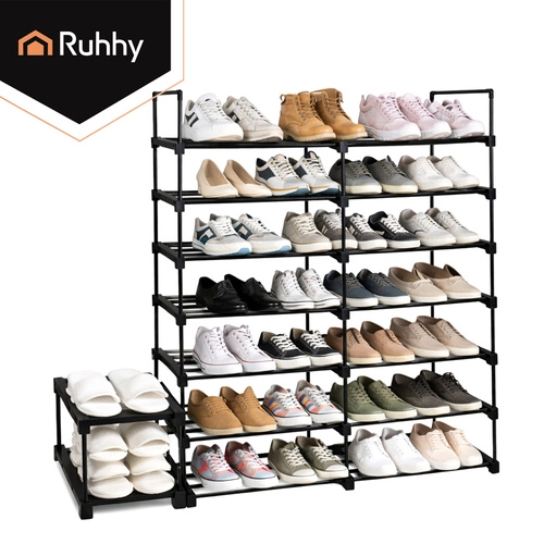 Lo scaffale è modulare: potete montarlo come un unico supporto alto o dividerlo in due unità più basse. Alcuni ripiani possono essere rimossi per scarpe più alte o scatole. Montaggio semplice senza attrezzi e manutenzione facile rendono questo supporto un pratico alleato per ingresso, cabina armadio e corridoio.
