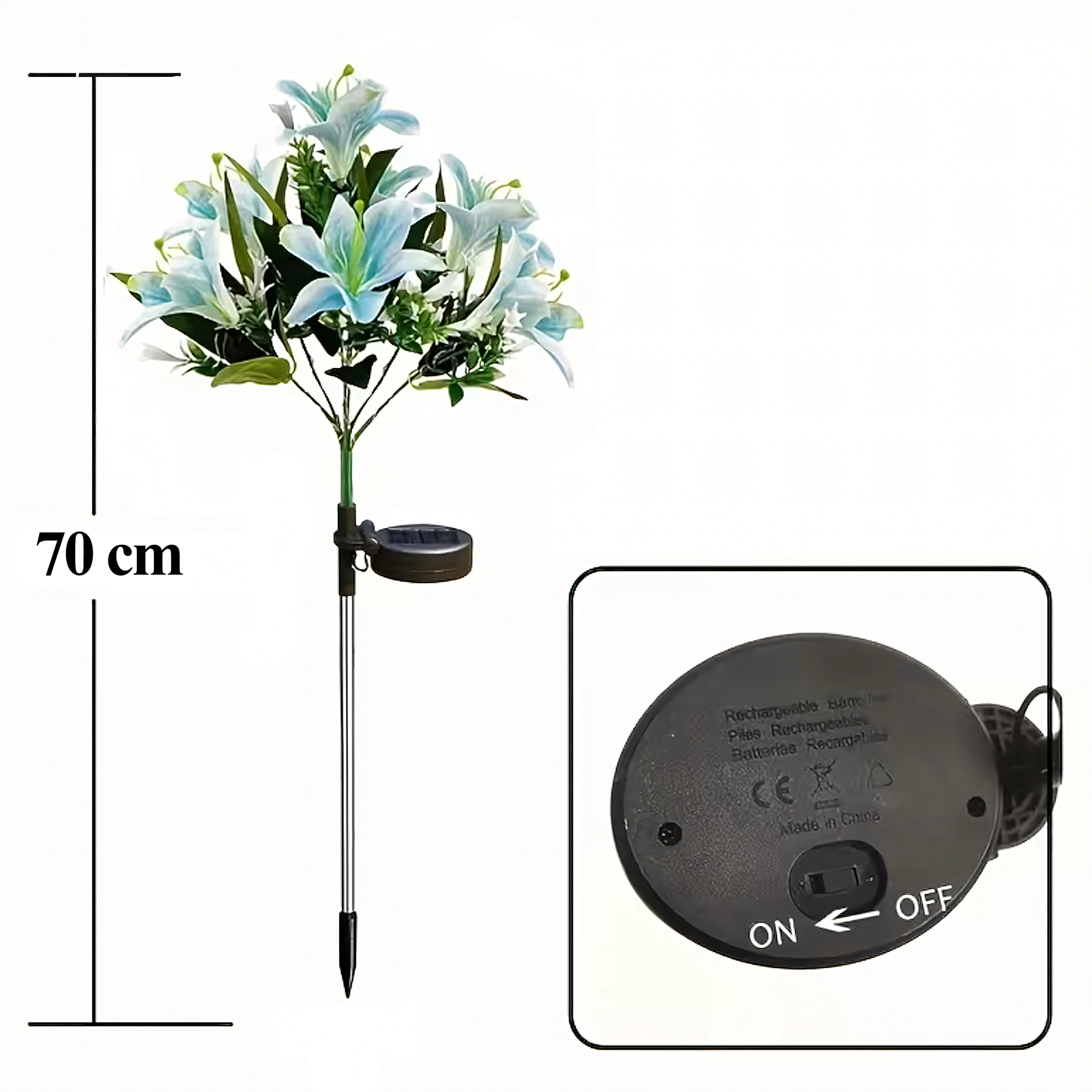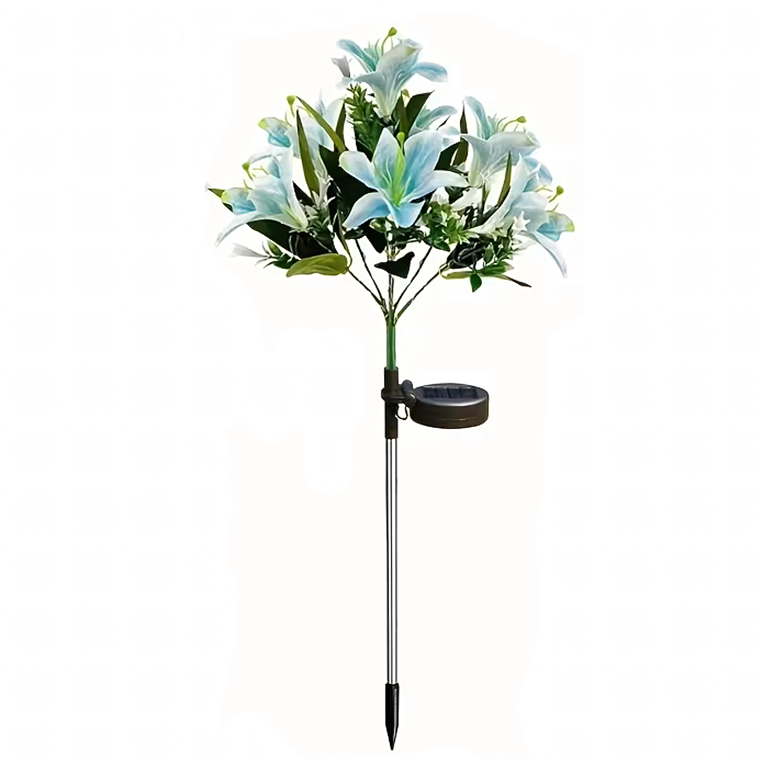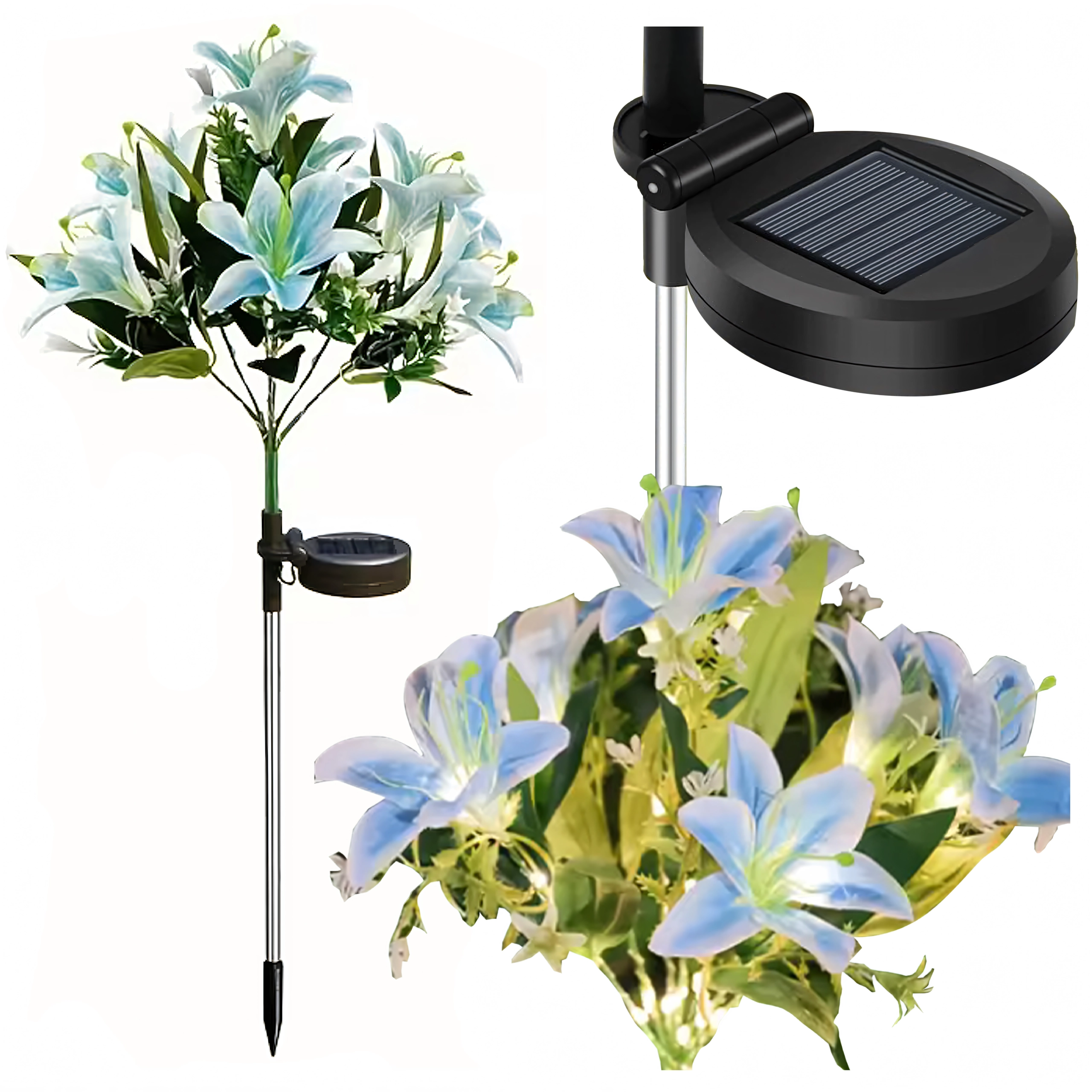 La lampada solare da giardino a forma di giglio trasforma vialetti, aiuole e terrazze in un accogliente paradiso serale. Durante il giorno il pannello solare integrato ricarica la batteria incorporata e, dopo il tramonto, i LED si accendono automaticamente per illuminare delicatamente i petali. Le foglie realistiche e i molteplici fiori su un unico stelo donano all’ambiente un aspetto naturale e decorativo senza necessità di manutenzione.
