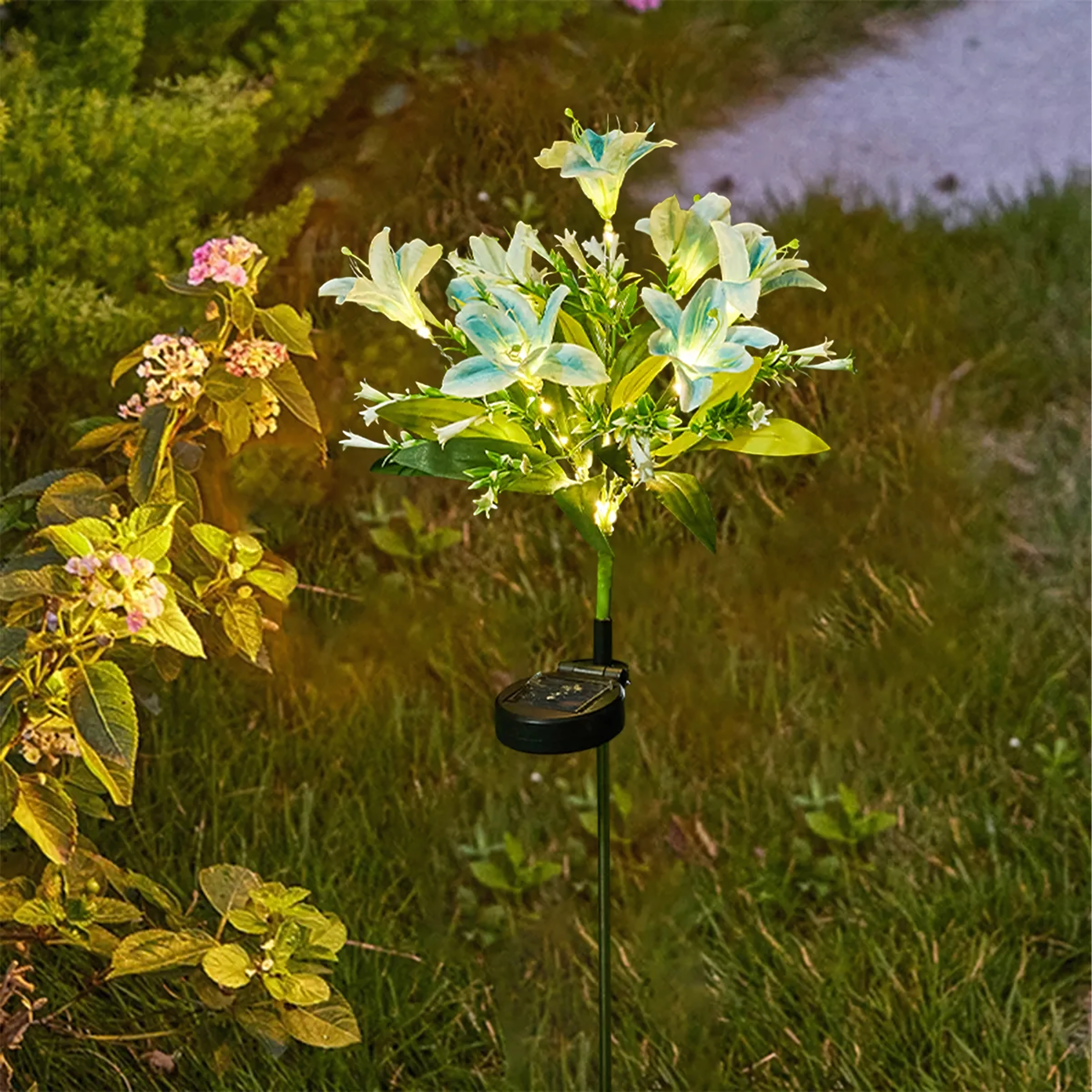 I gigli con più fiori e foglie appaiono naturali anche di giorno e, dopo il tramonto, vengono delicatamente illuminati dai LED, creando un’atmosfera accogliente in giardino o in terrazza.