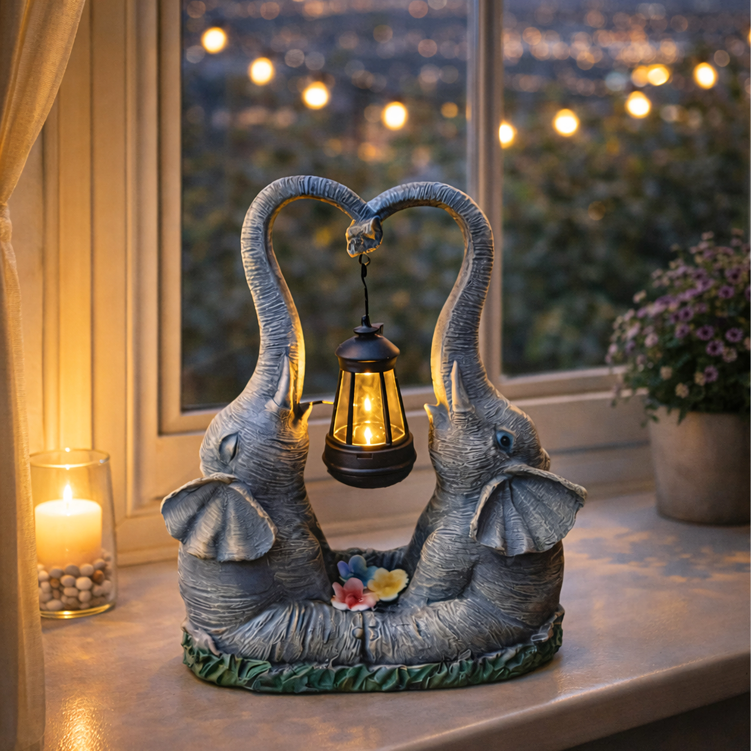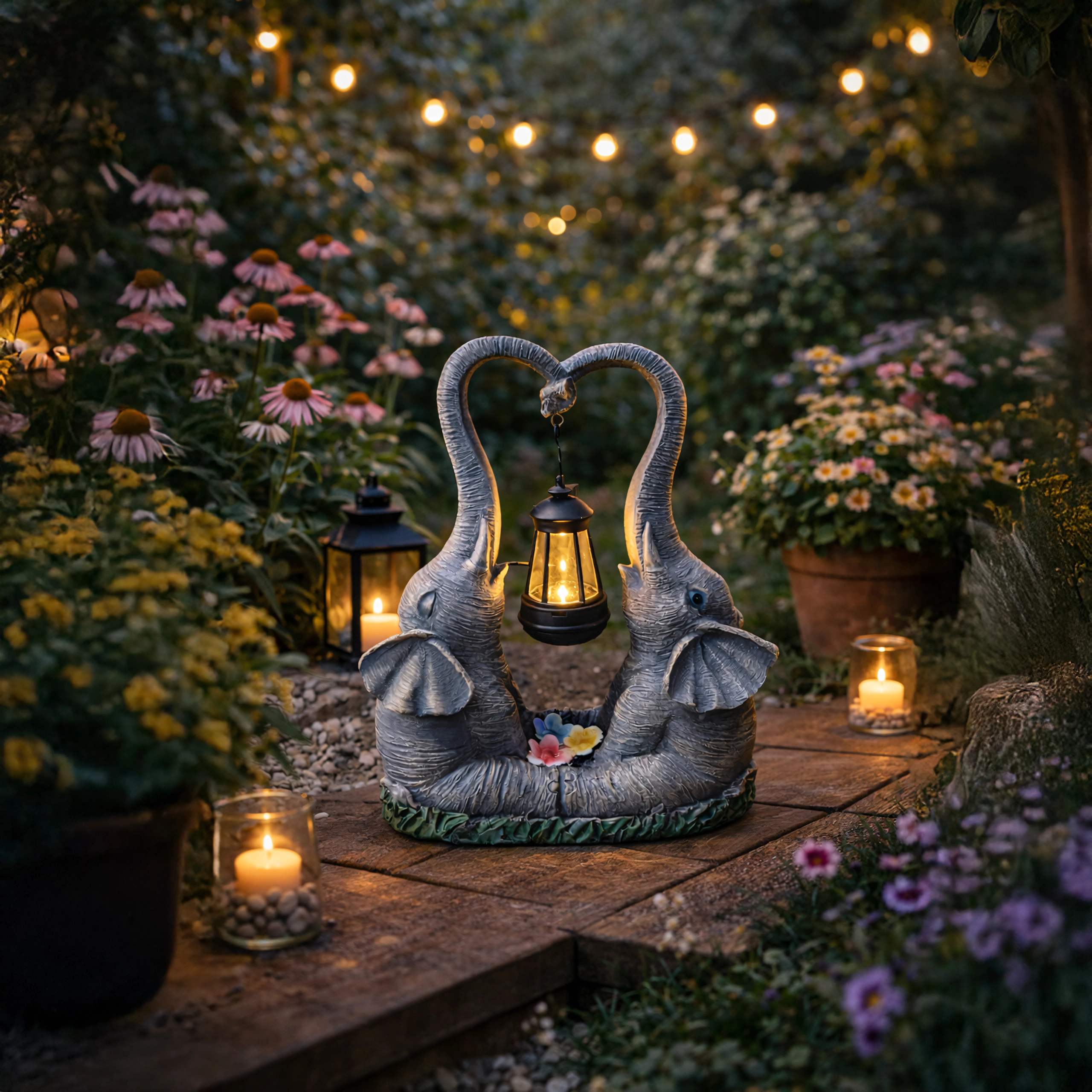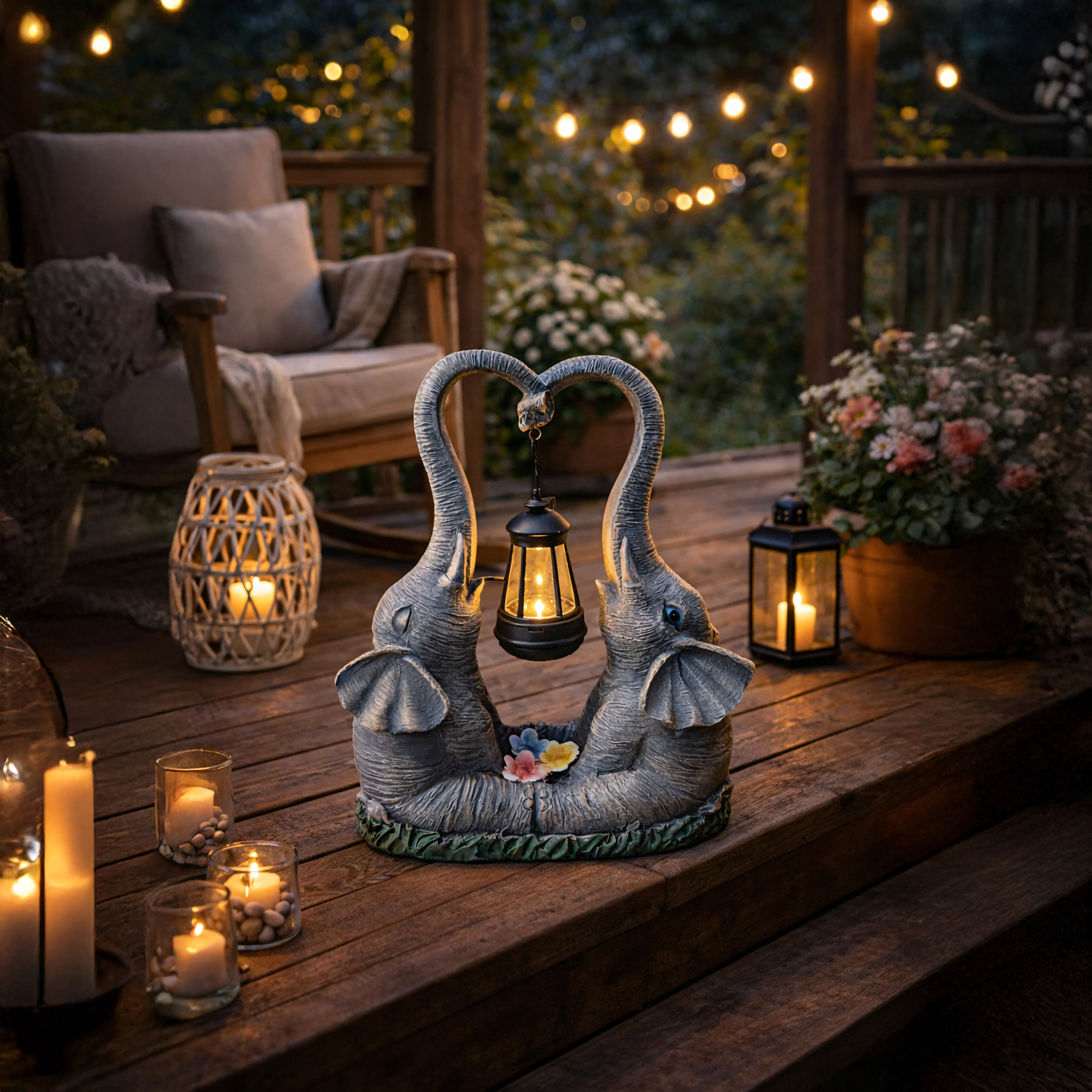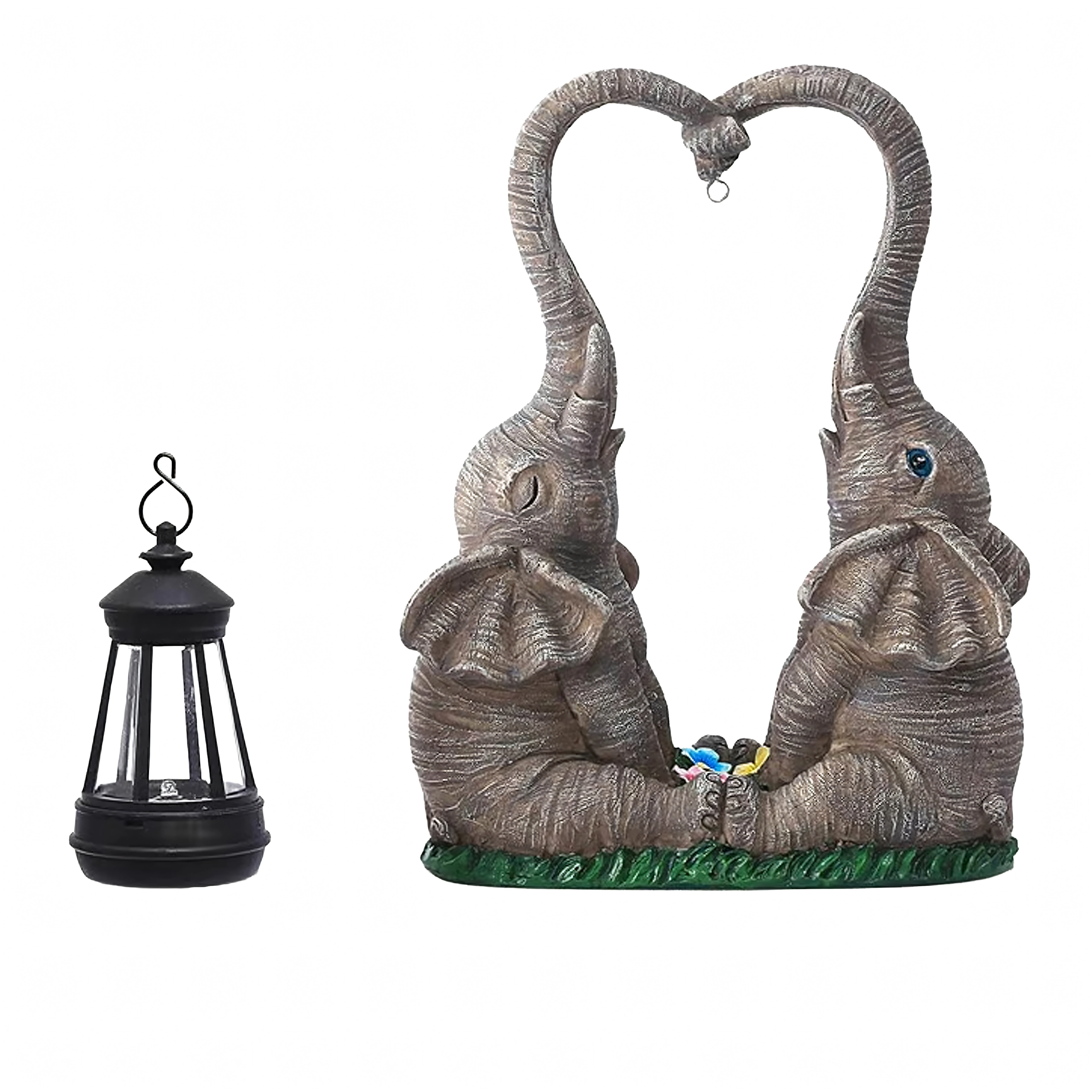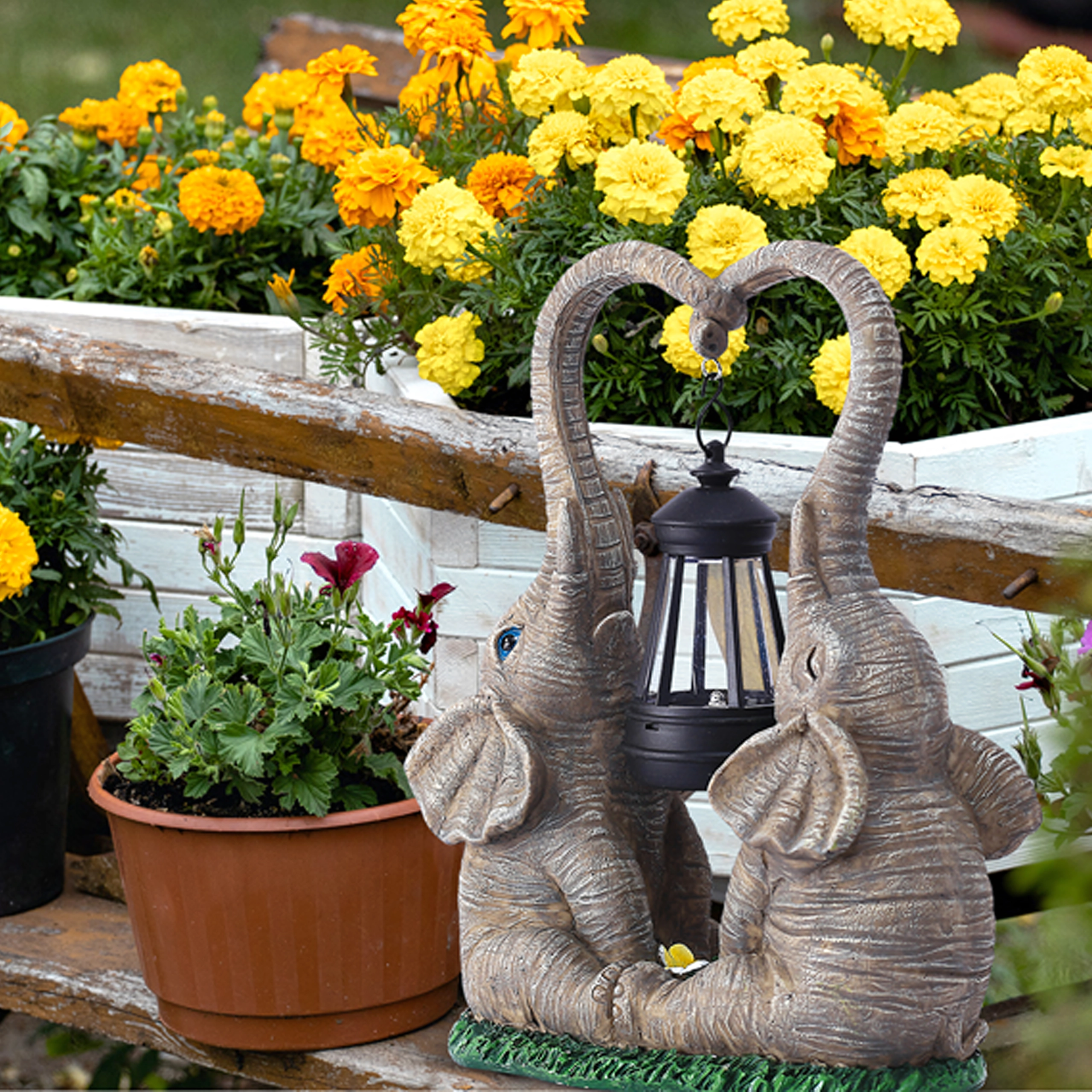 Questa lampada decorativa con due elefanti unisce il fascino di una statuina da giardino a un pratico illuminamento ambientale. La lanterna appesa tra le proboscidi diffonde una luce calda che valorizza aiuole fiorite, davanzali e aree relax all’aperto.